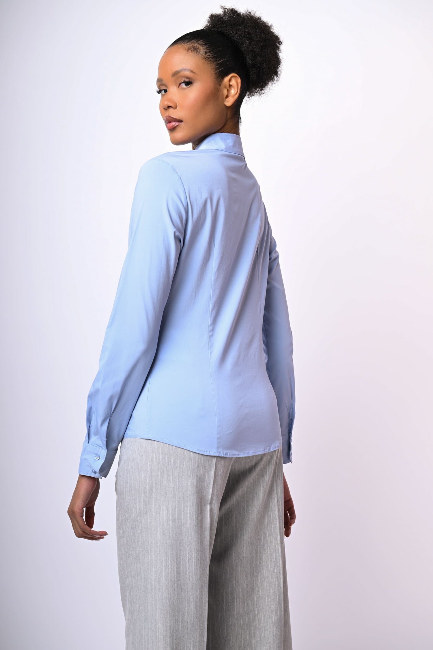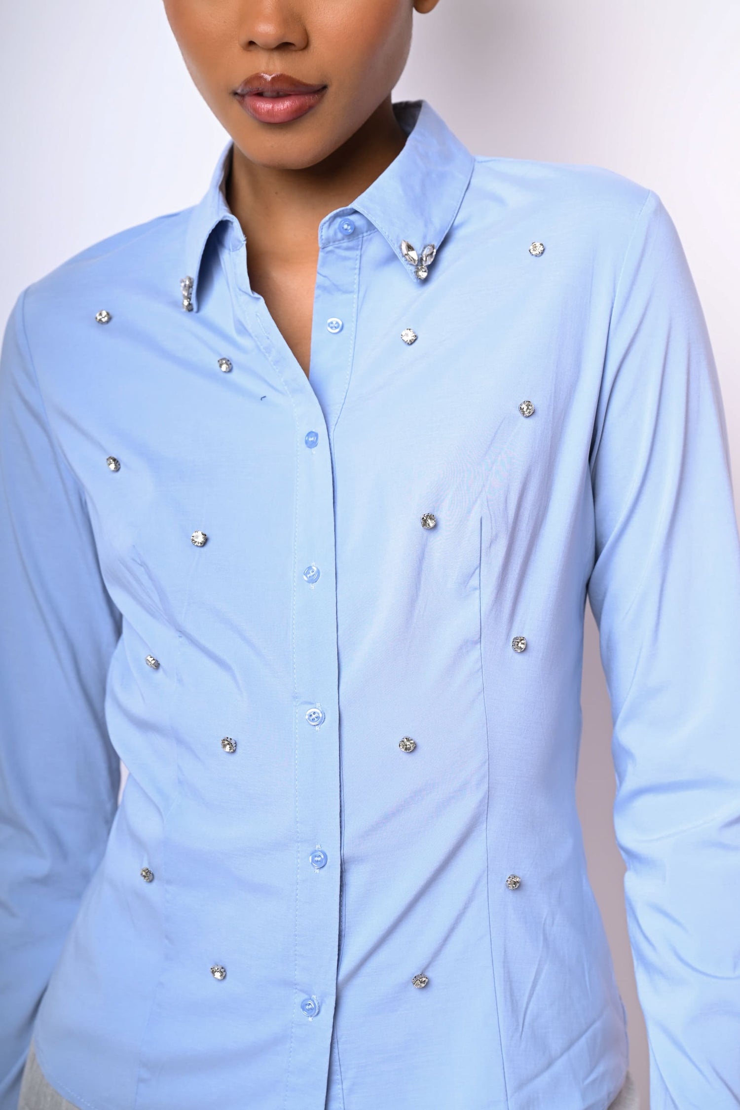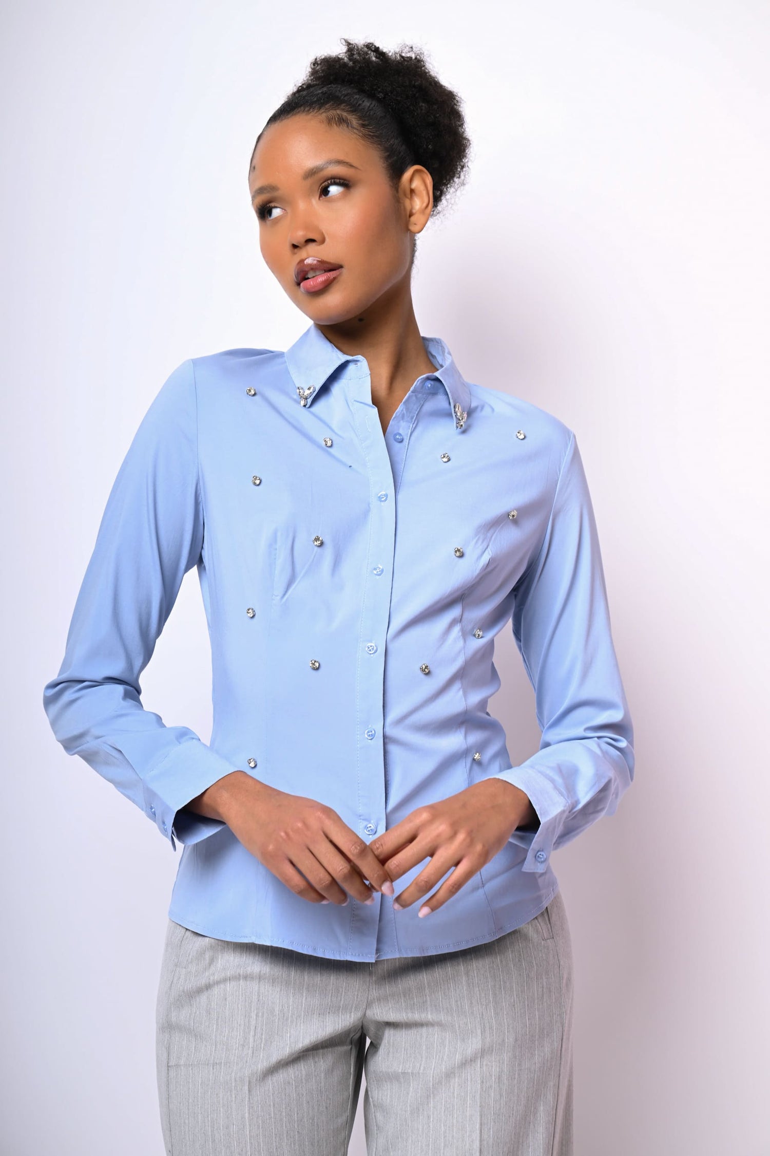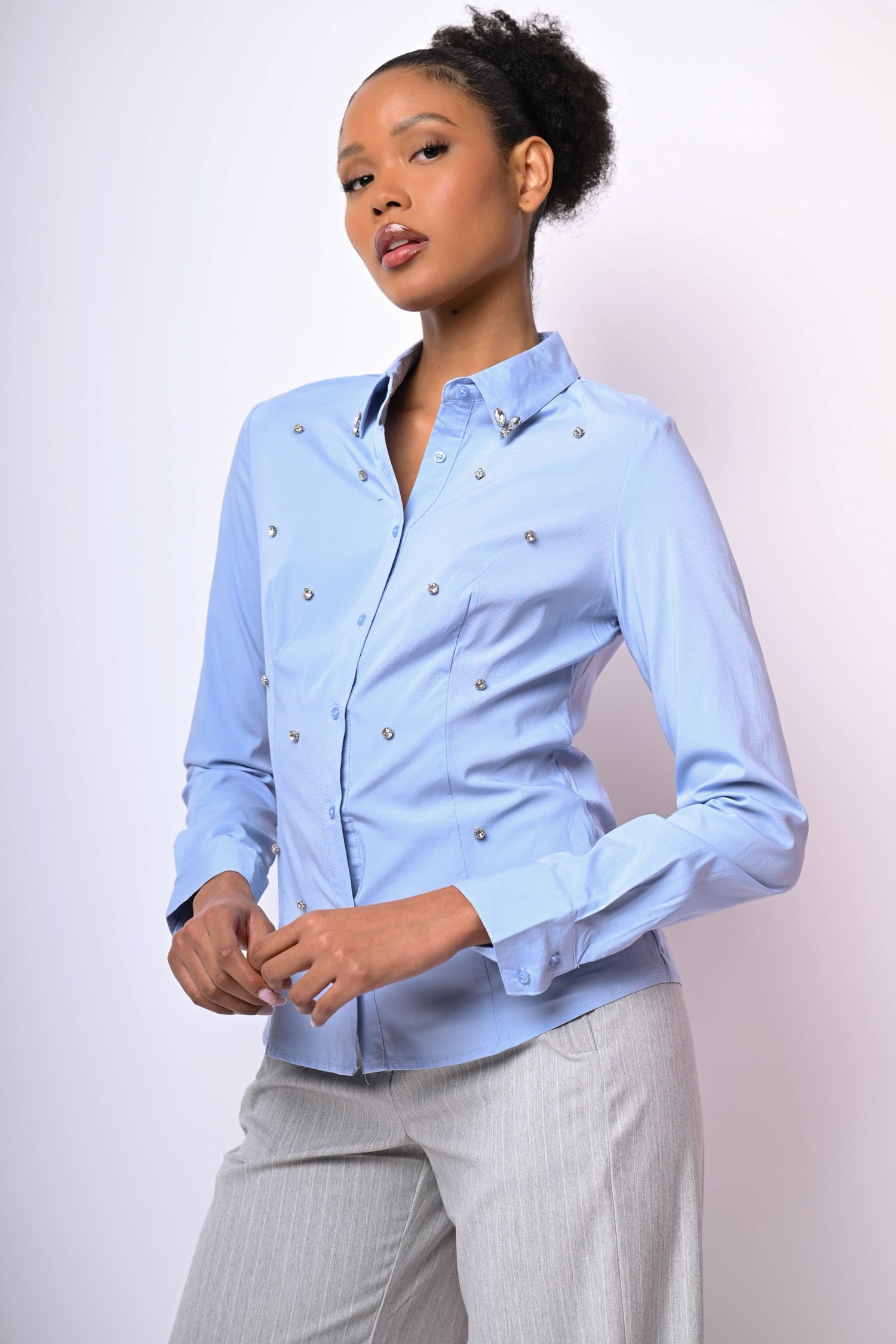 Camicia slim-fit misto cotone stretch azzurro con decorazione strass sul colletto a punta e sul davanti, abbottonatura frontale e ai polsini e orlo stondato.
