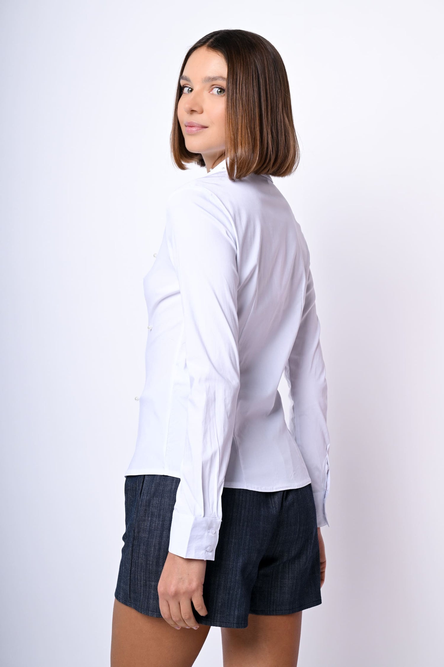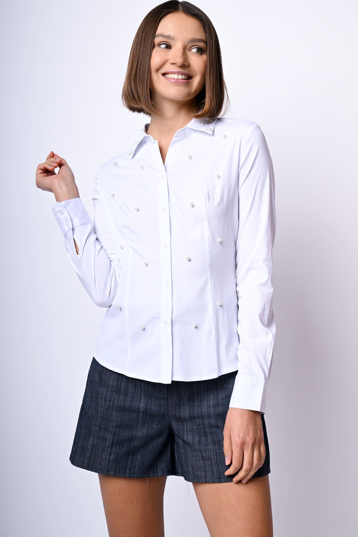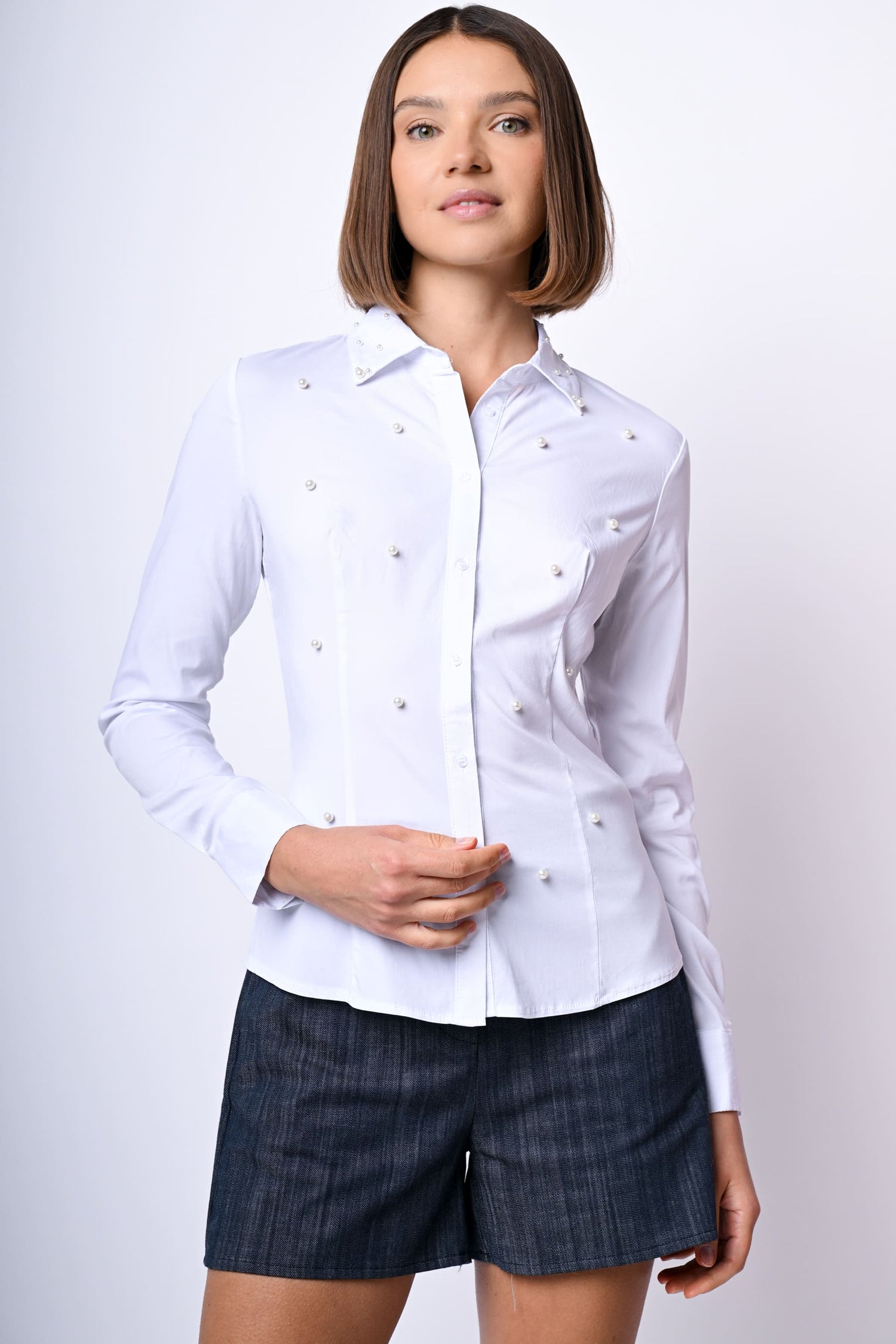 Camicia slim-fit misto cotone stretch bianco con perle decorative sul colletto a unta e sul davanti, abbottonatura frontale e ai polsini e orlo stondato.