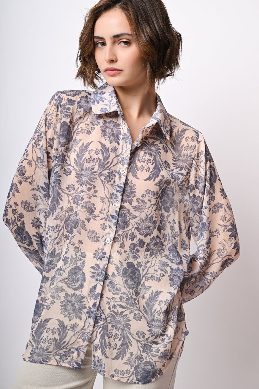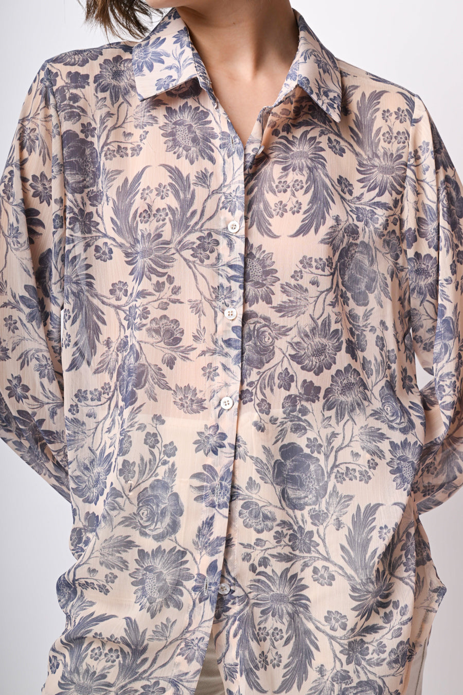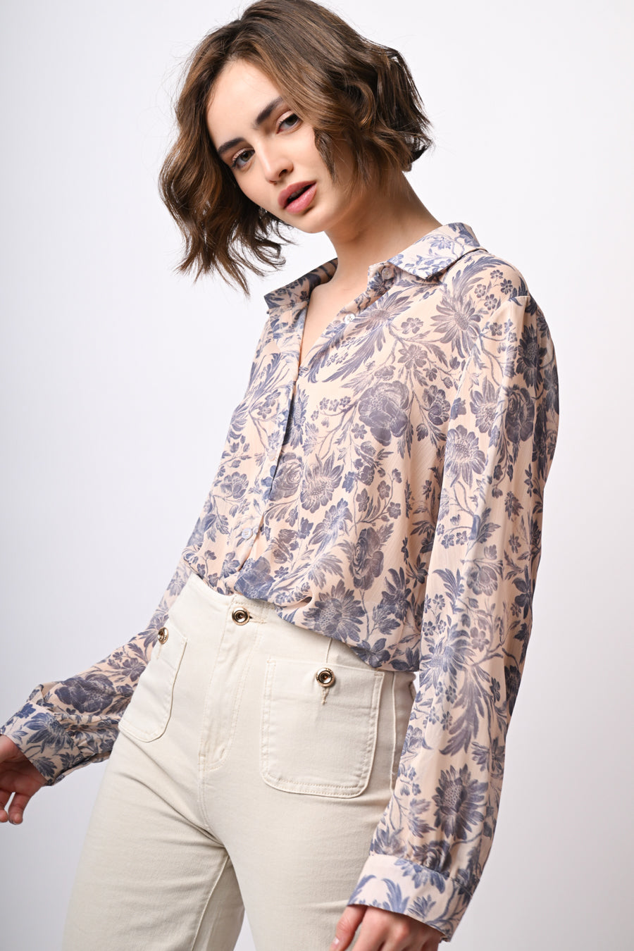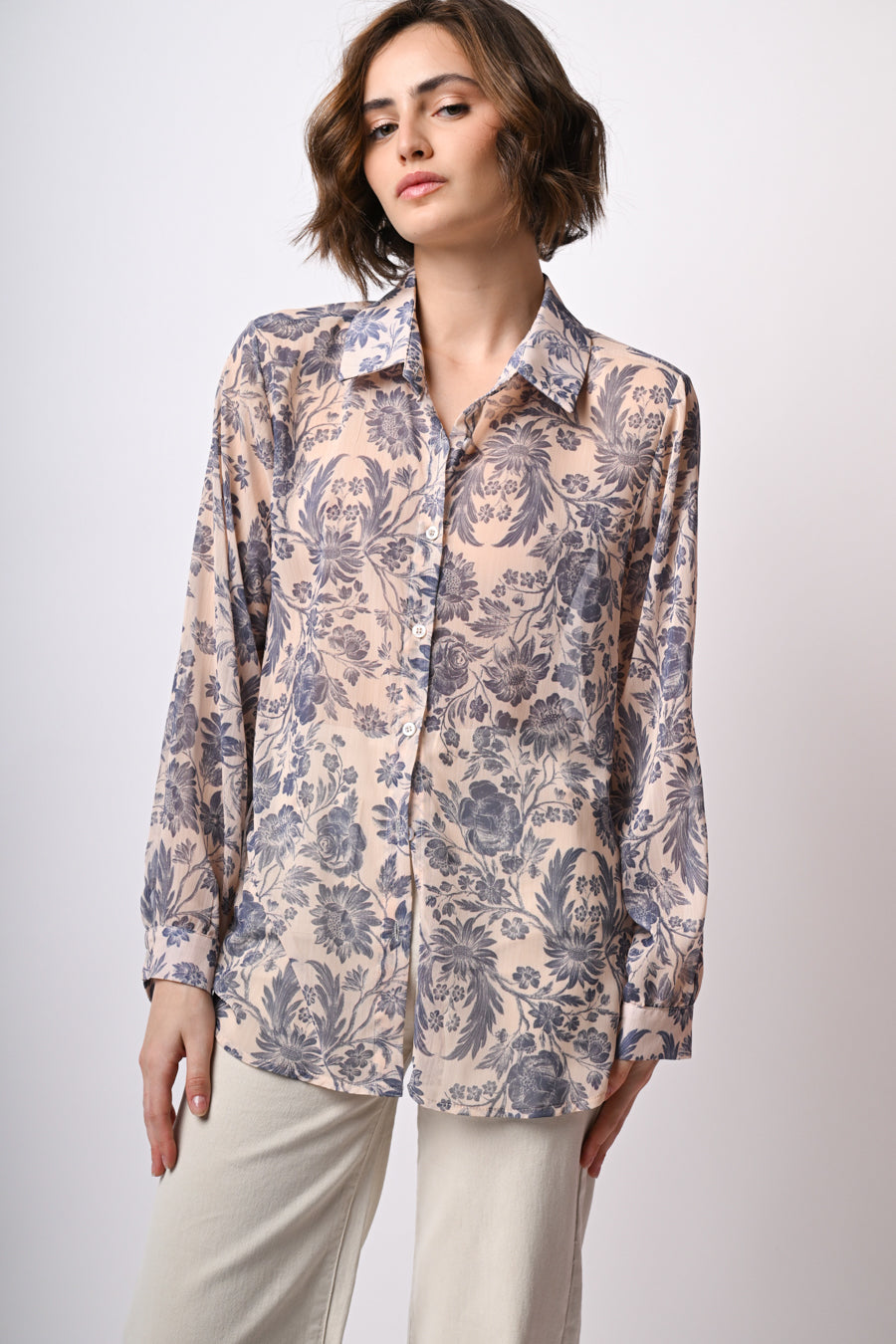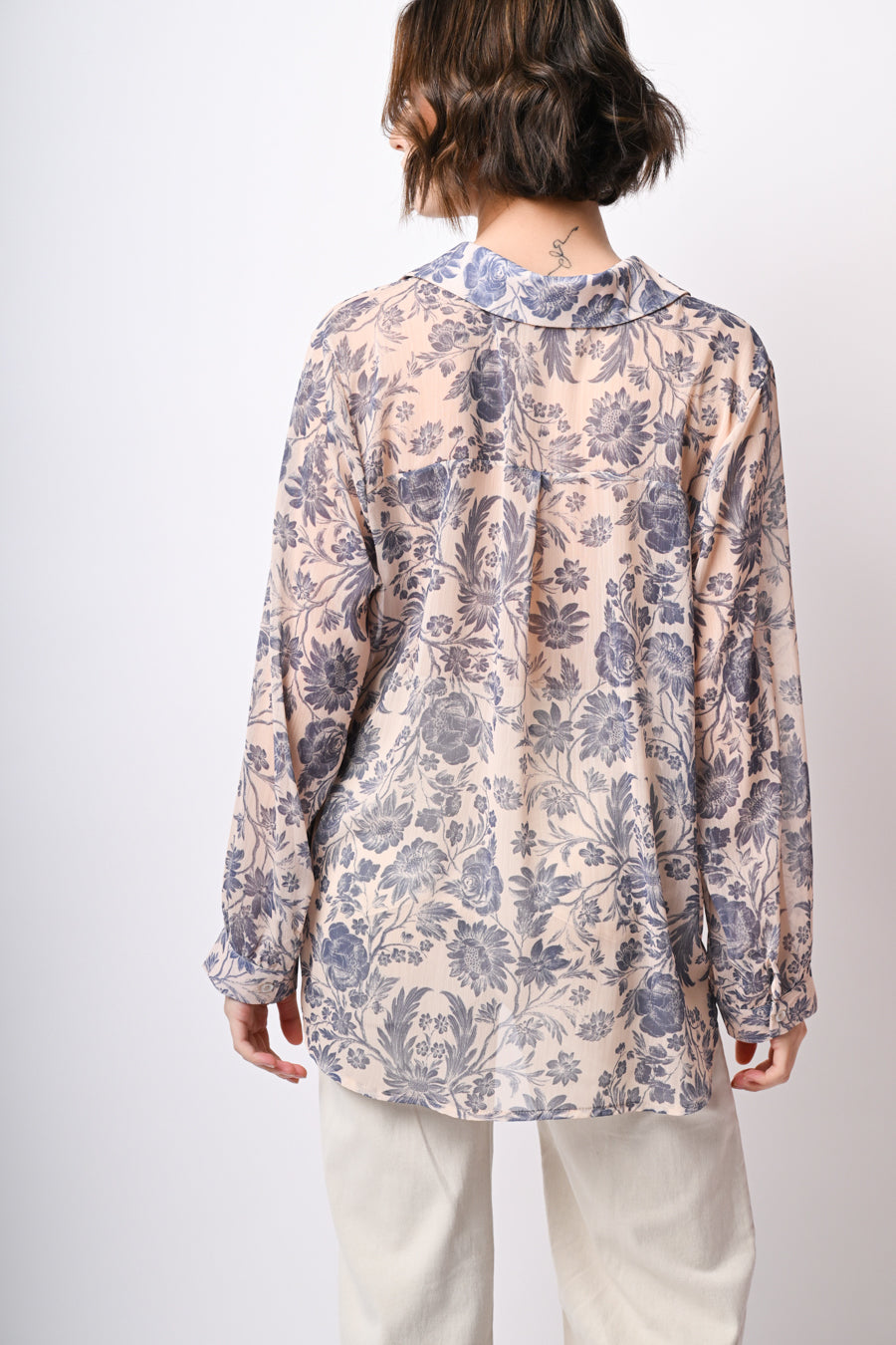 Camicia in georgette leggermente trasparente con stampa floreale in stile Art Nouveau nei toni del blu e grigio su fondo nude, colletto a punta, abbottonatura frontale e ai polsini e orlo stondato.