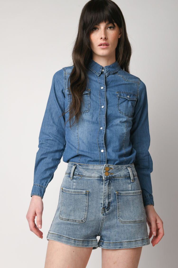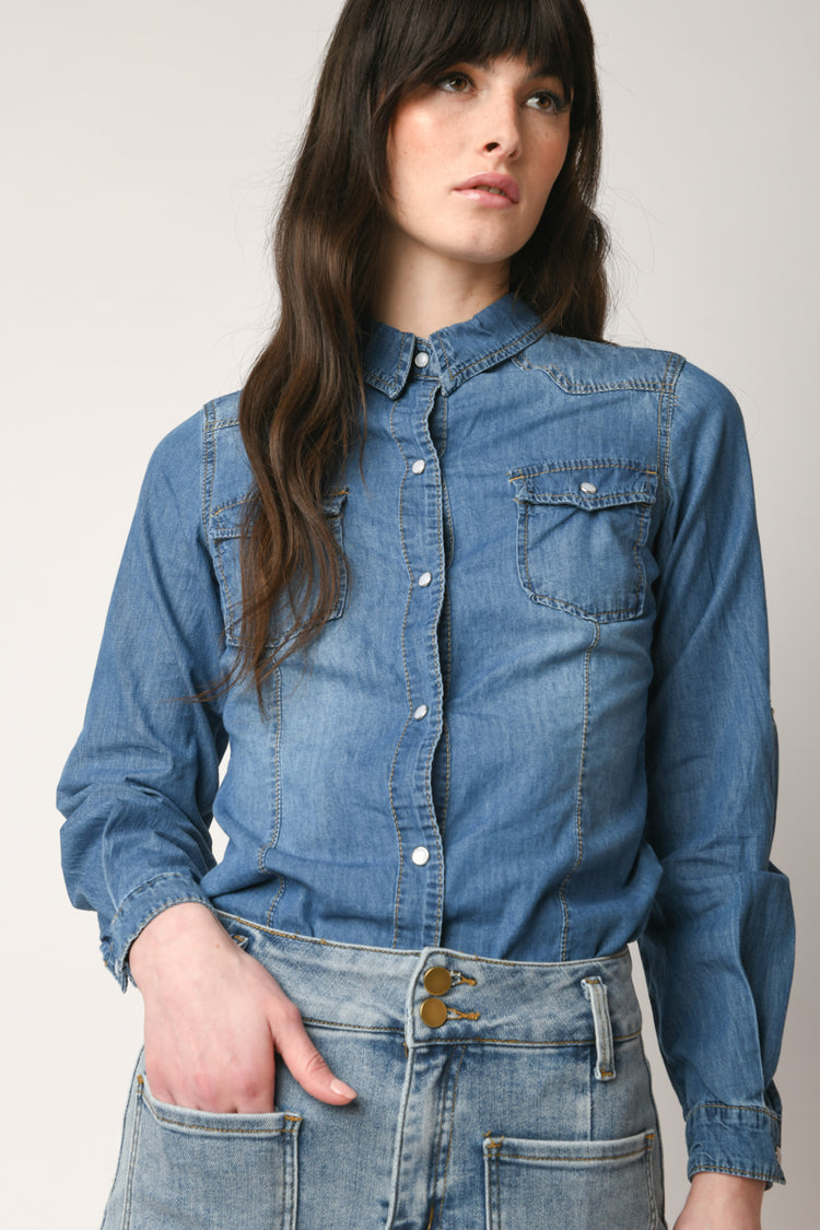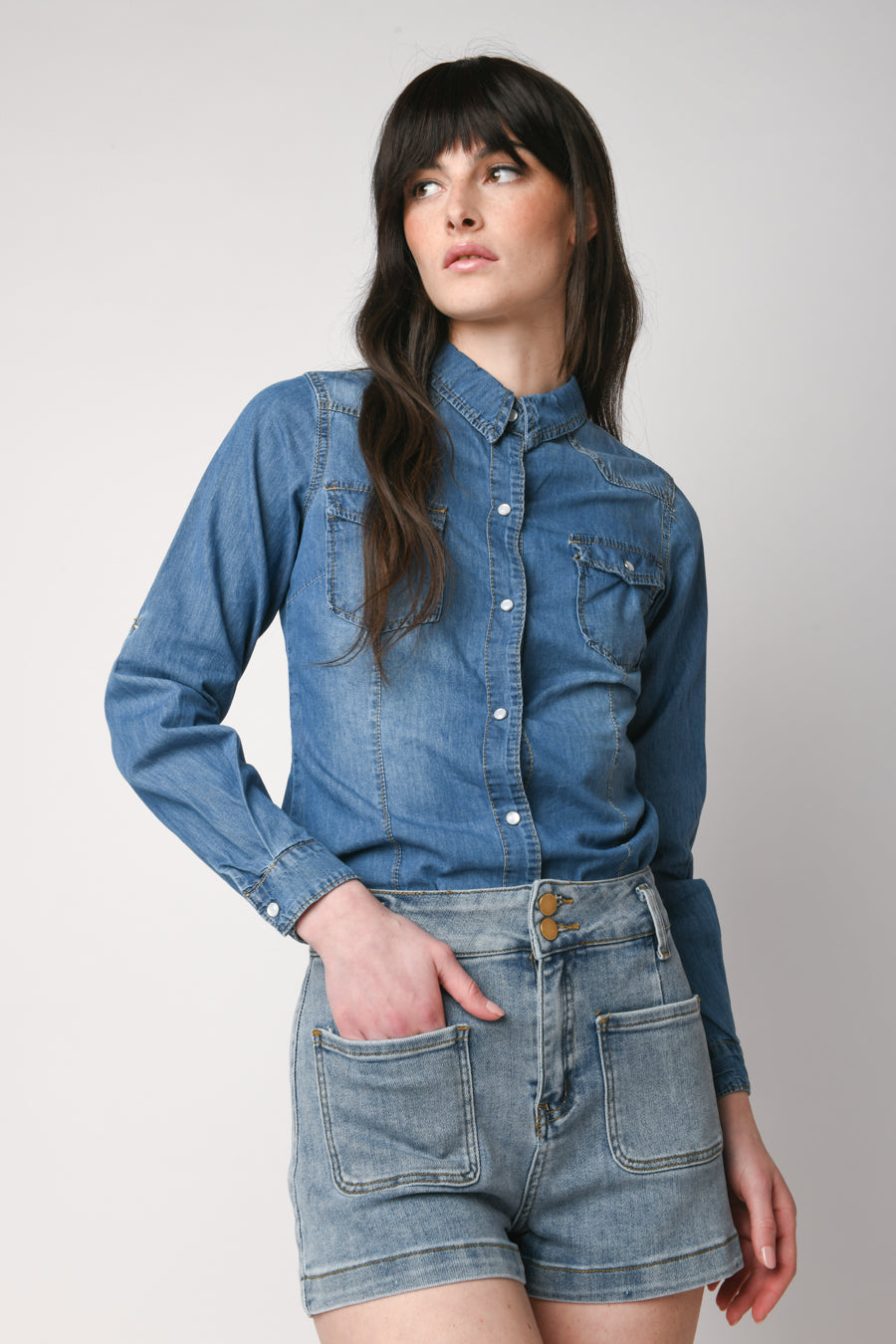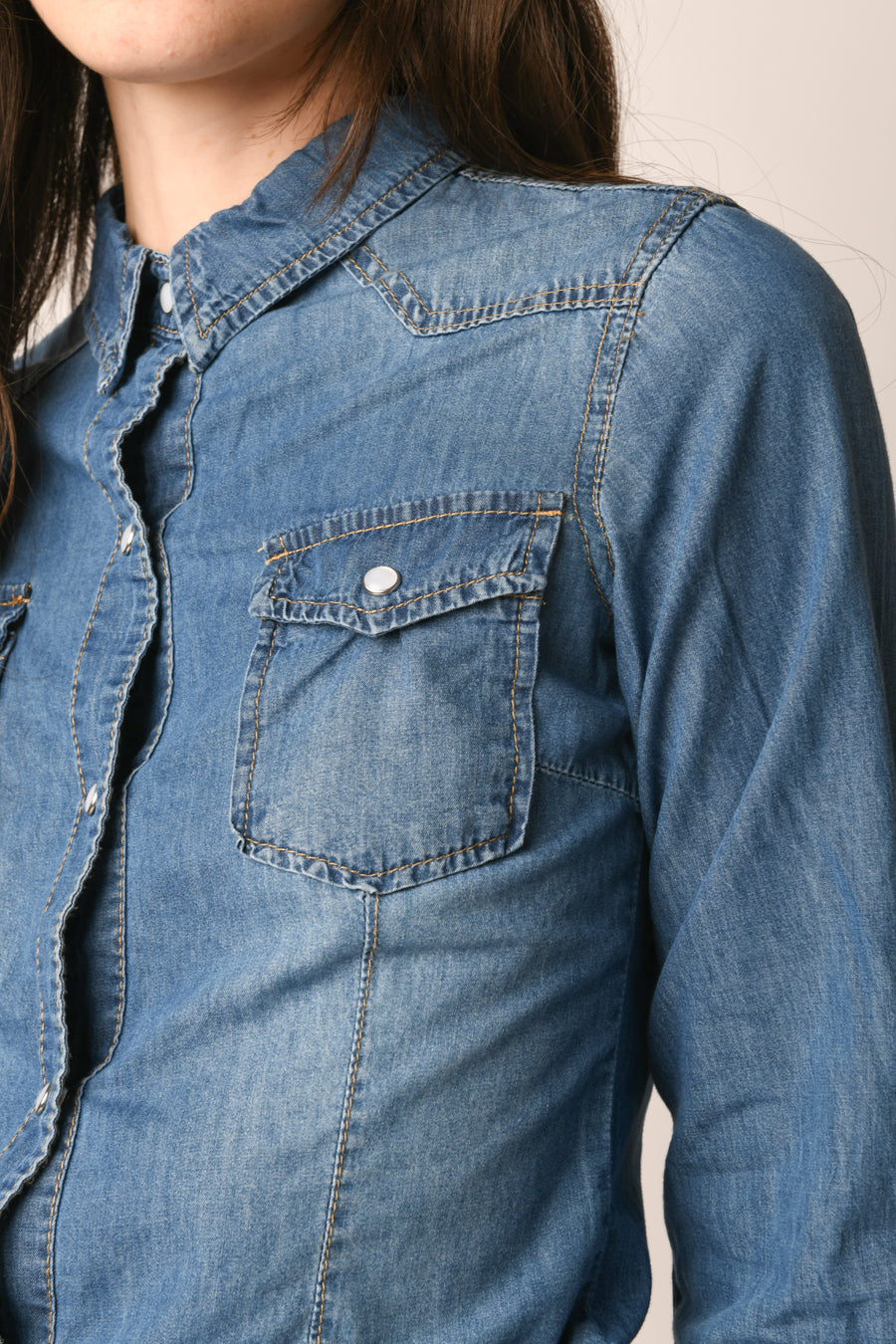 Camicia in denim di cotone blu con colletto a punta, abbottonatura frontale e ai polsini, taschini sul petto con risvolto e bottoni e orlo stondato.
