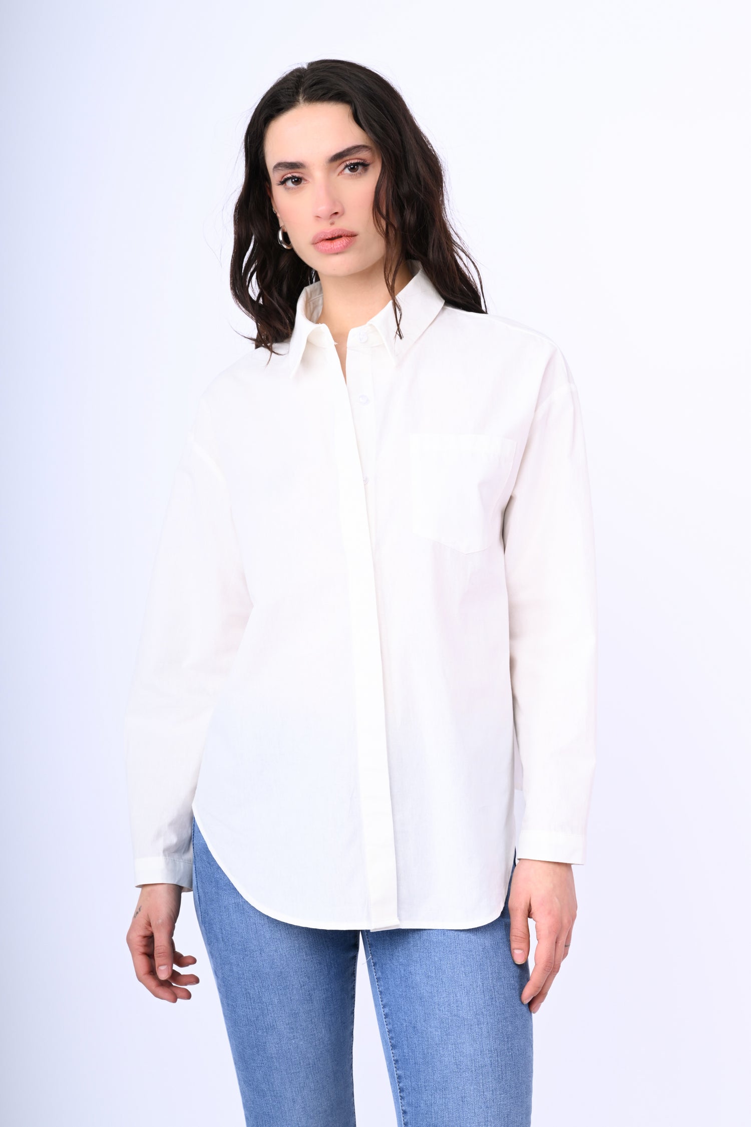 Camicia oversize in cotone bianco con colletto a punta, abbottonatura frontale e ai polsini, taschino sul petto e orlo stondato.