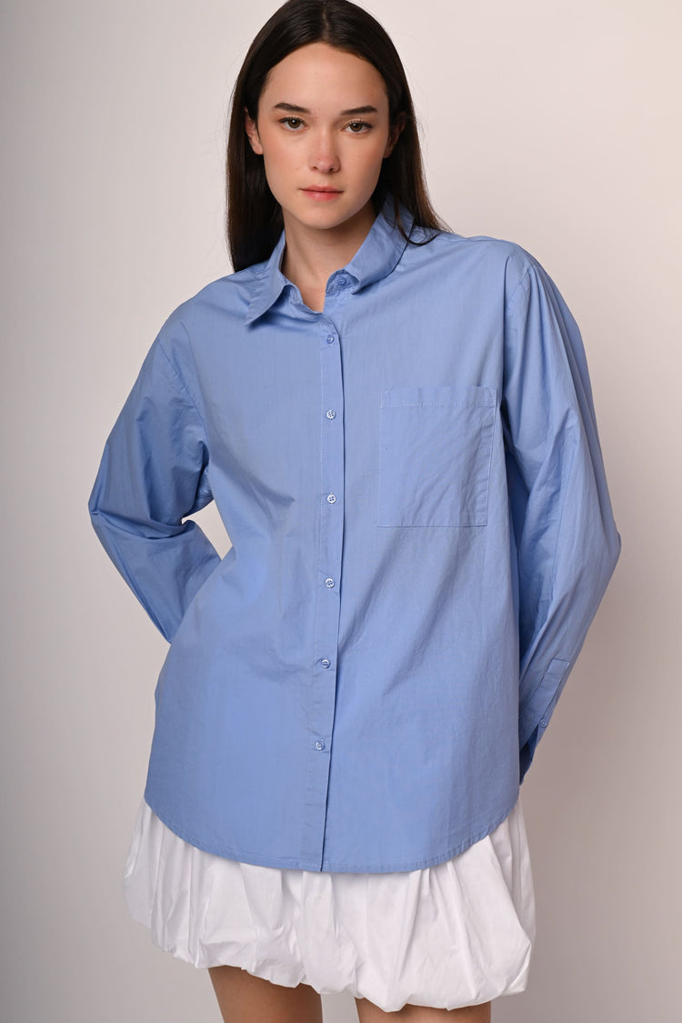 Camicia oversize in cotone azzurro con colletto a punta, abbottonatura frontale e ai polsini, spalle scese, taschino sul petto e orlo stondato.