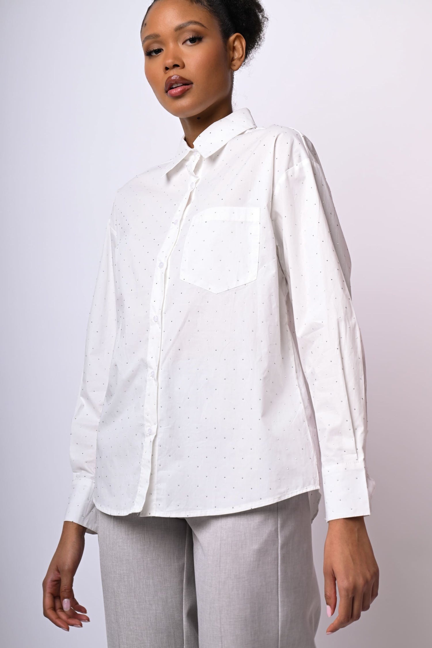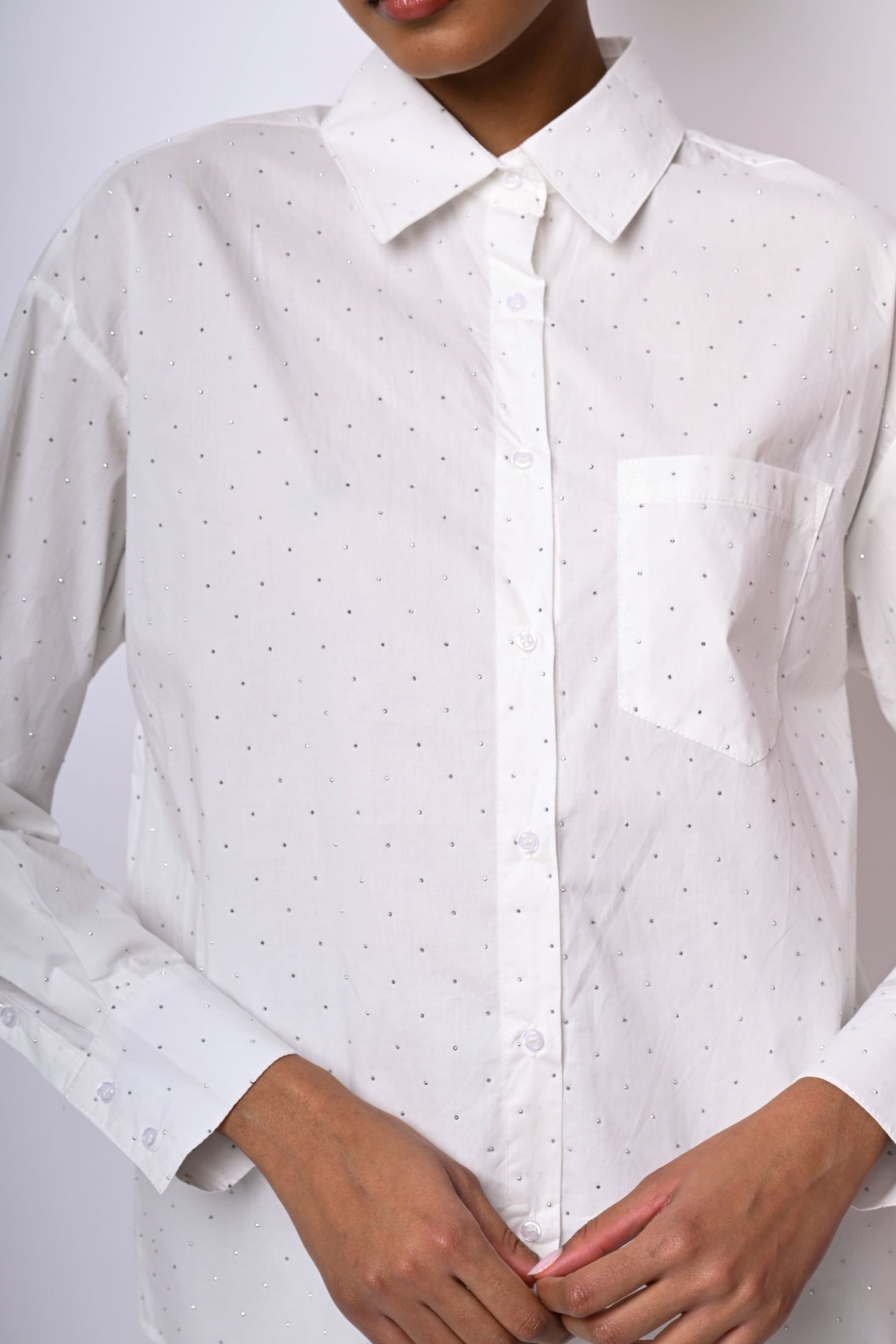 Camicia in cotone bianco con mini borchie decorative all-over, colletto a punta, abbottonatura frontale e ai polsini, spalle scese, taschino sul petto e orlo stondato.