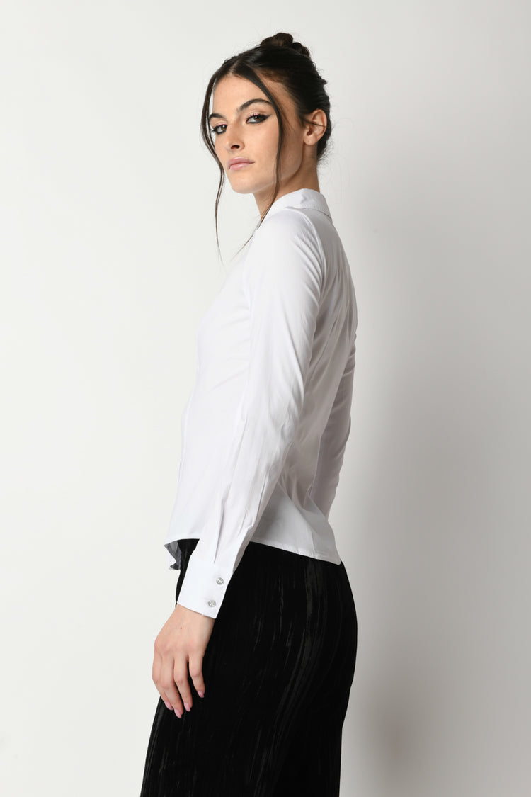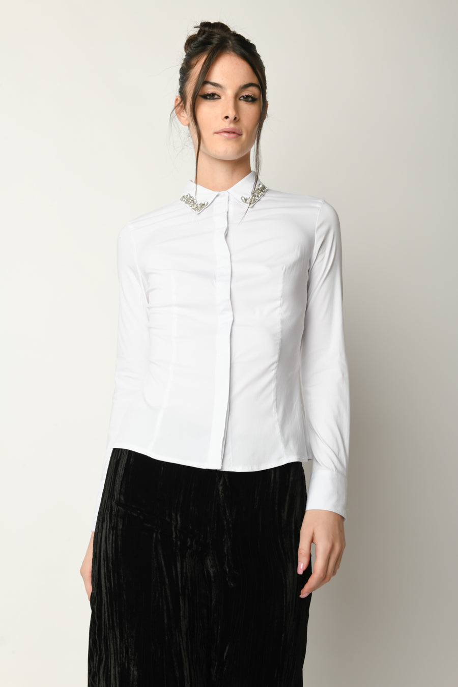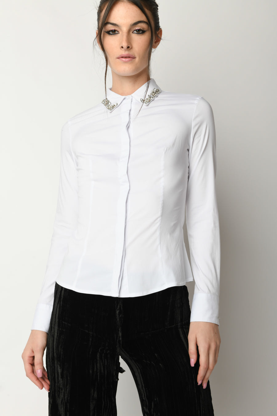 Camicia in misto cotone stretch bianco con colletto a punta impreziosito da cristalli, abbottonatura frontale e ai polsini, orlo stondato e silhouette aderente.
