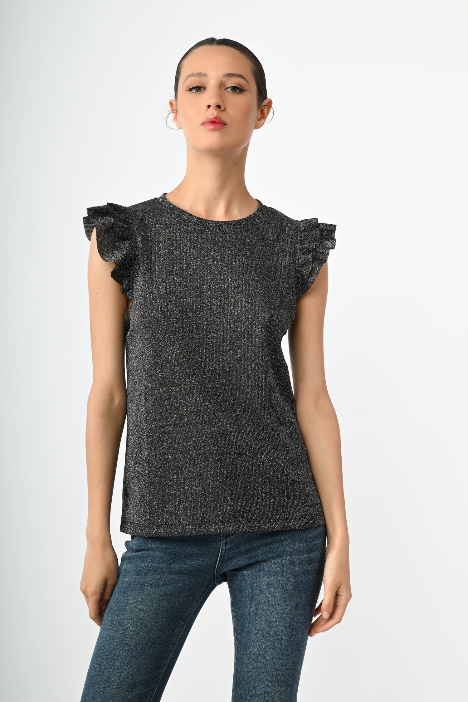 Top smanicato in maglia lurex stretch a costine nero argento con scollo tondo, volants lungo il giromanica e taglio dritto.