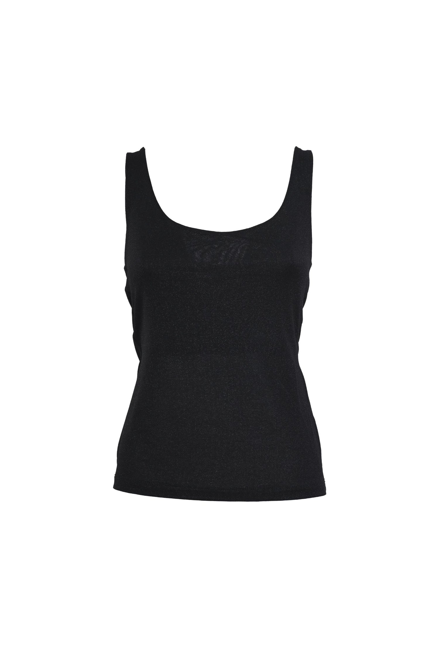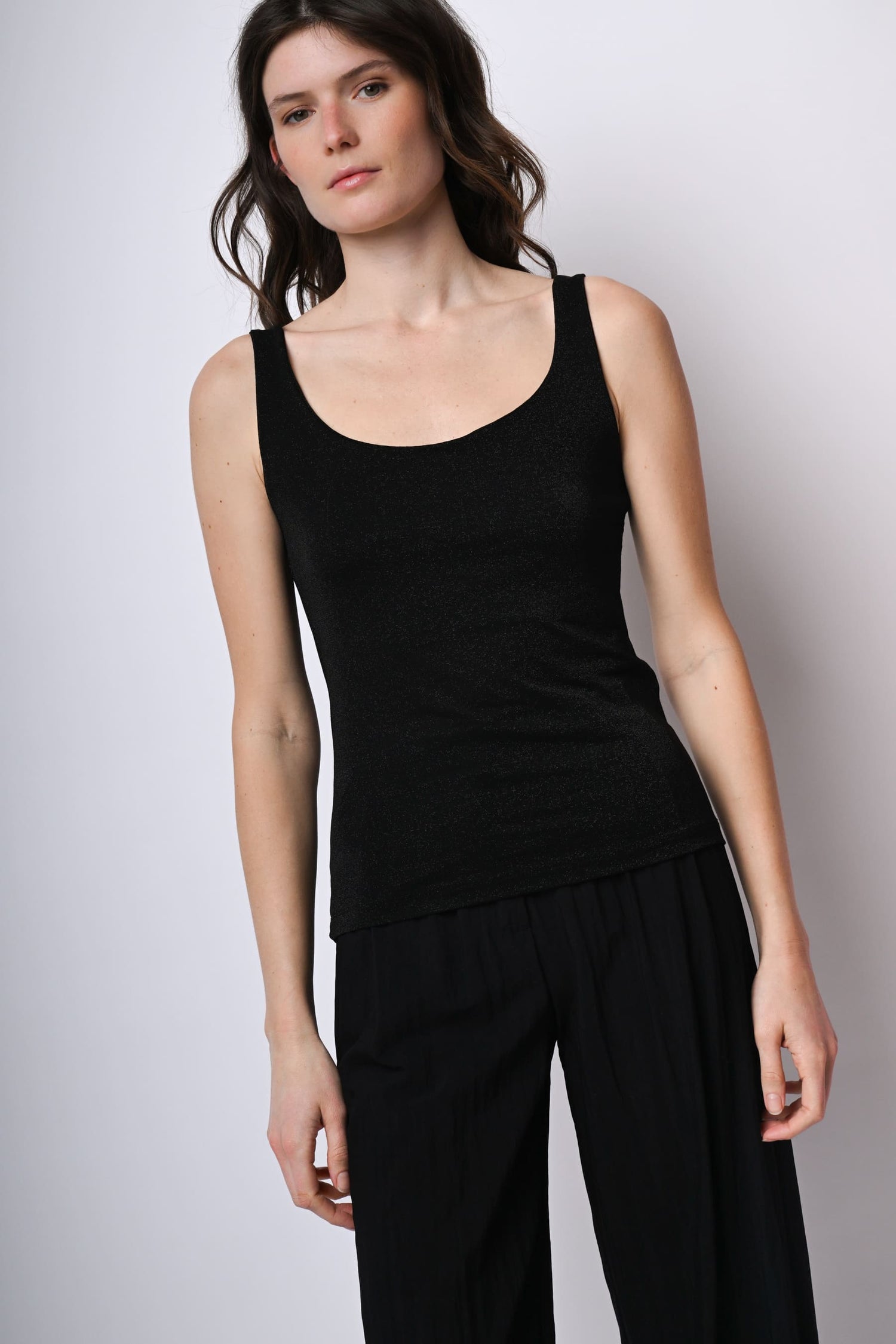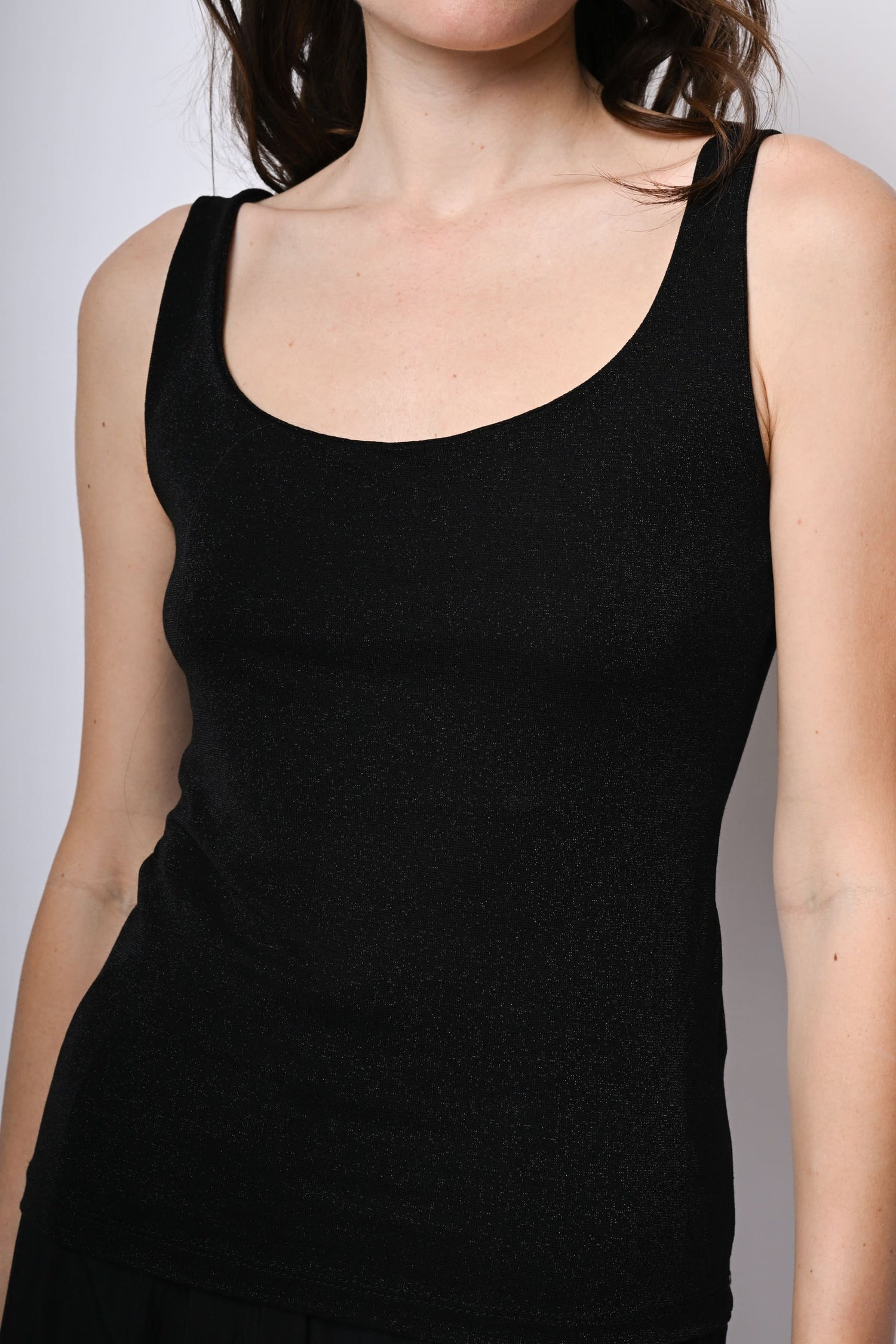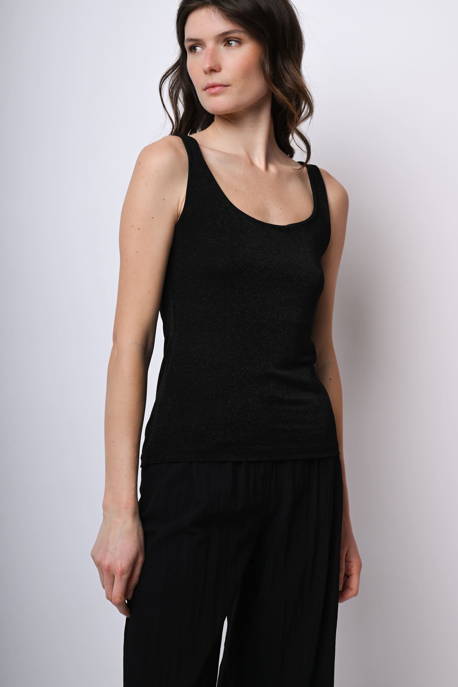 Canotta in maglia lurex misto viscosa nera con ampio scollo tondo e silhouette aderente.