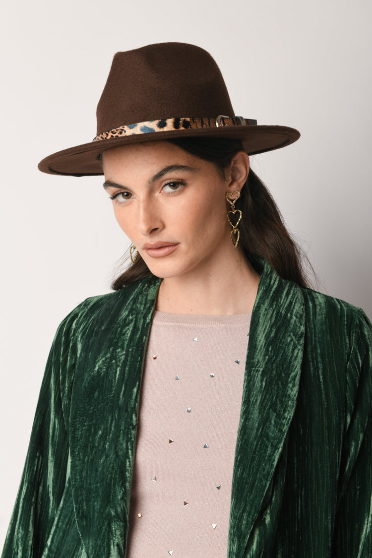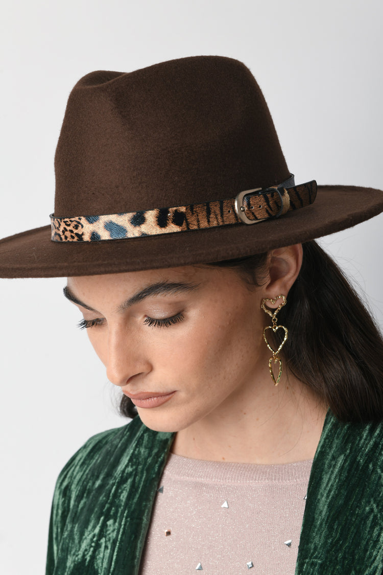 Cappello stile fedora in feltro marrone con cinturino in similpelle a stampa leopardata.