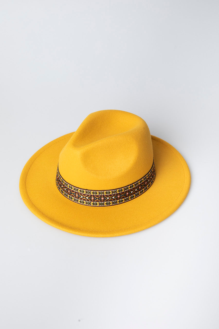 Cappello a tesa media in feltro giallo con cinturino etnico multicolor.