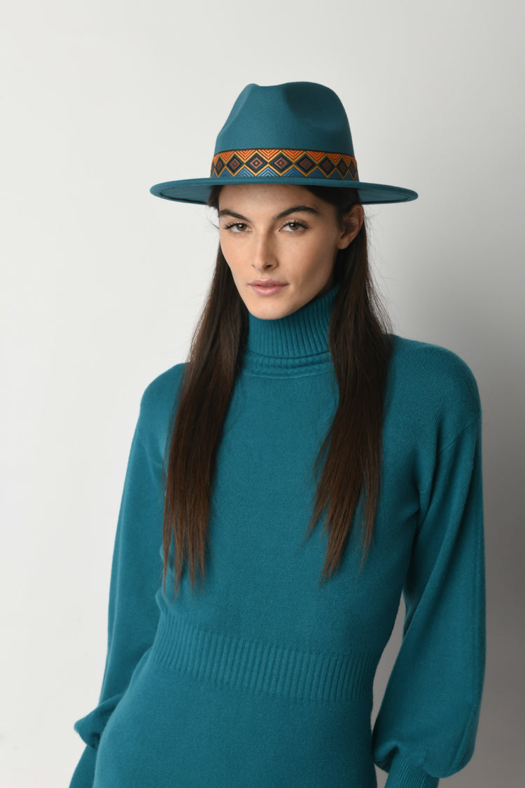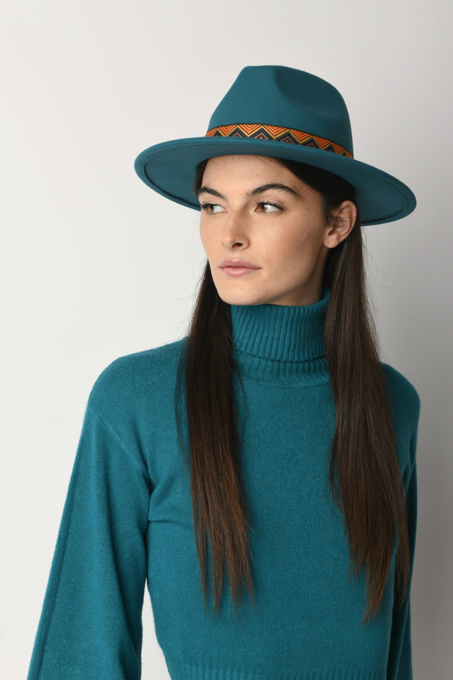Cappello in feltro a tesa larga con cinturino decorativo a motivi etnici multicolor.