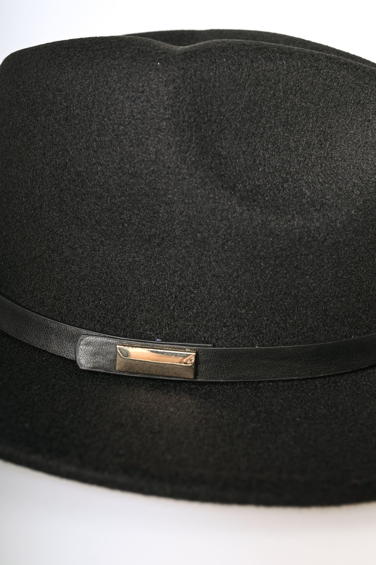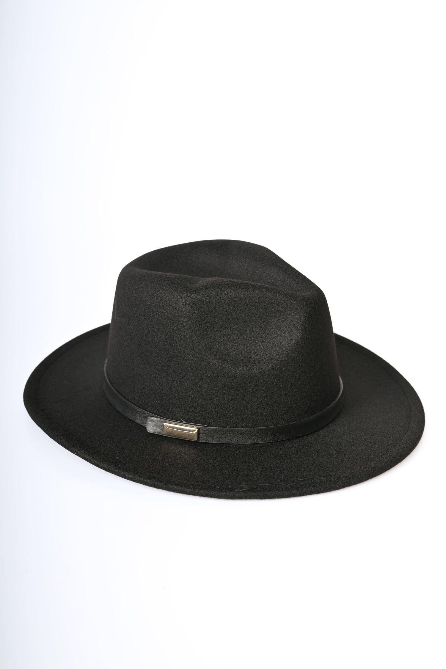 Cappello fedora in feltro nero con falda media e cinturino in similpelle tono su tono con fibbia dorata.