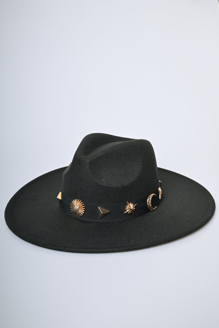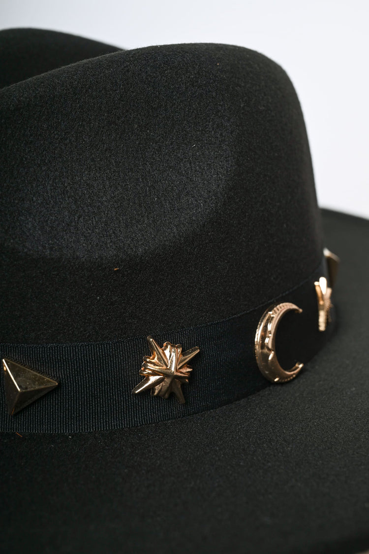 Cappello Fedora in feltro nero con nastro in grosgrain tono su tono impreziosito da decorazioni gioiello in metallo dorato.