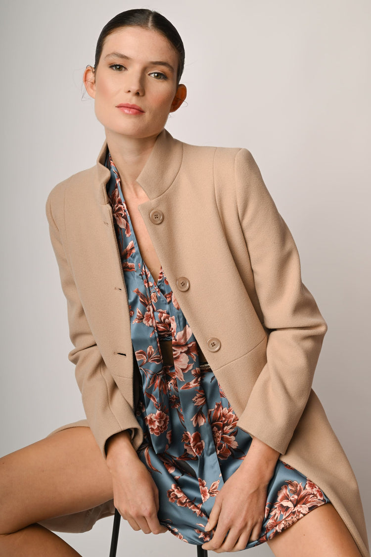 Cappotto sagomato in tessuto beige con colletto alla coreana, chiusura monopetto con bottoni, taglio in vita e tasche laterali.