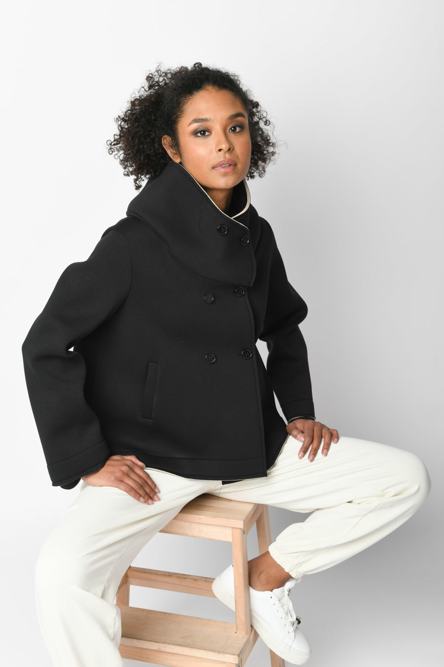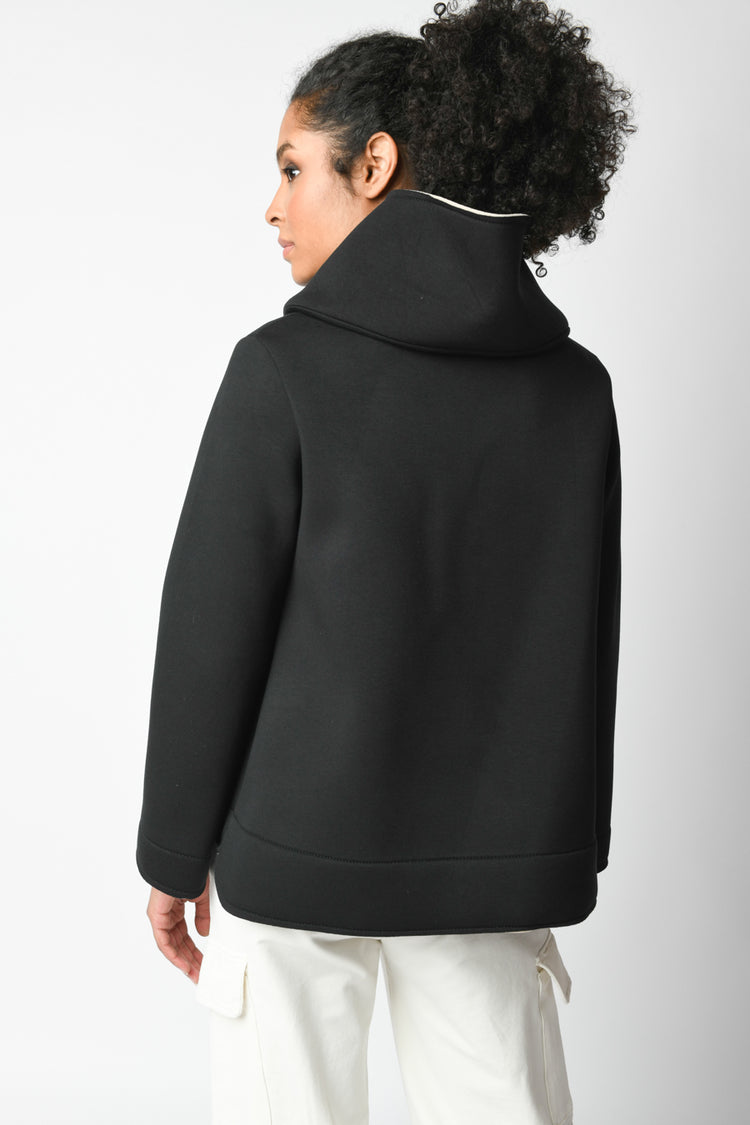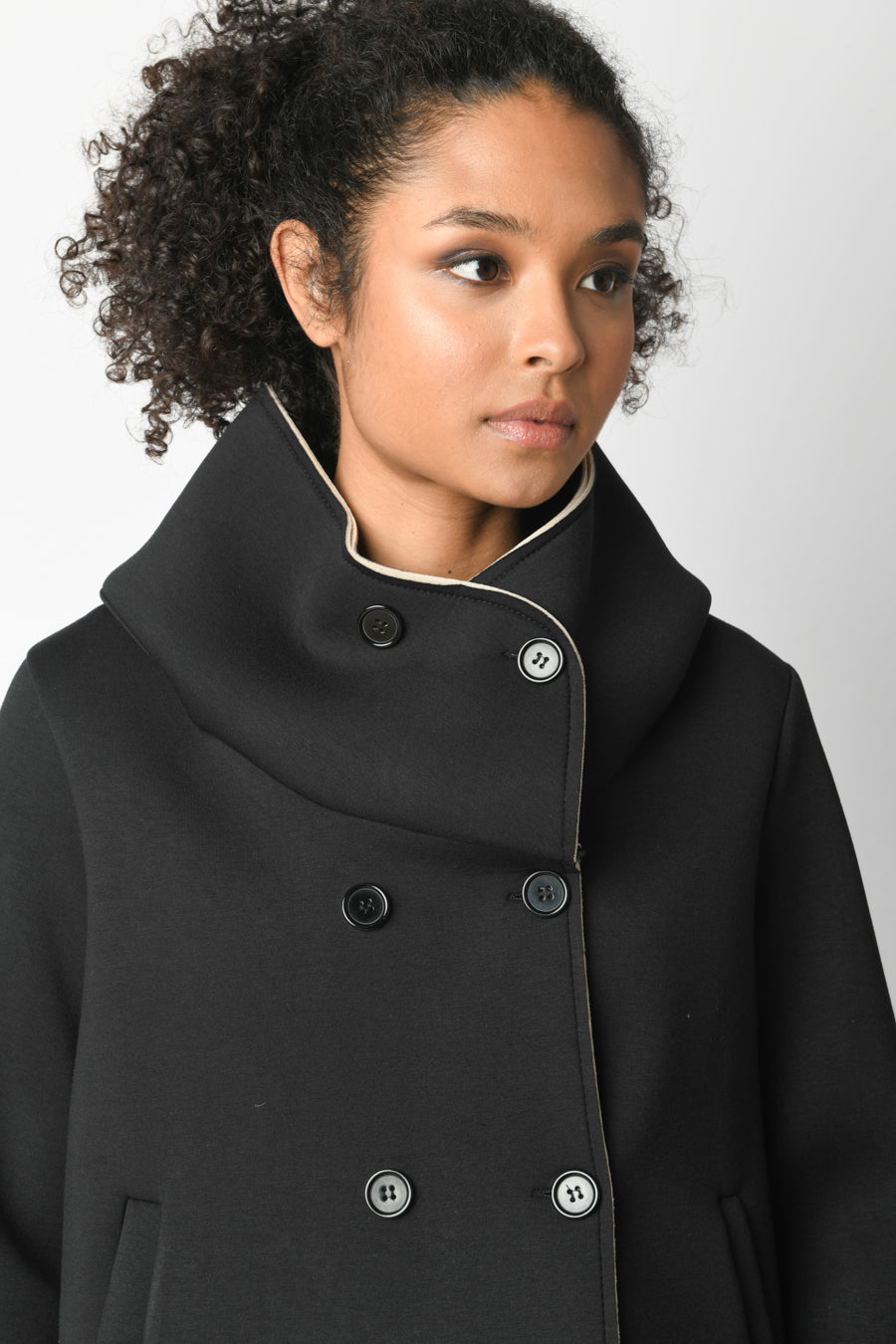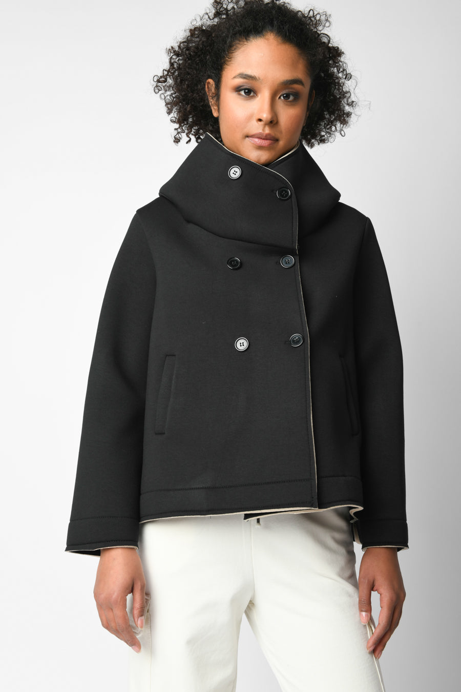 Cappotto corto a doppio strato in viscosa stretch nera con collo alto oversize, chiusura doppiopetto e tasche laterali.