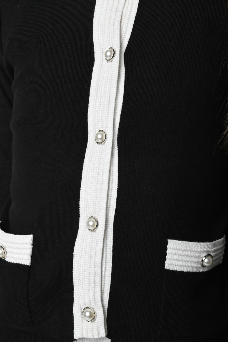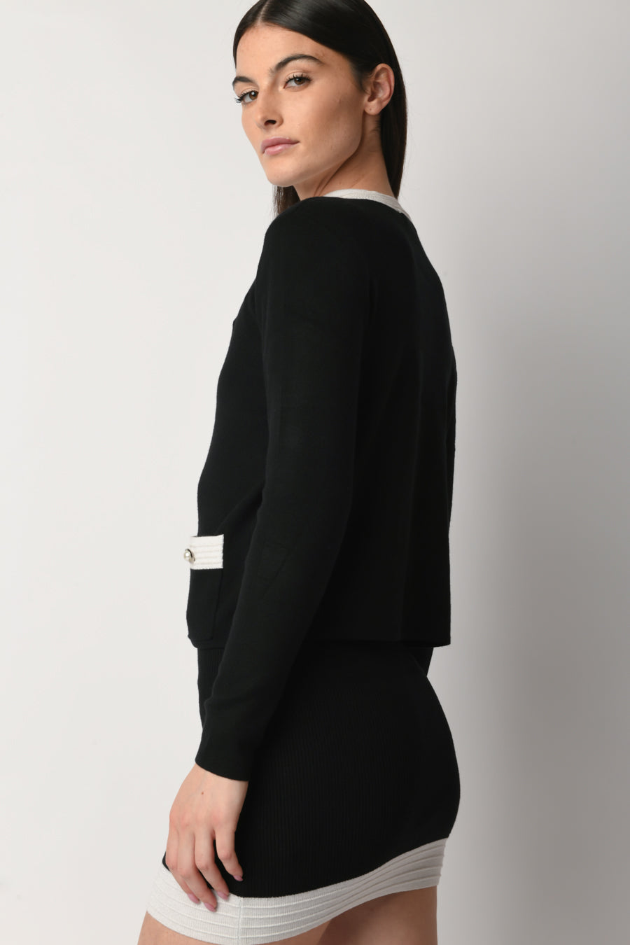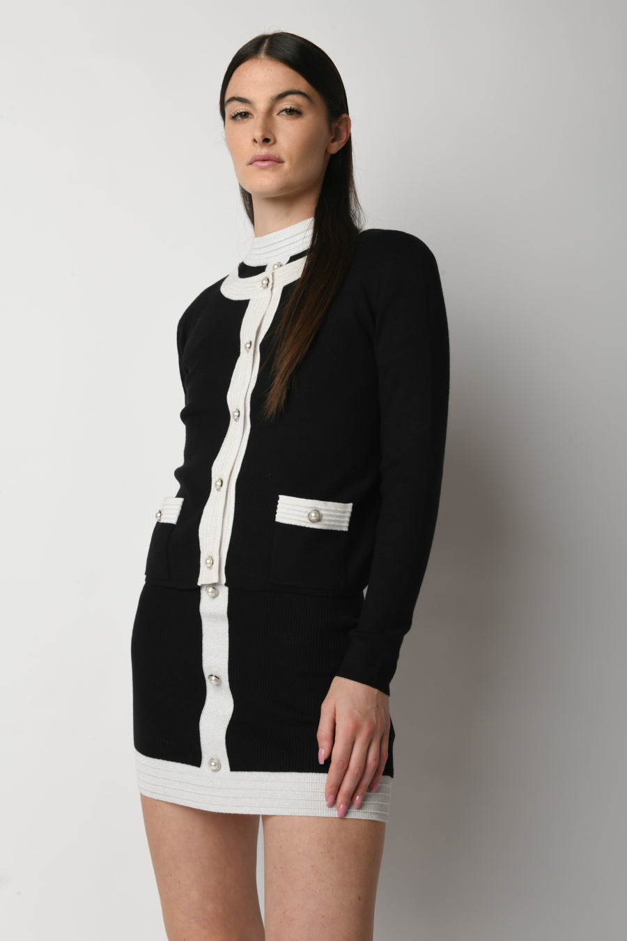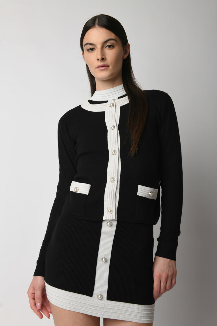 Cardigan in maglia misto viscosa nera con scollo tondo, profili in maglia lurex bianca, bottoni gioiello con perla e taschini frontali.