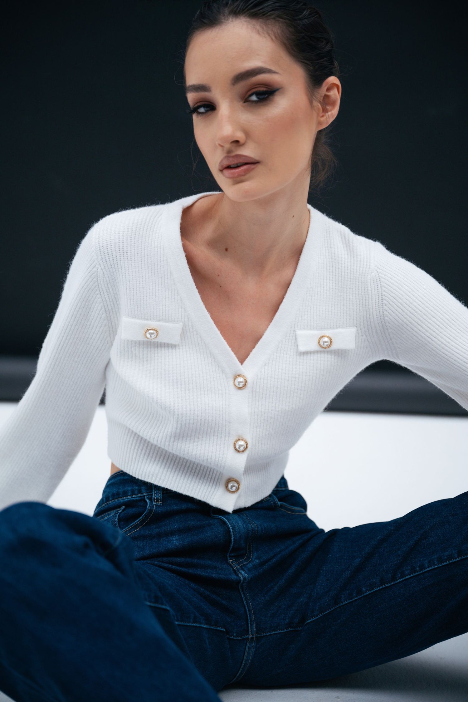Cardigan crop in maglia a costine misto viscosa bianca con scollo a V, bottoni gioiello sul davanti e sui finti taschini sul petto e maniche lunghe a palloncino.
