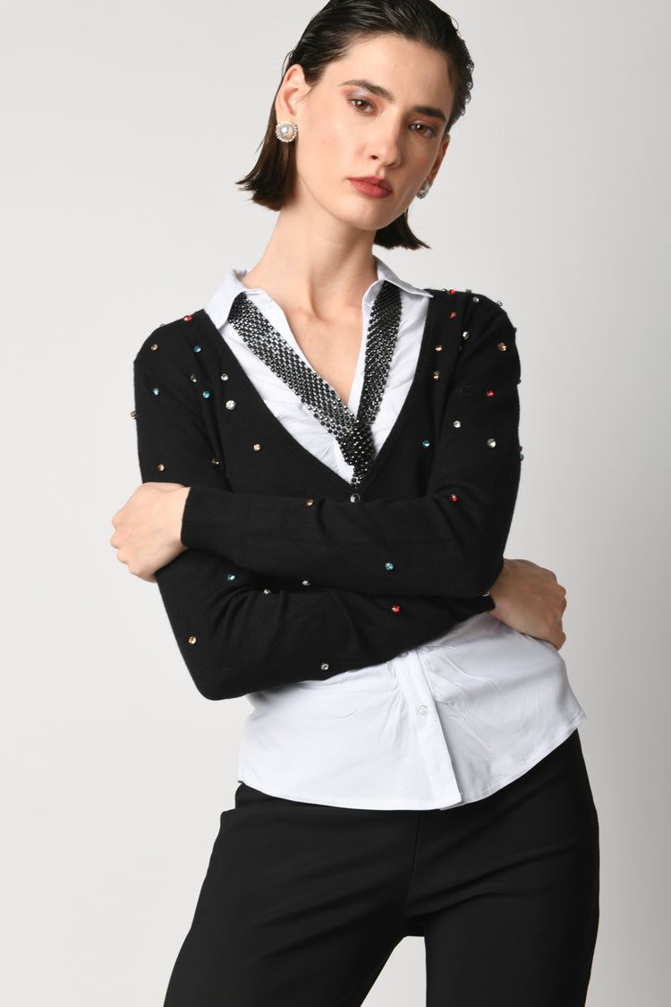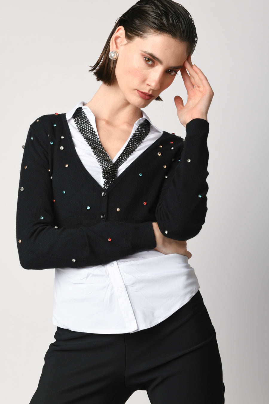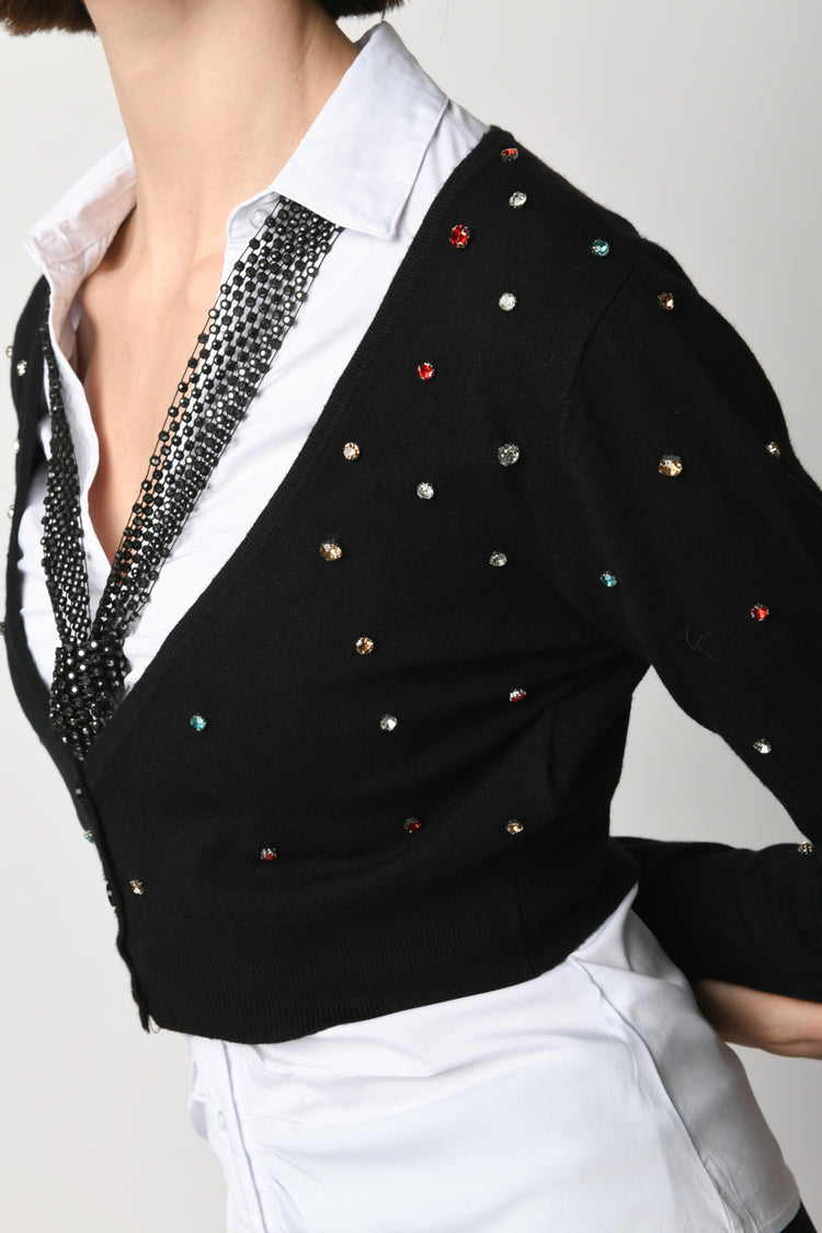 Cardigan crop in maglia misto viscosa nera con scollo a V, abbottonatura frontale, finiture a costine e strass multicolor all-over.