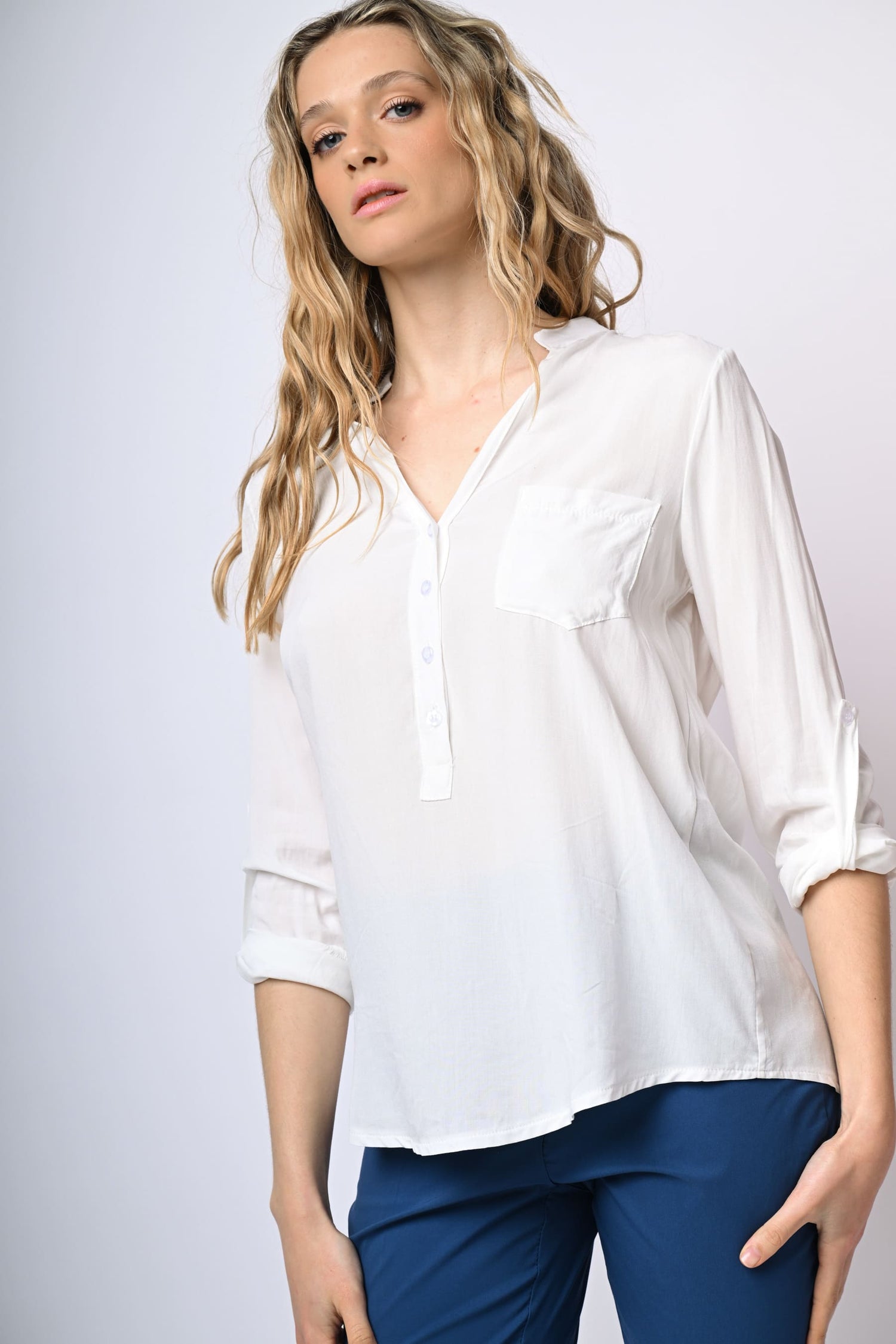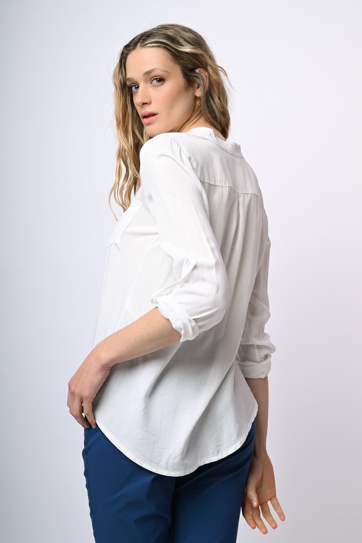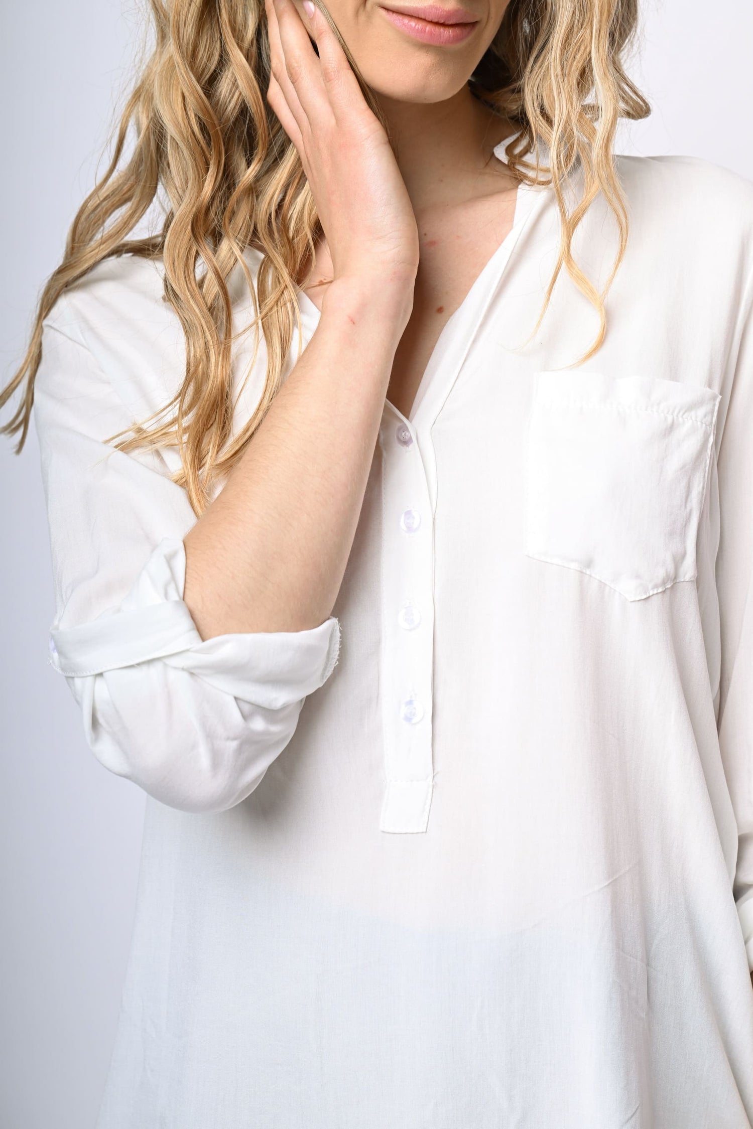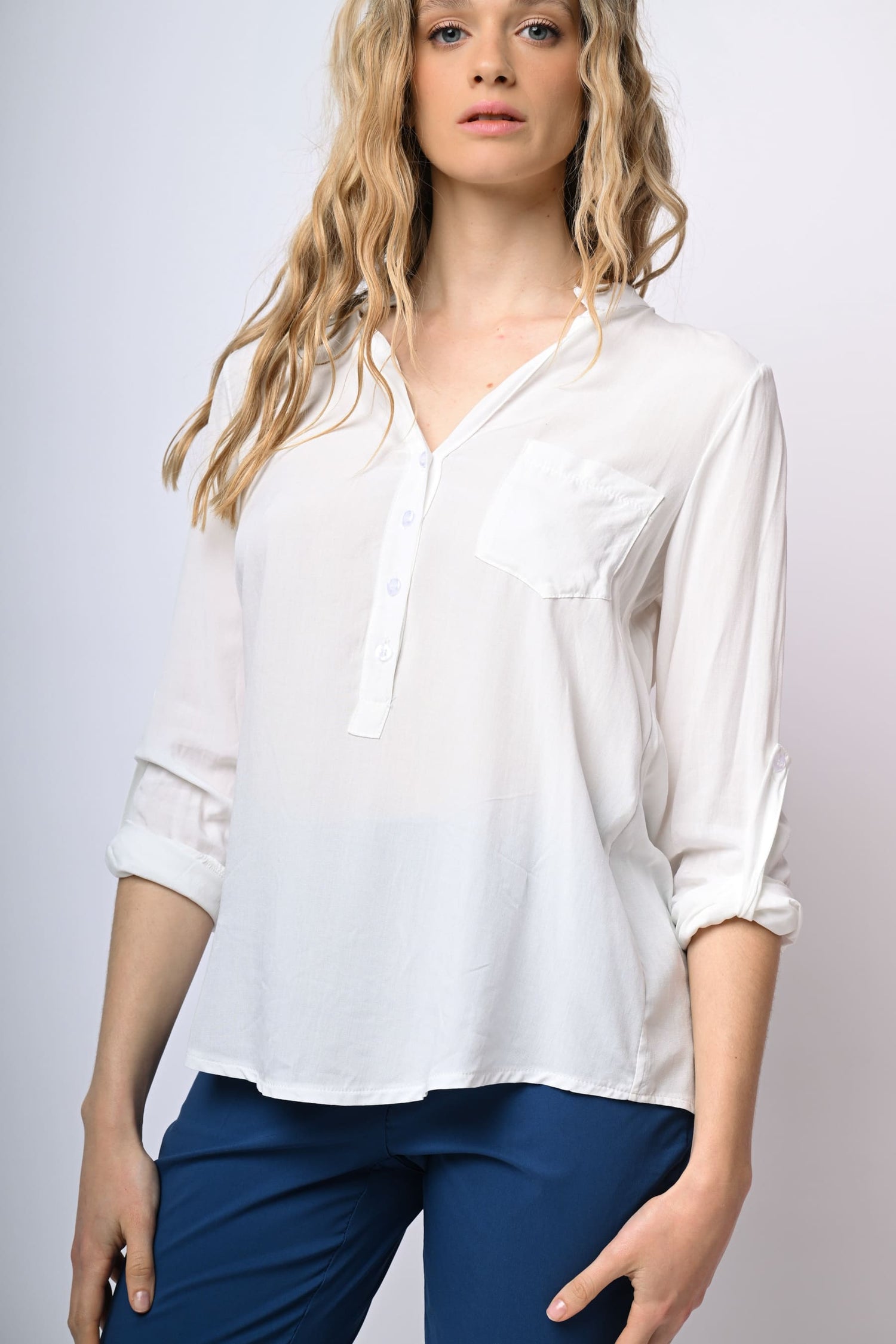Camicia in viscosa bianca con colletto alla tunisina chiuso da bottoni, taschino sul petto, orlo stondato sul retro e maniche con risvolto e cinturino.