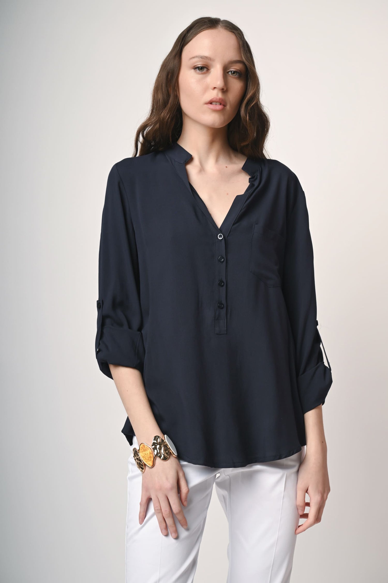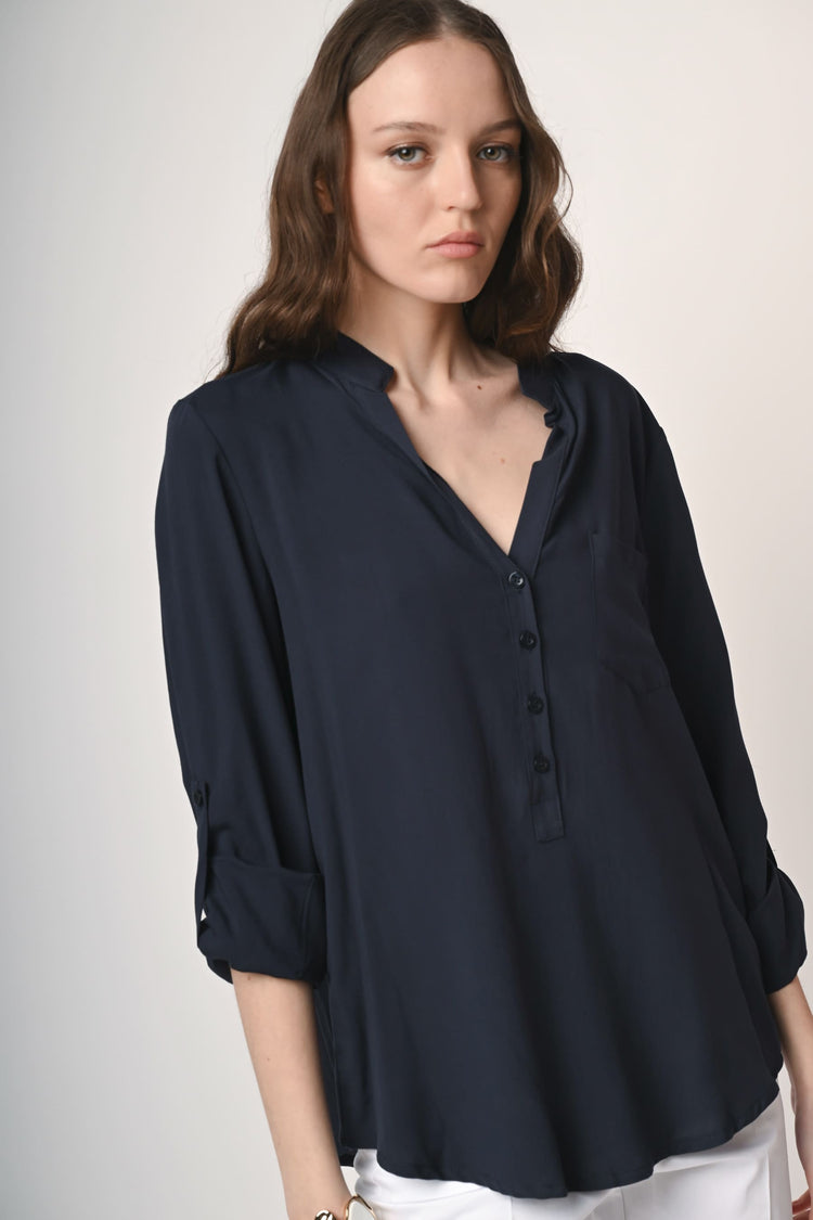Camicia in viscosa blu notte con colletto alla tunisina chiuso da bottoni, taschino sul petto, orlo stondato e maniche con risvolto e cinturino.