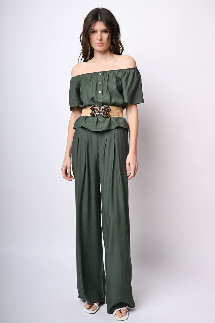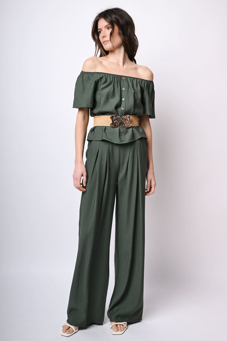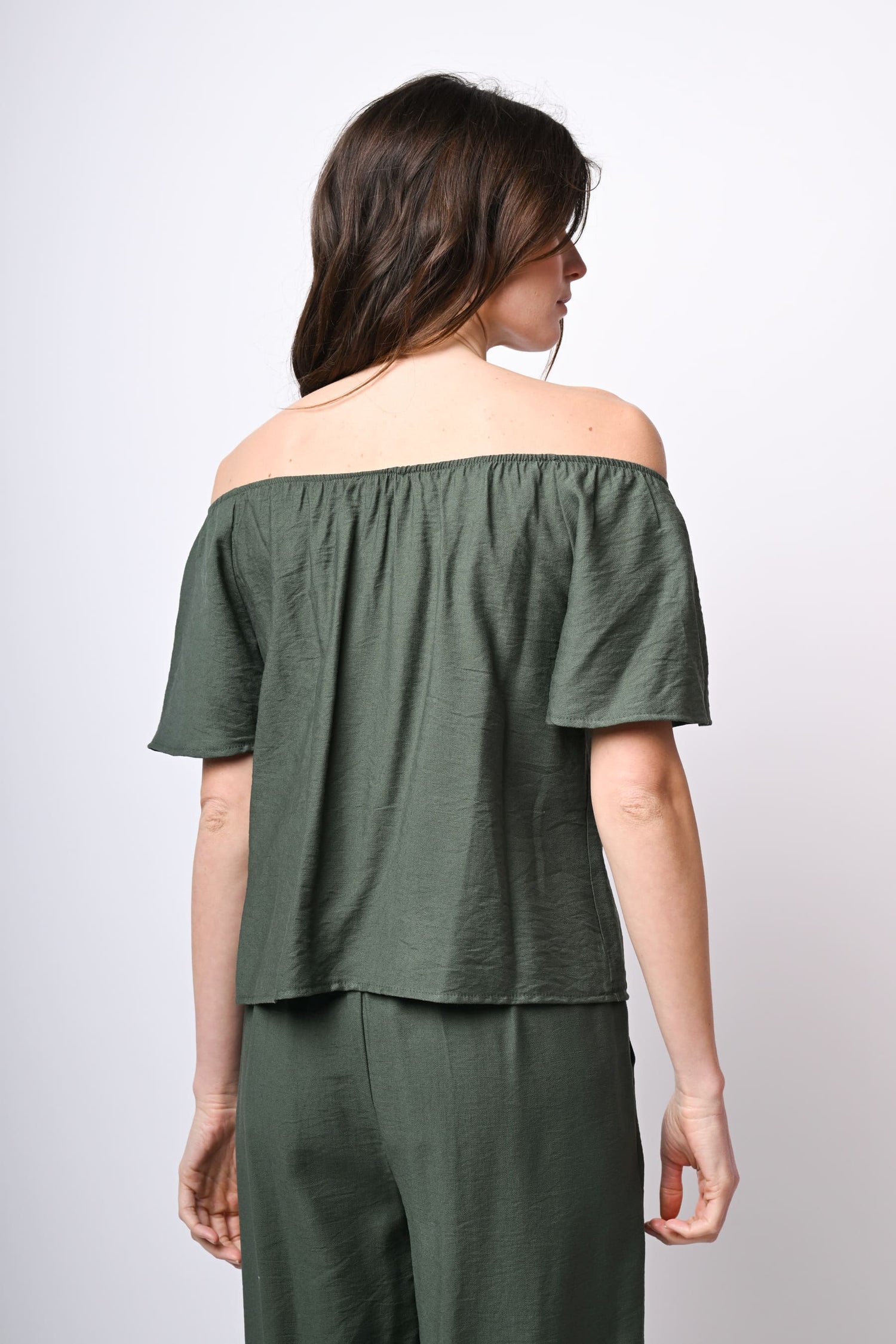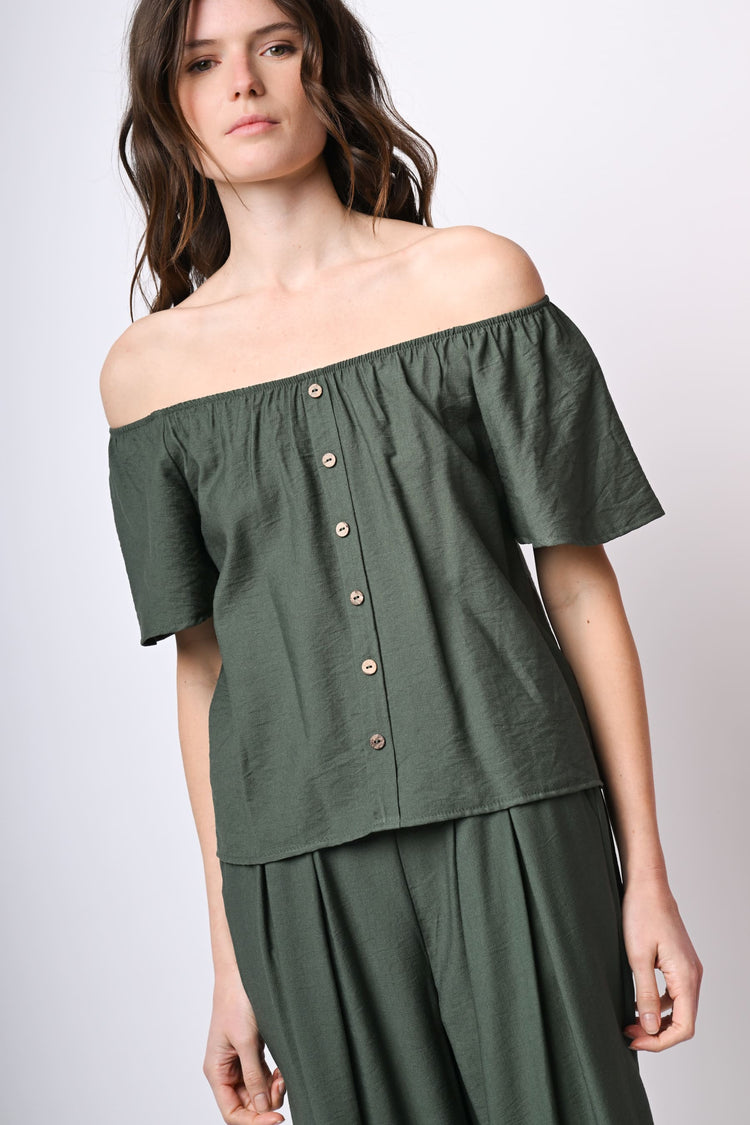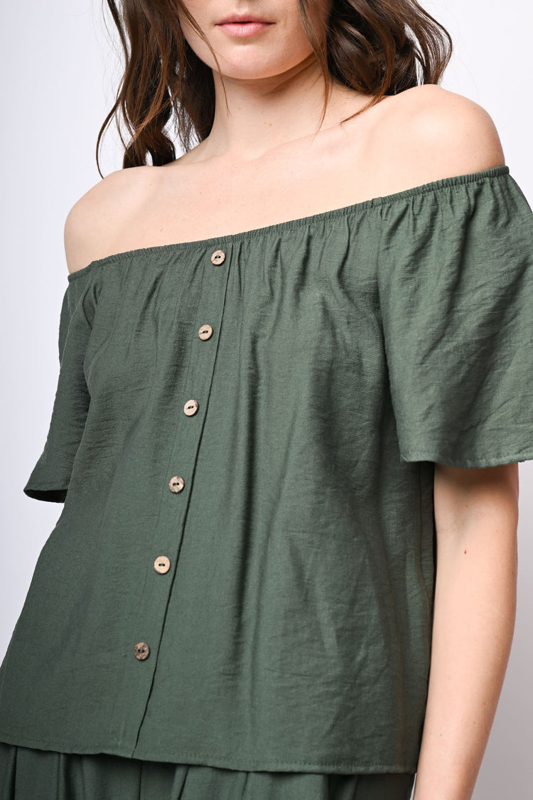 Top misto viscosa verde militare con spalle scoperte, scollo elasticizzato, bottoni lungo il centro e mezze maniche.
