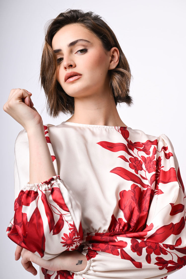 Blusa in raso con stampa floreale nei toni del rosso su fondo bianco, scollo tondo, fascia alla vita con cut-out e fiocco da annodare al centro dietro, maniche lunghe a palloncino con polsini elasticizzati e scollo a goccia posteriore con bottone.