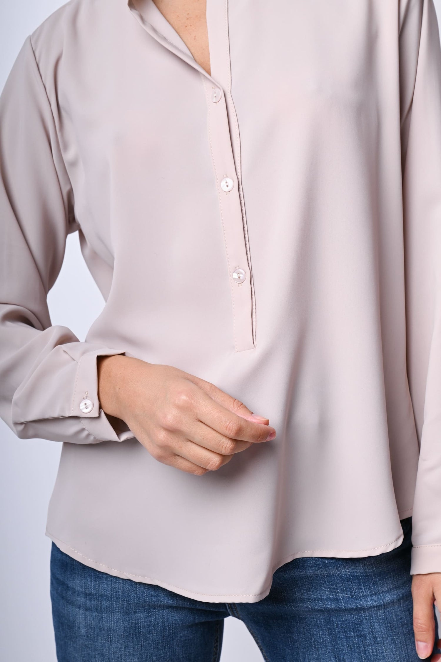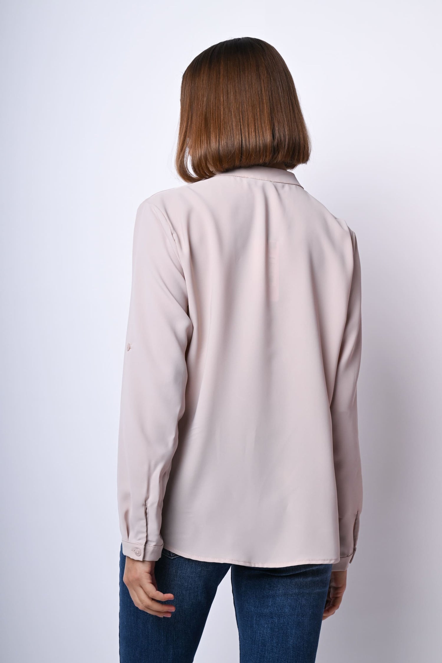 Camicia in crêpe rosa pastello con colletto alla coreana, abbottonatura parziale sul davanti, maniche arrotolatili chiuse da bottino e orlo stondato.