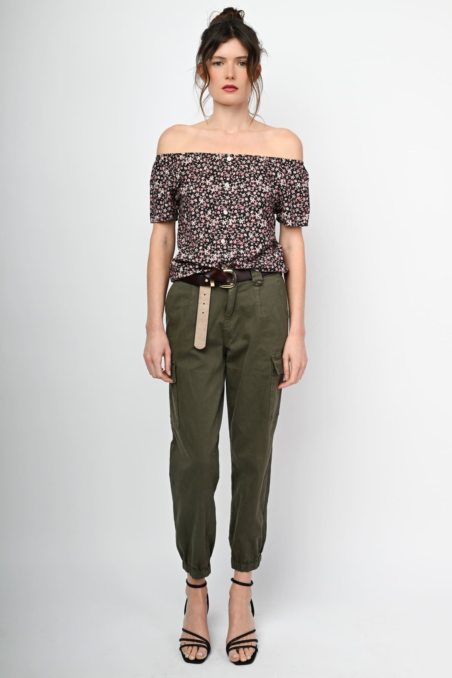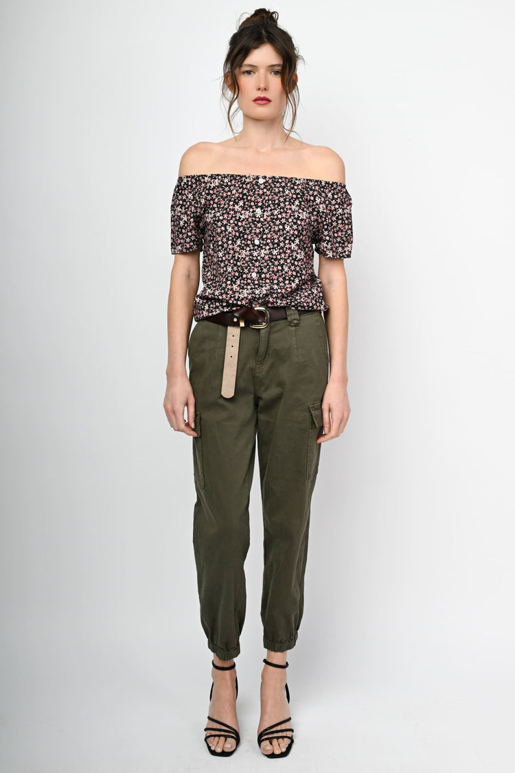Top in viscosa a stampa micro floreale multicolor su sfondo nero con spalle scoperte, scollo elasticizzato e bottoni sul davanti.