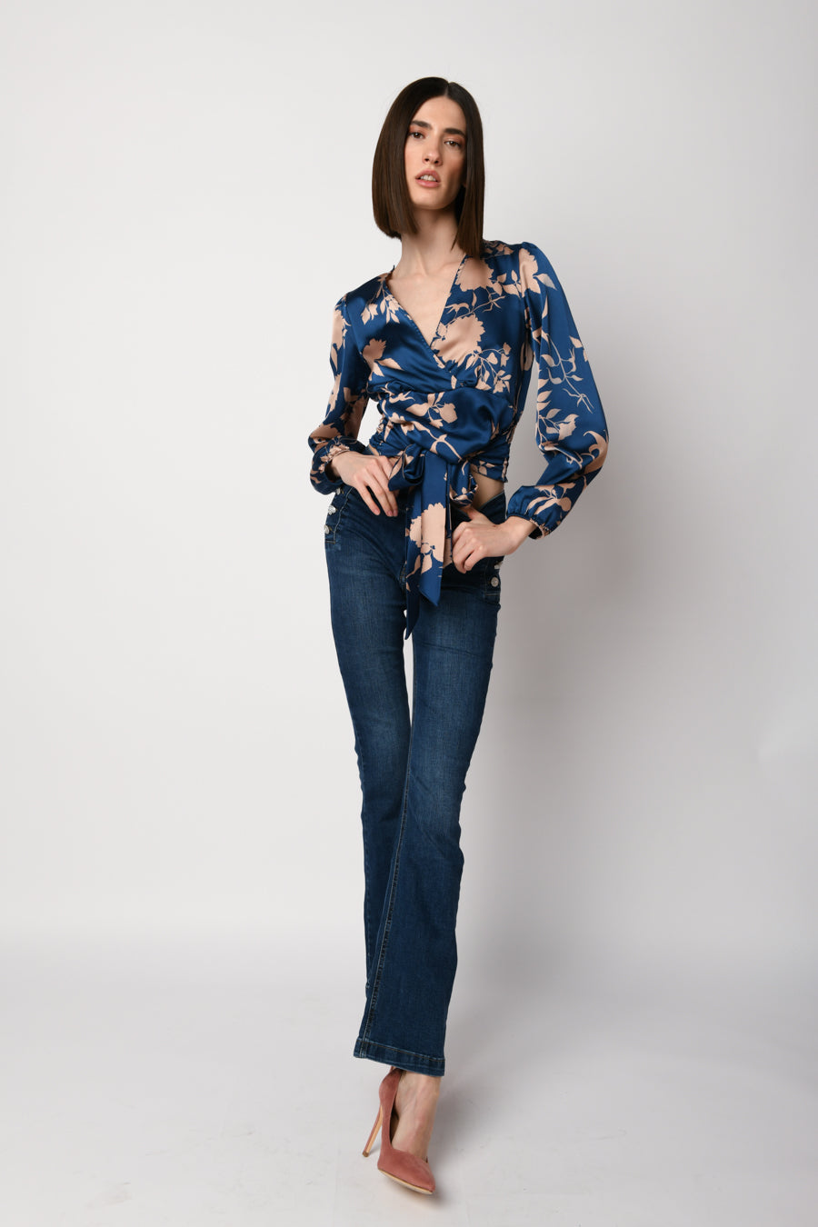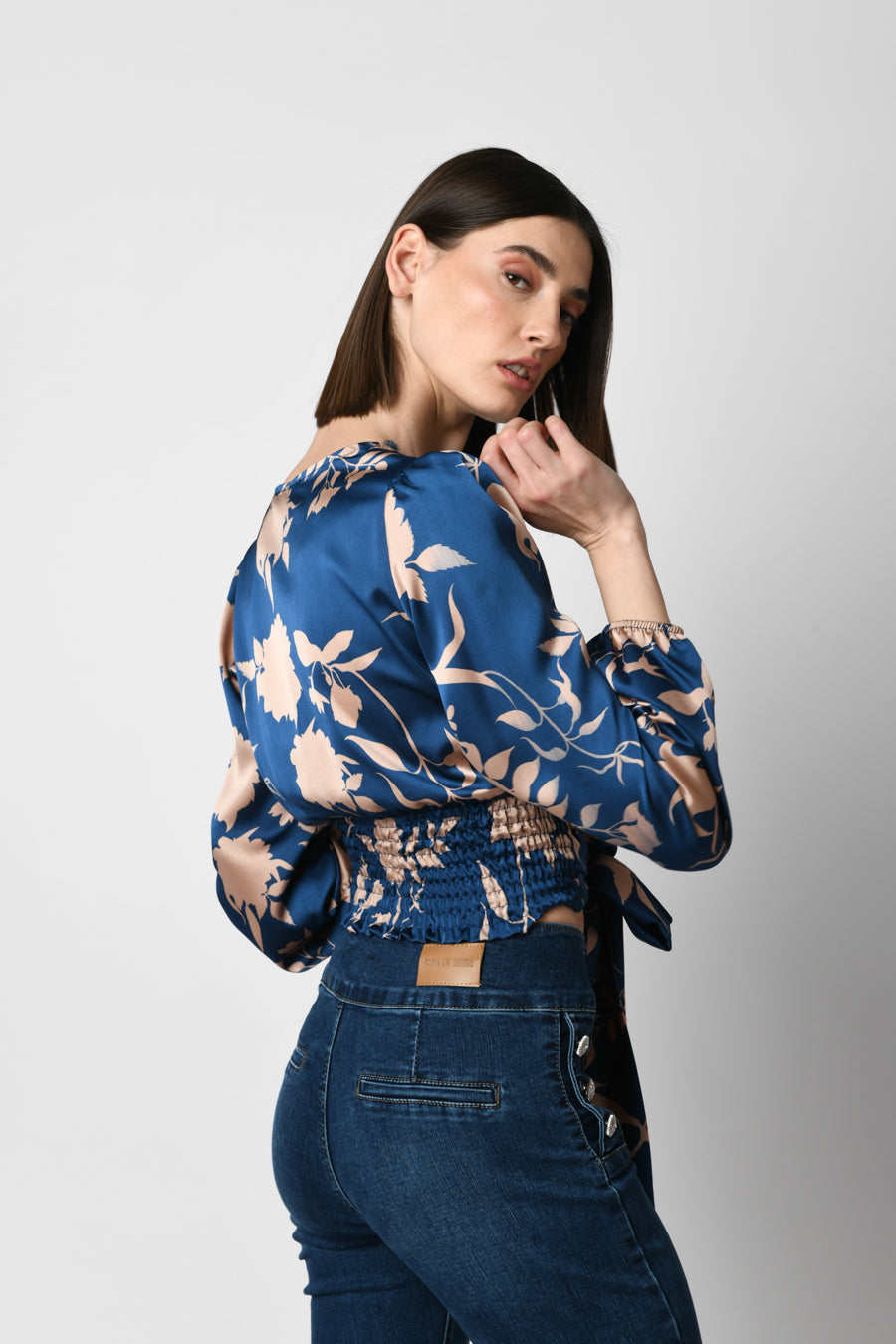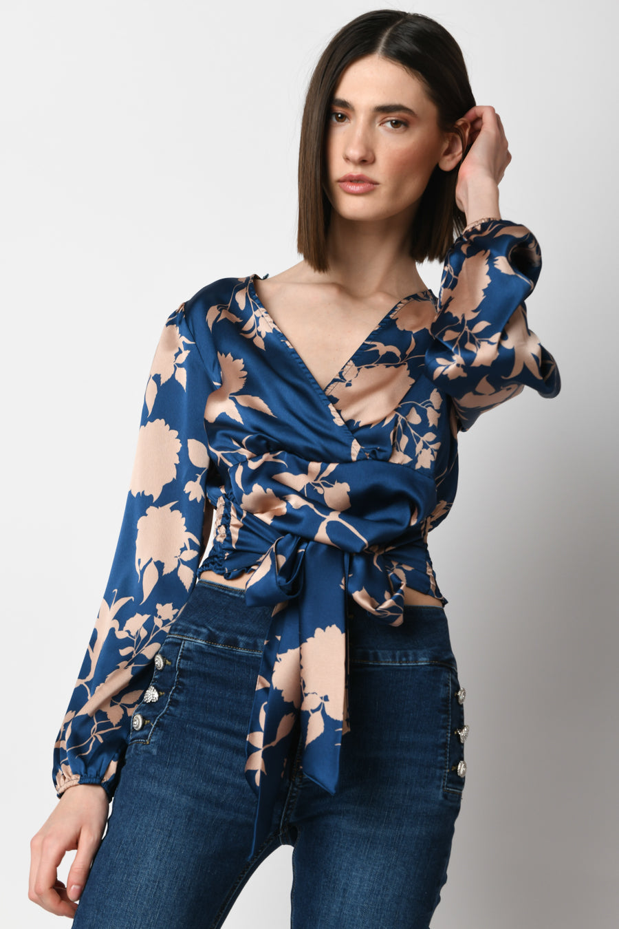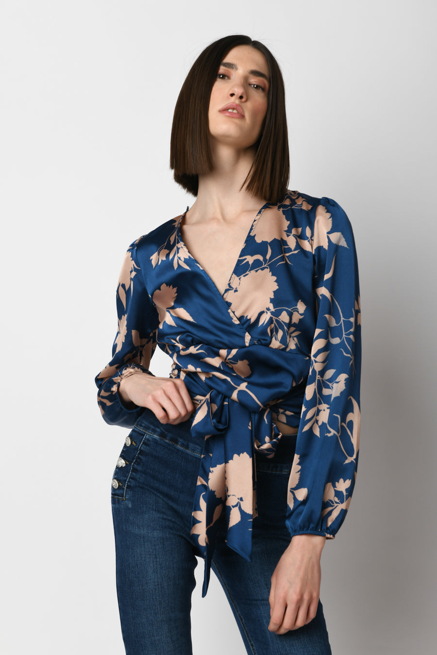 Blusa cache-coeur in raso a stampa floreale rosa nude su fondo blu con scollo a V incrociato, cintura da annodare alla vita, maniche morbide con polsini elasticizzati e vita elasticizzata a punto smock sul retro.