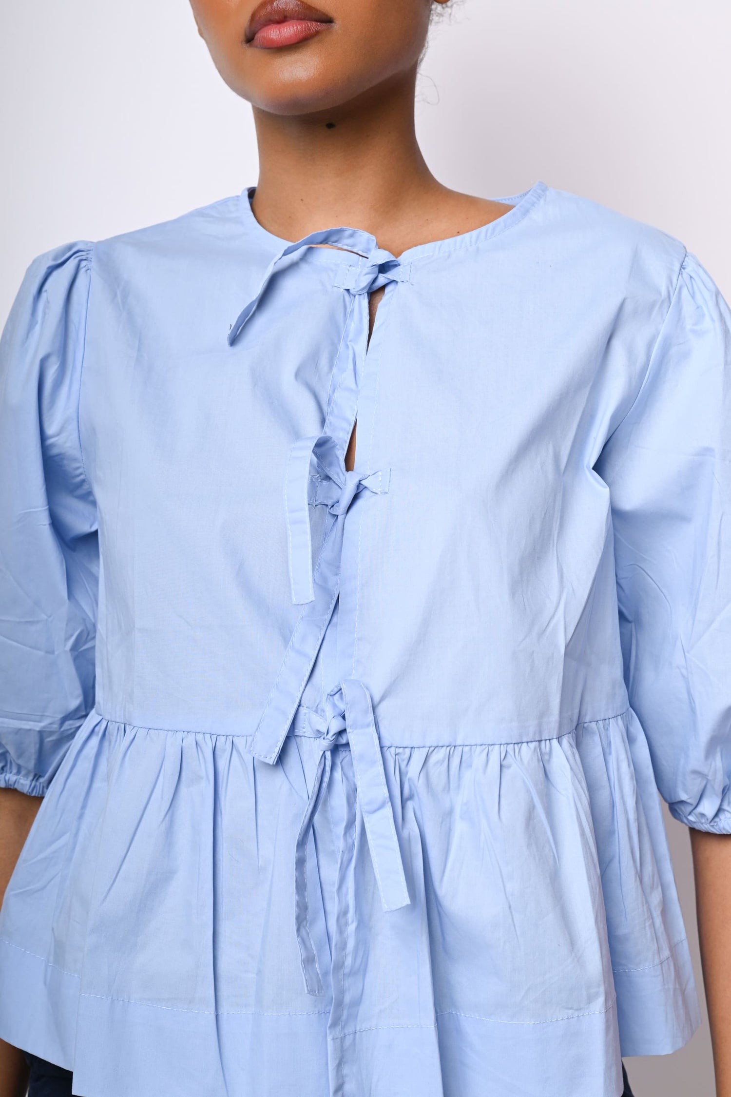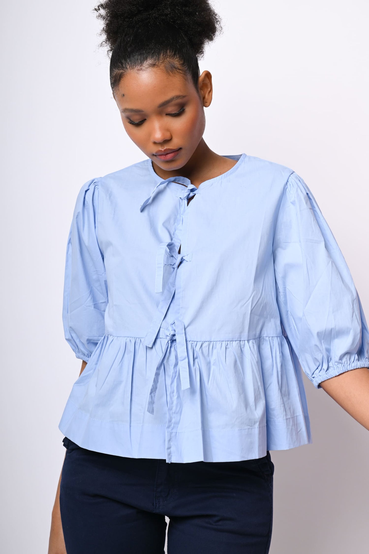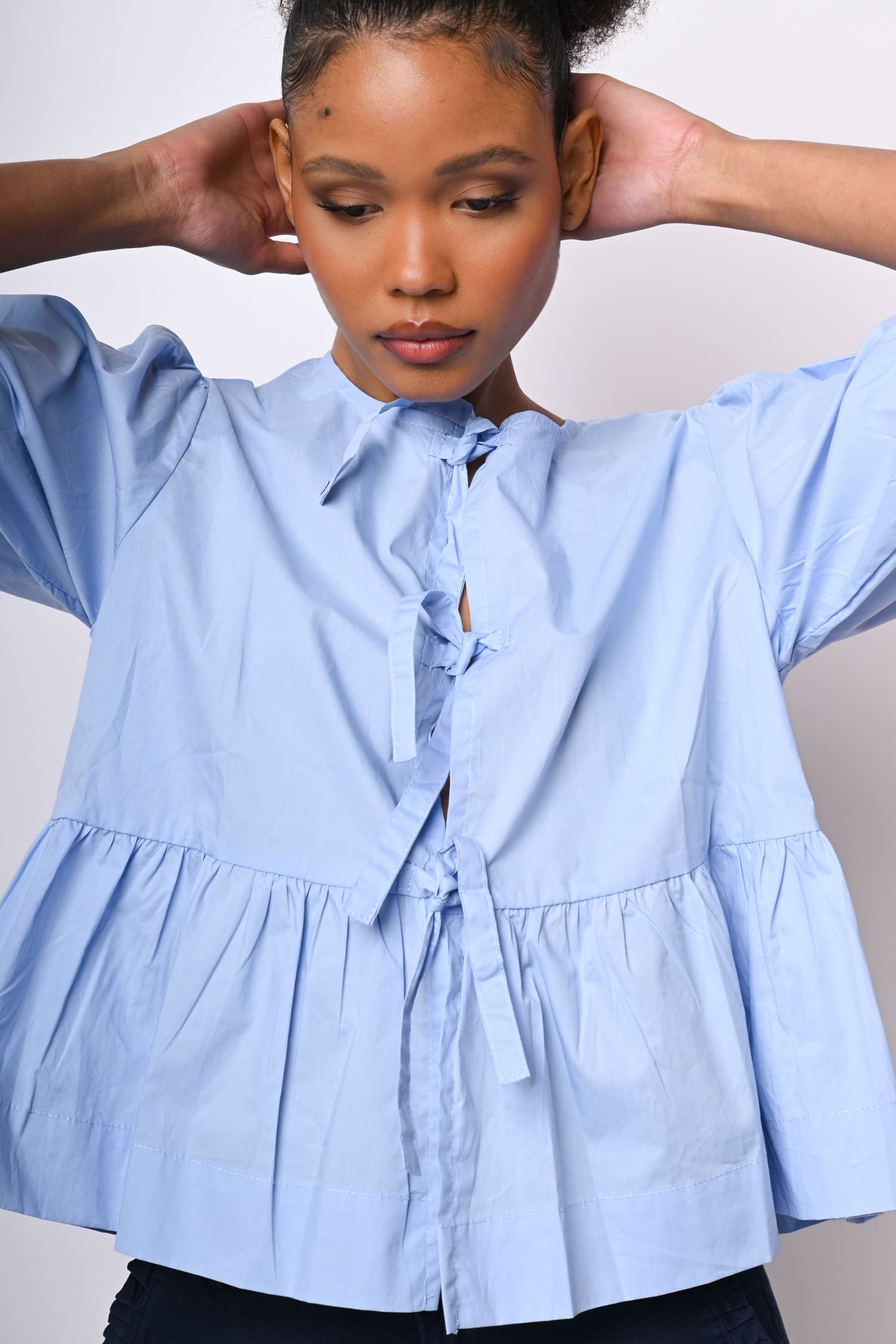 Blusa in cotone azzurro con scollo tondo, laccetti da annodare sul davanti, maniche crop a palloncino con orli elasticizzati e balza al fondo.