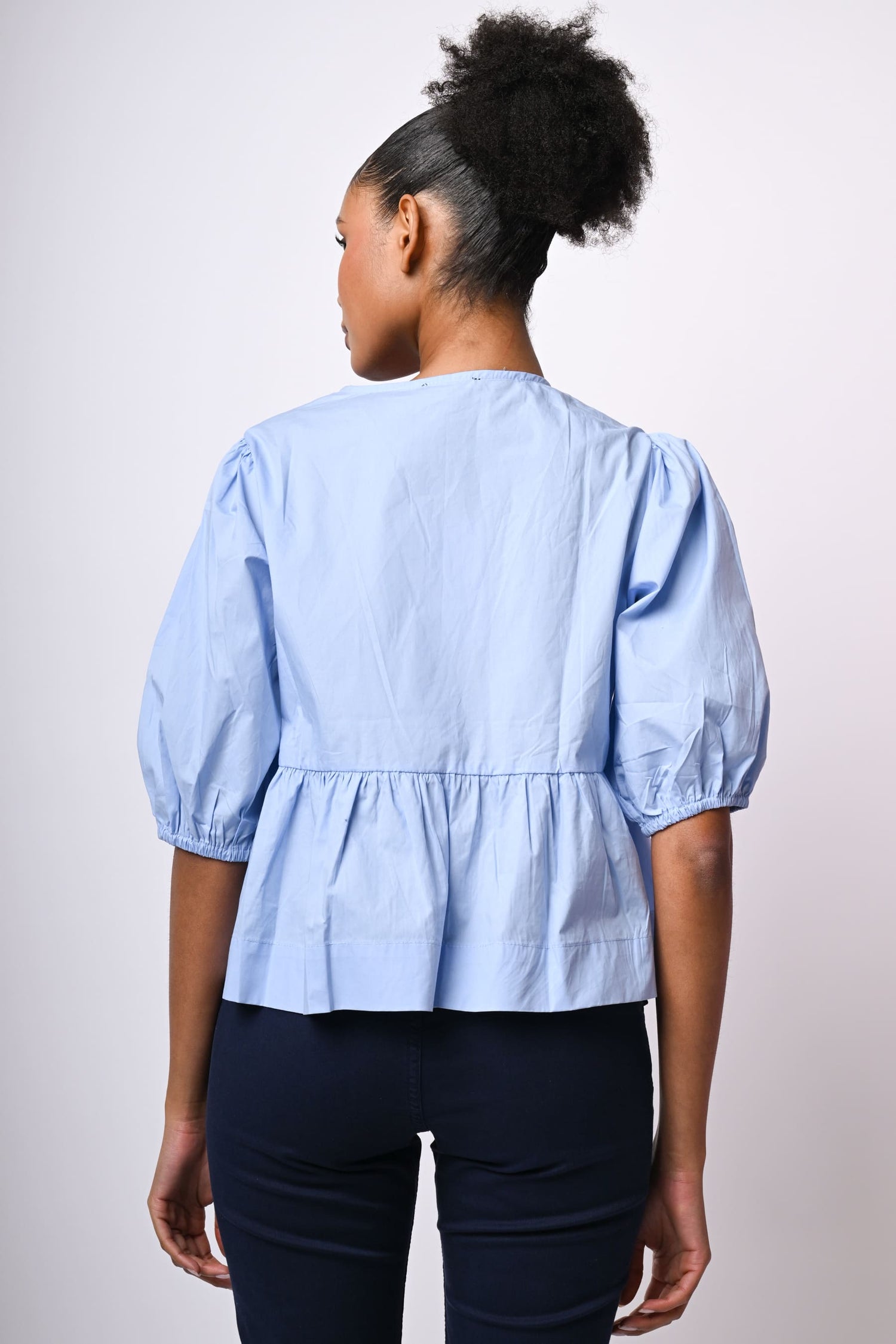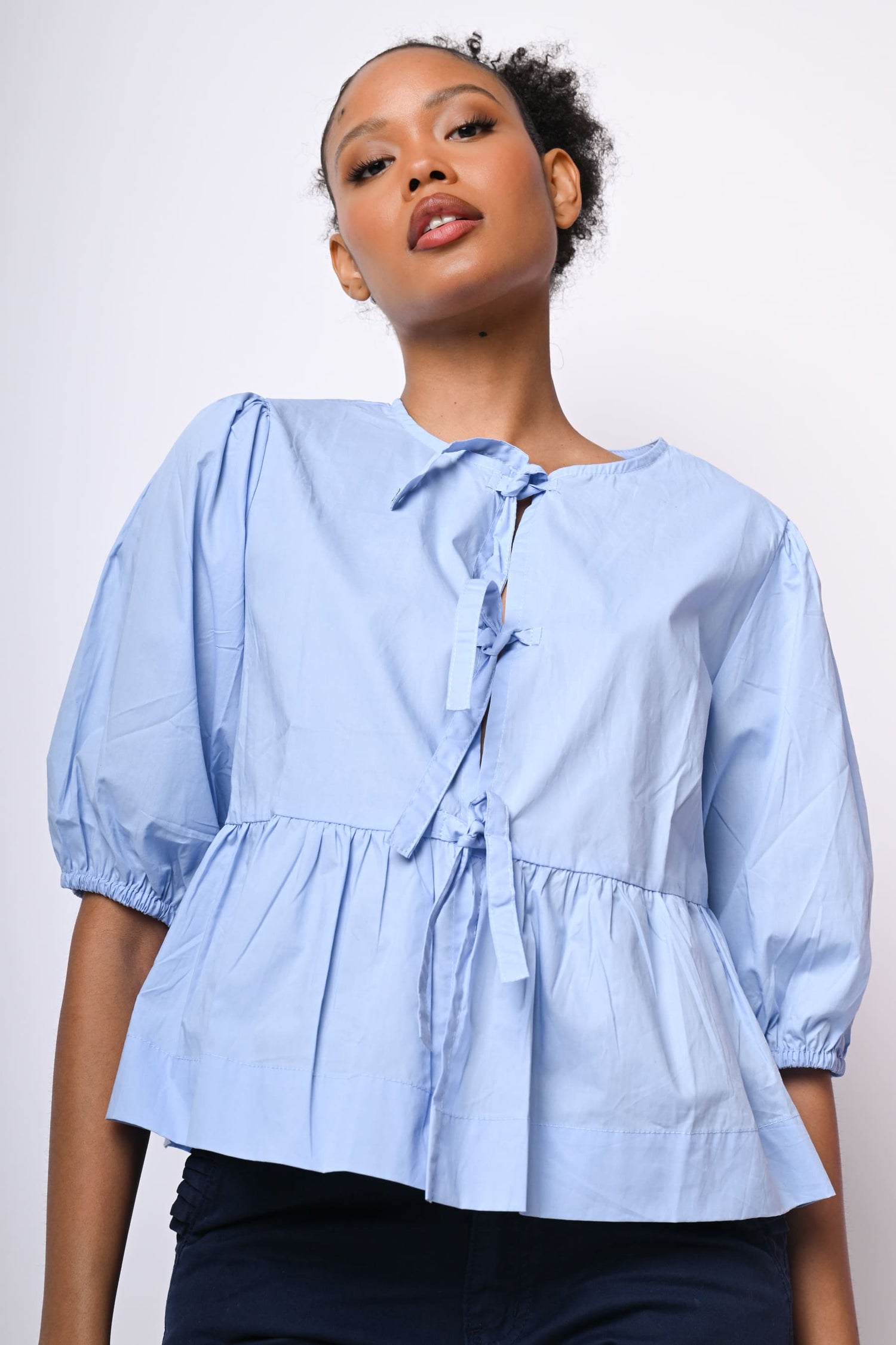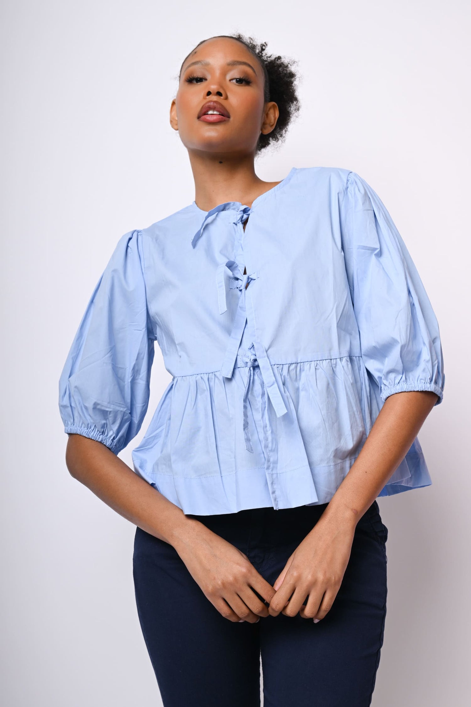 Blusa in cotone azzurro con scollo tondo, laccetti da annodare sul davanti, maniche crop a palloncino con orli elasticizzati e balza al fondo.
