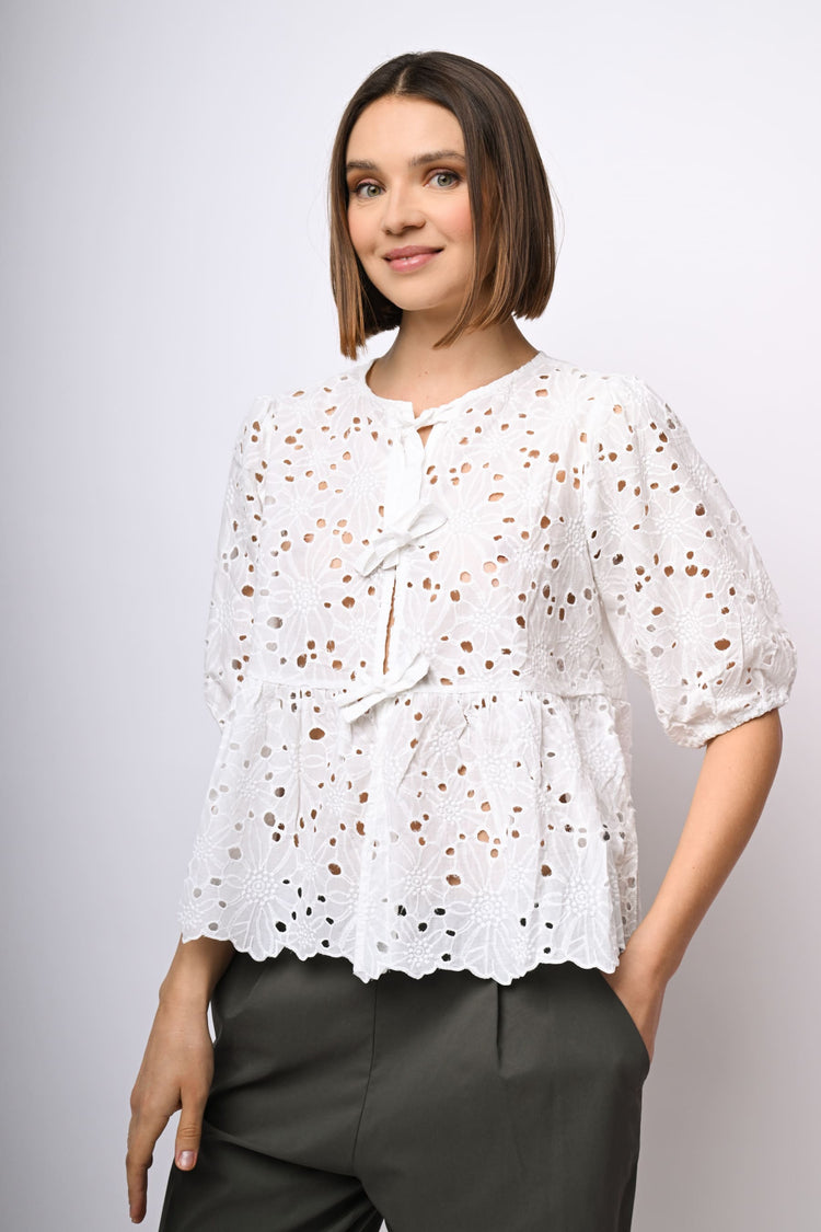 Blusa in pizzo Sangallo di cotone bianco con scollo tondo, tre laccetti da annodare sul davanti, maniche crop a palloncino e orlo smerlato.