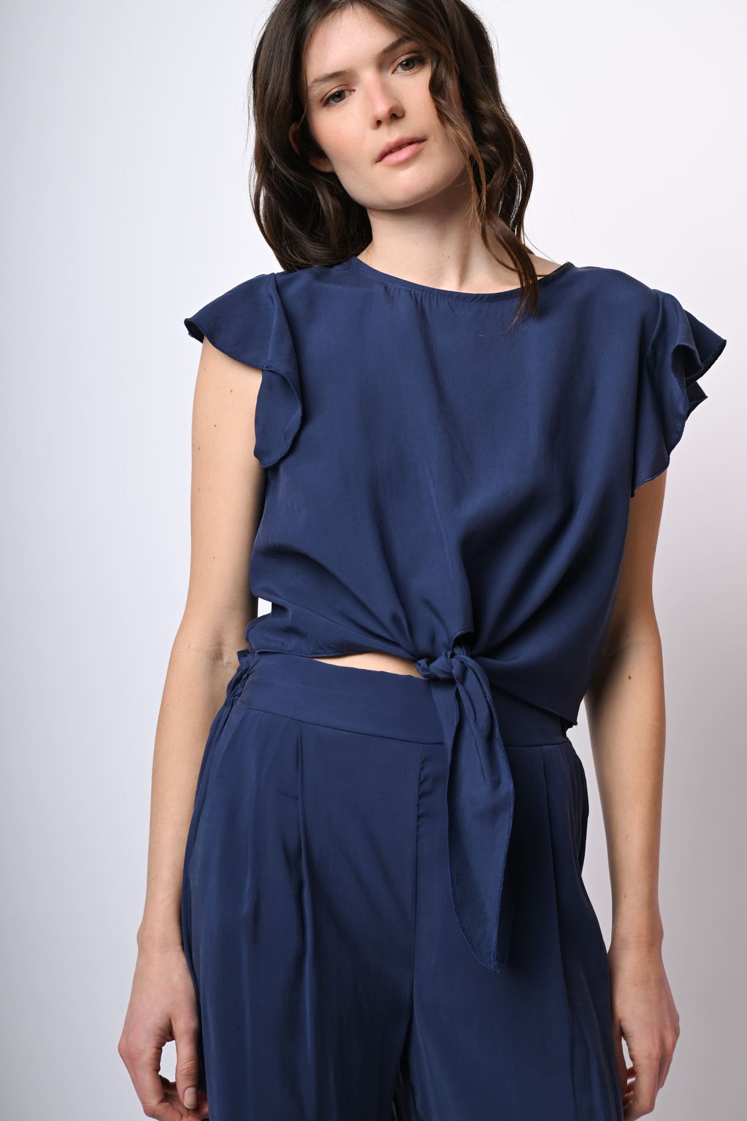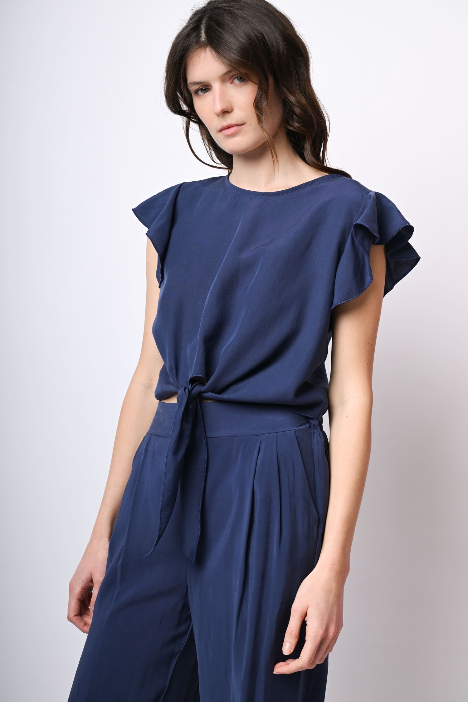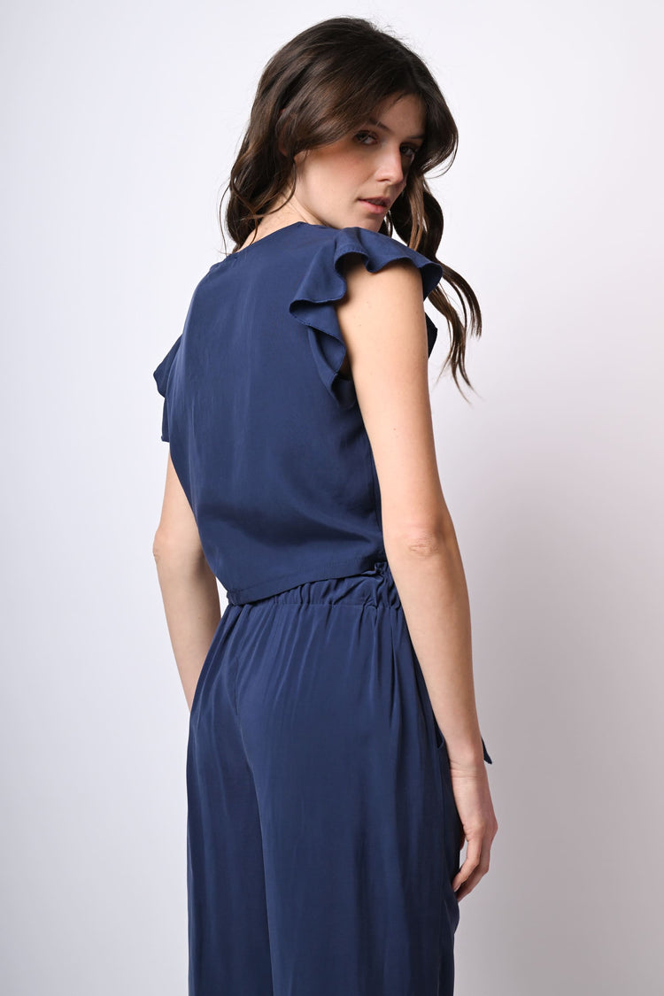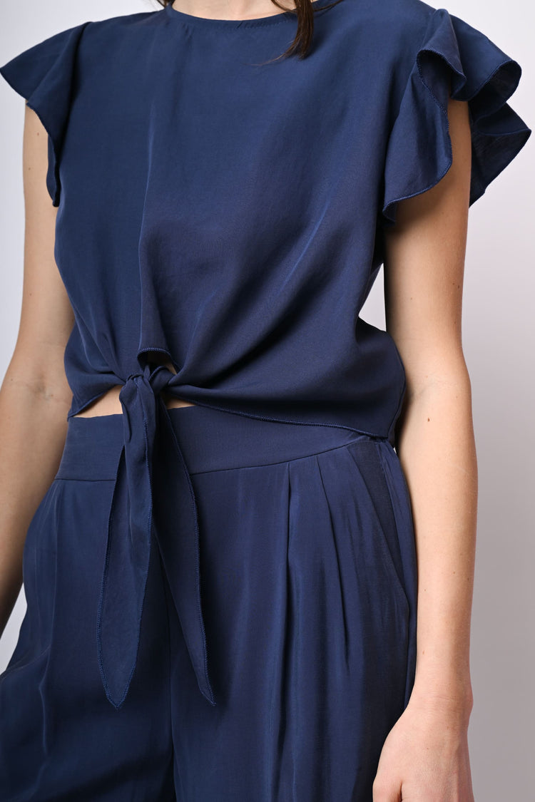 Top crop in lyocell blu con scollo tondo, maniche ad aletta a volant e nodo alla vita.