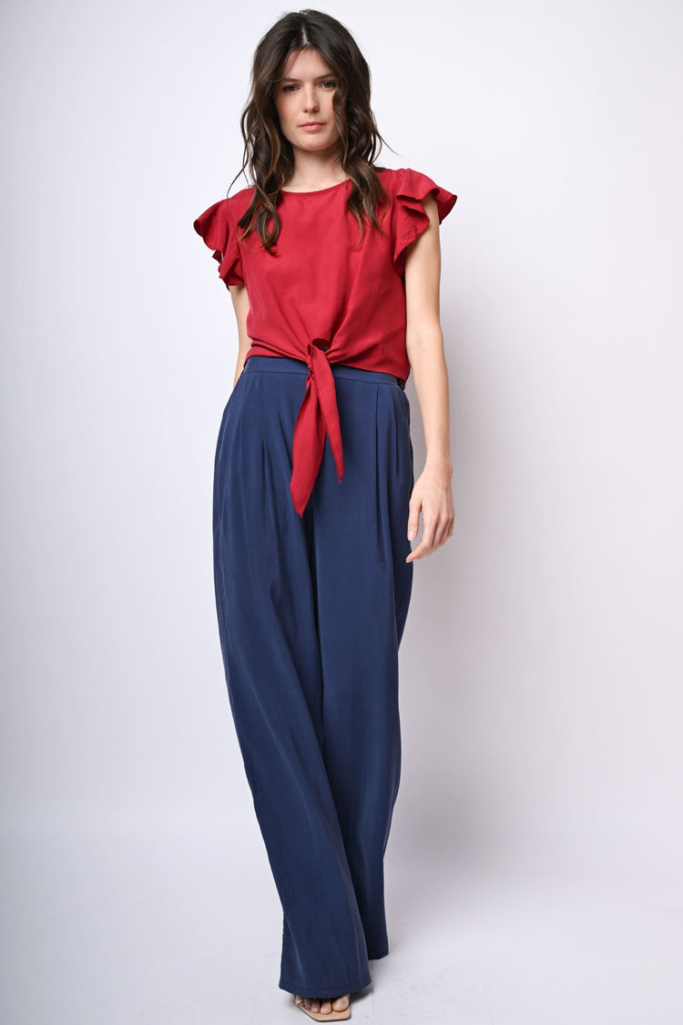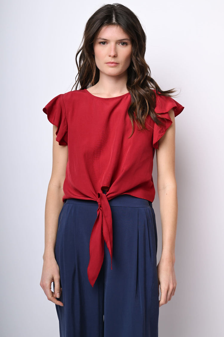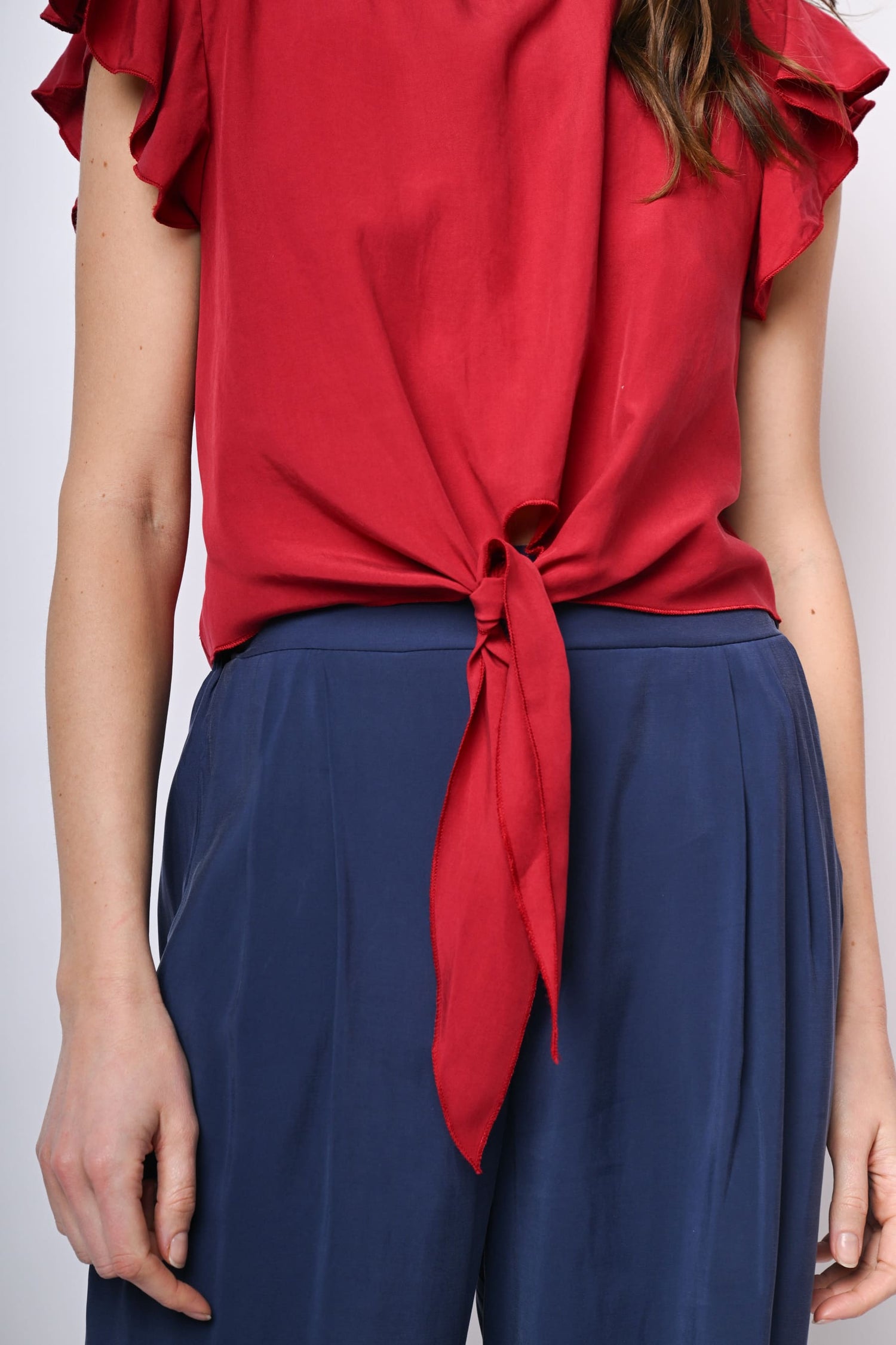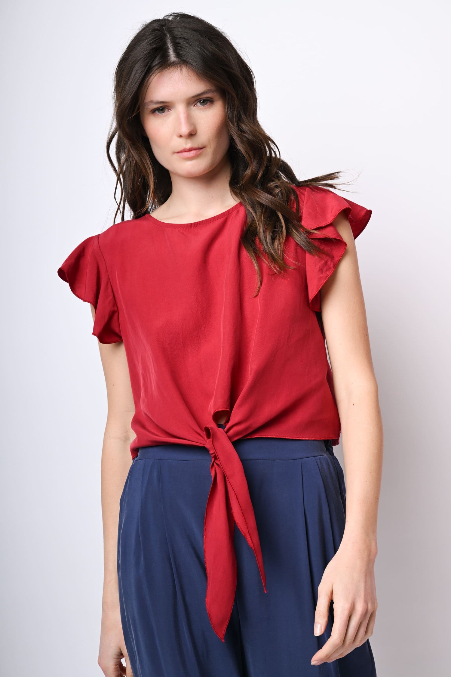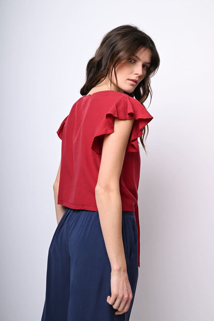 Top crop in lyocell rosso con scollo tondo, maniche ad aletta a volant e nodo alla vita.