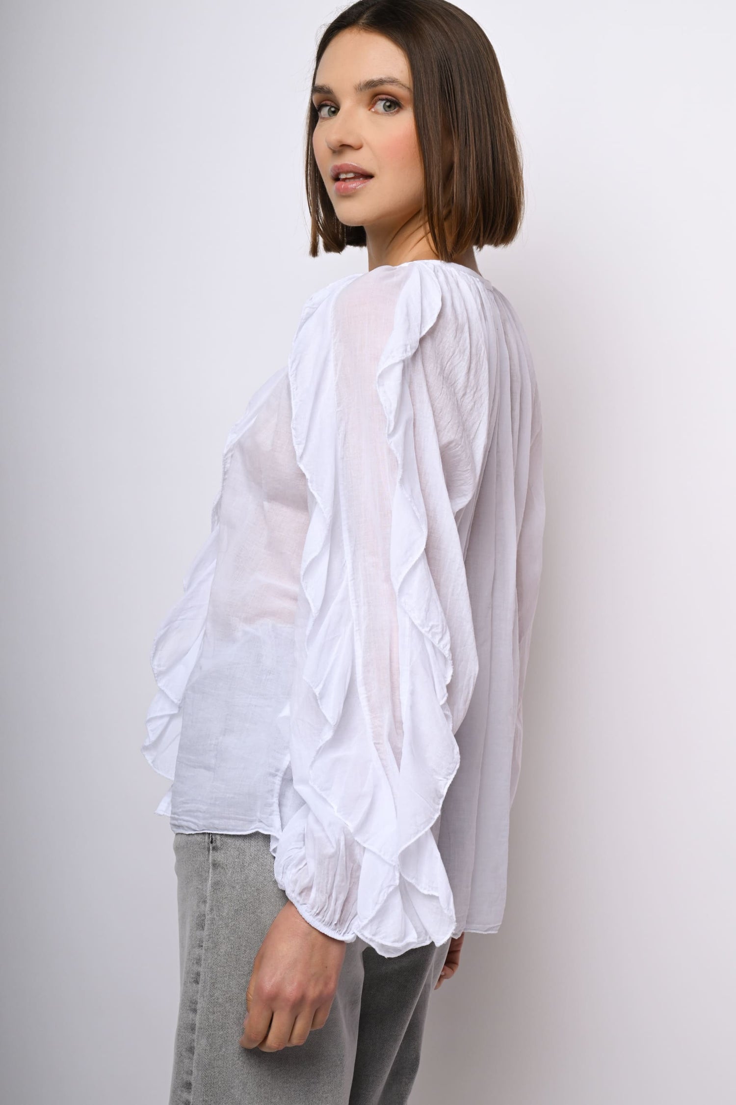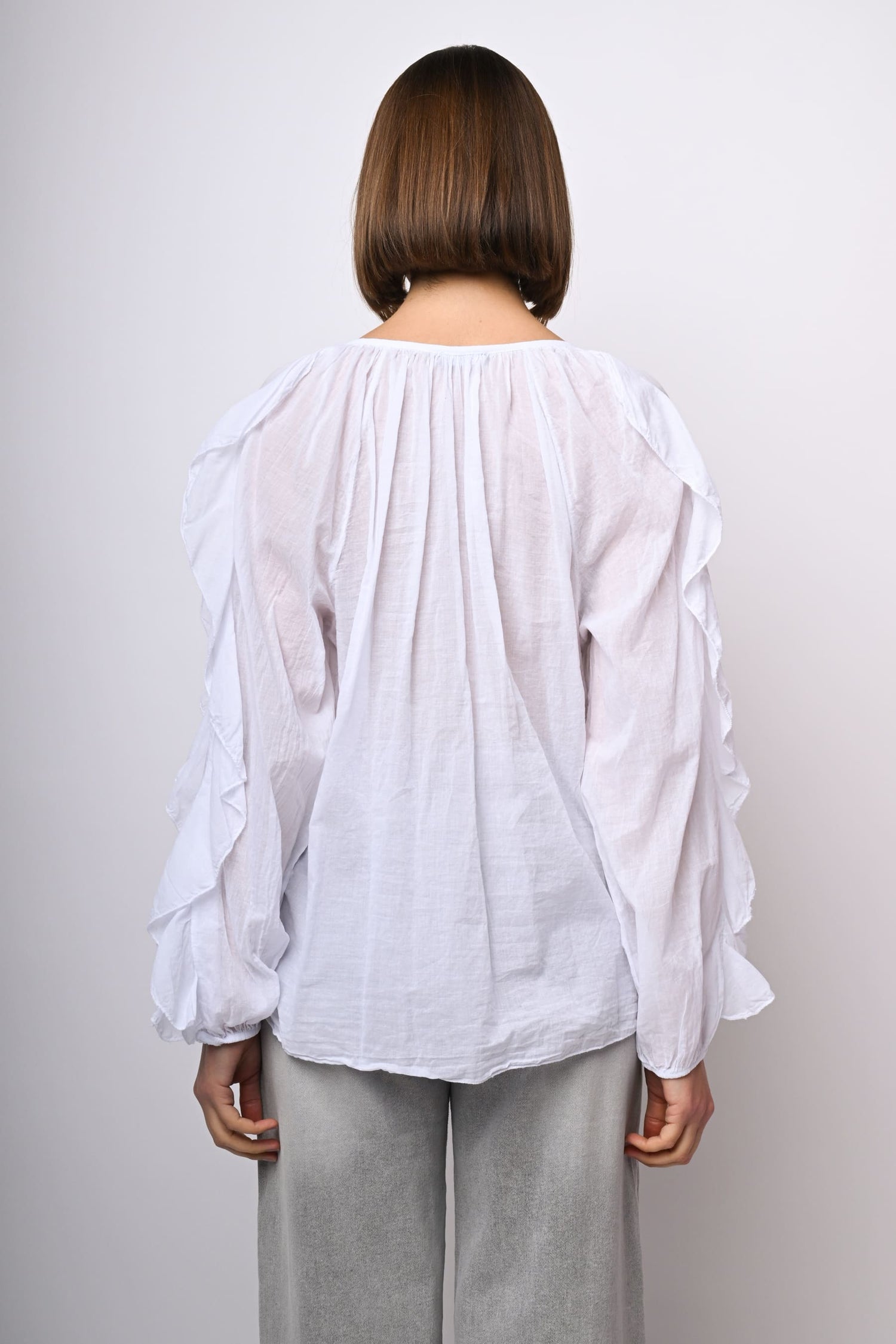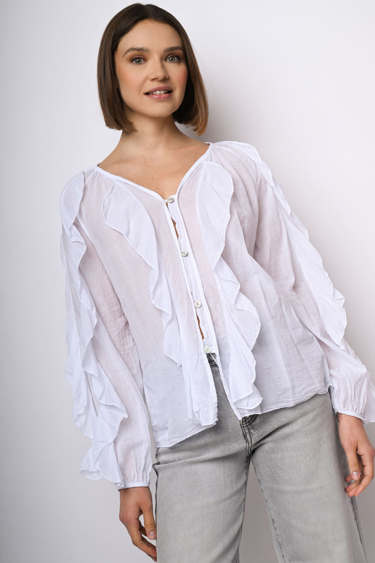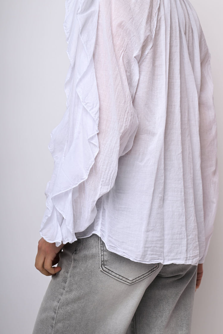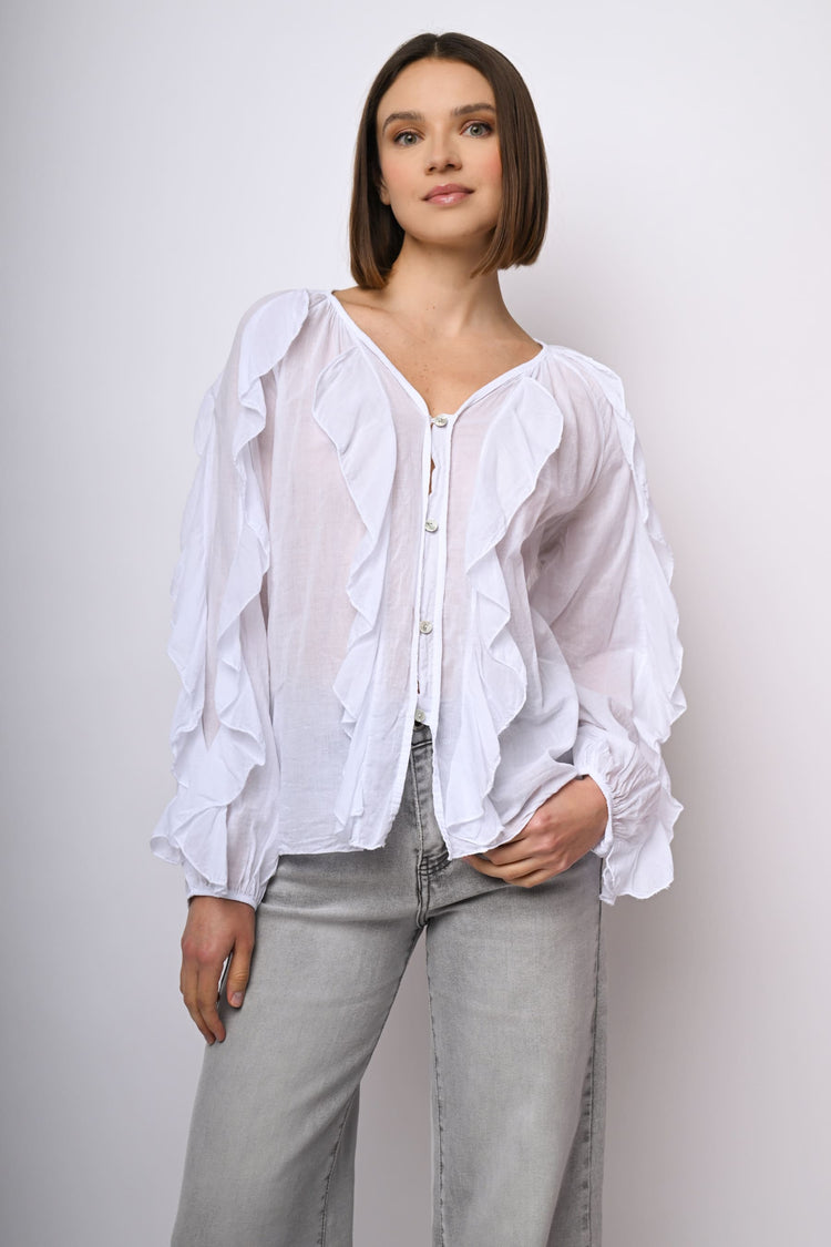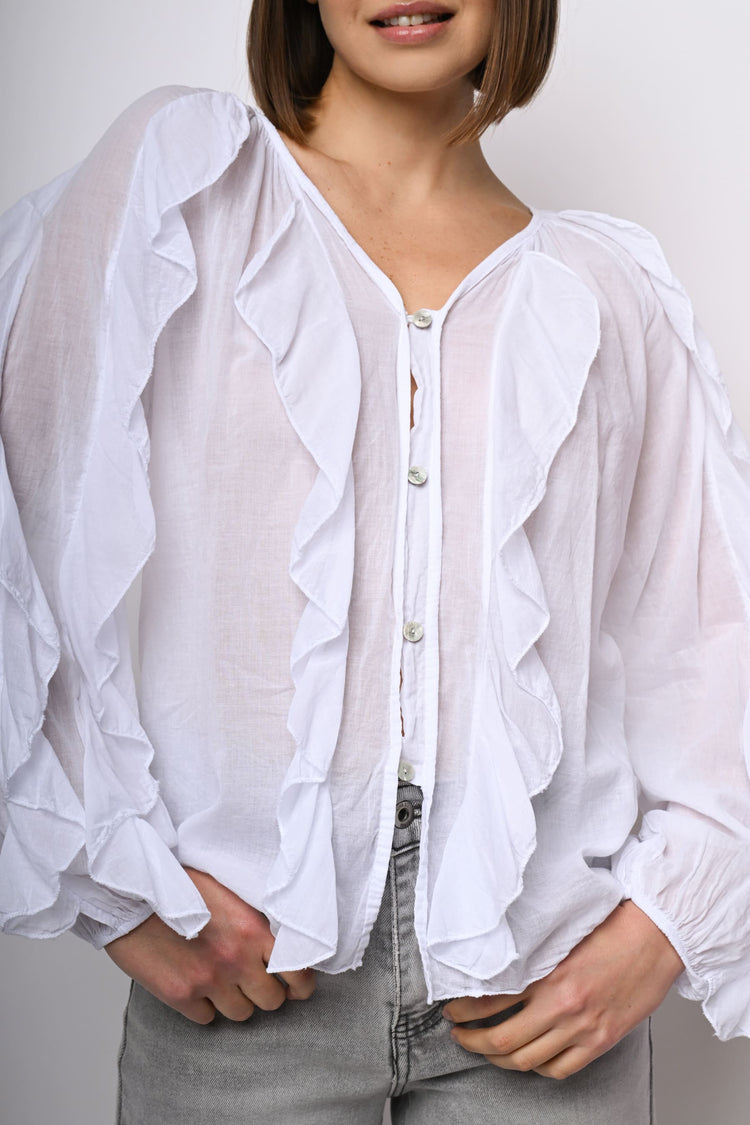 Camicia in mussola di cotone bianco con scollo a V, abbottonatura frontale, volants sul davanti e lungo le ampie maniche a palloncino, polsini elasticizzati e orlo stondato.
