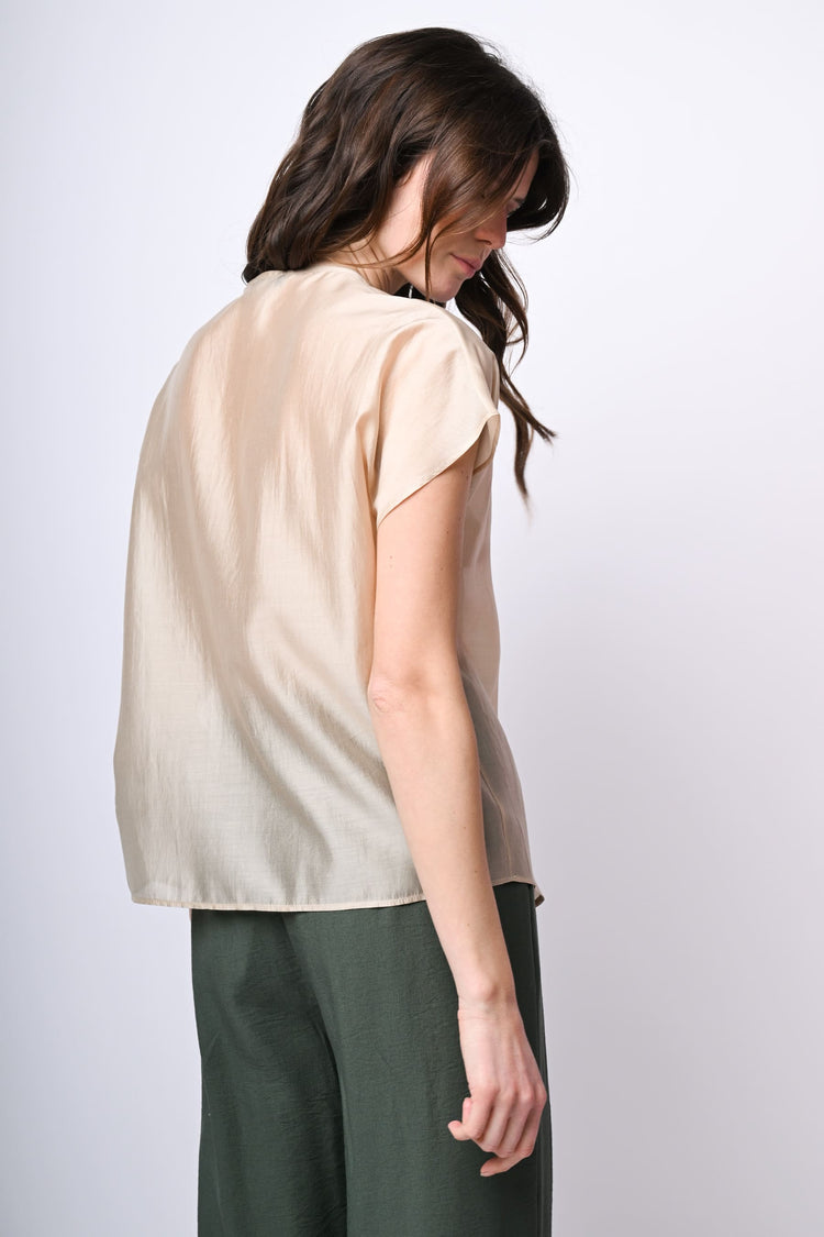 Blusa in mussola misto lyocell avorio con scollo a V, piega centrale, maniche ad aletta e orlo stondato.