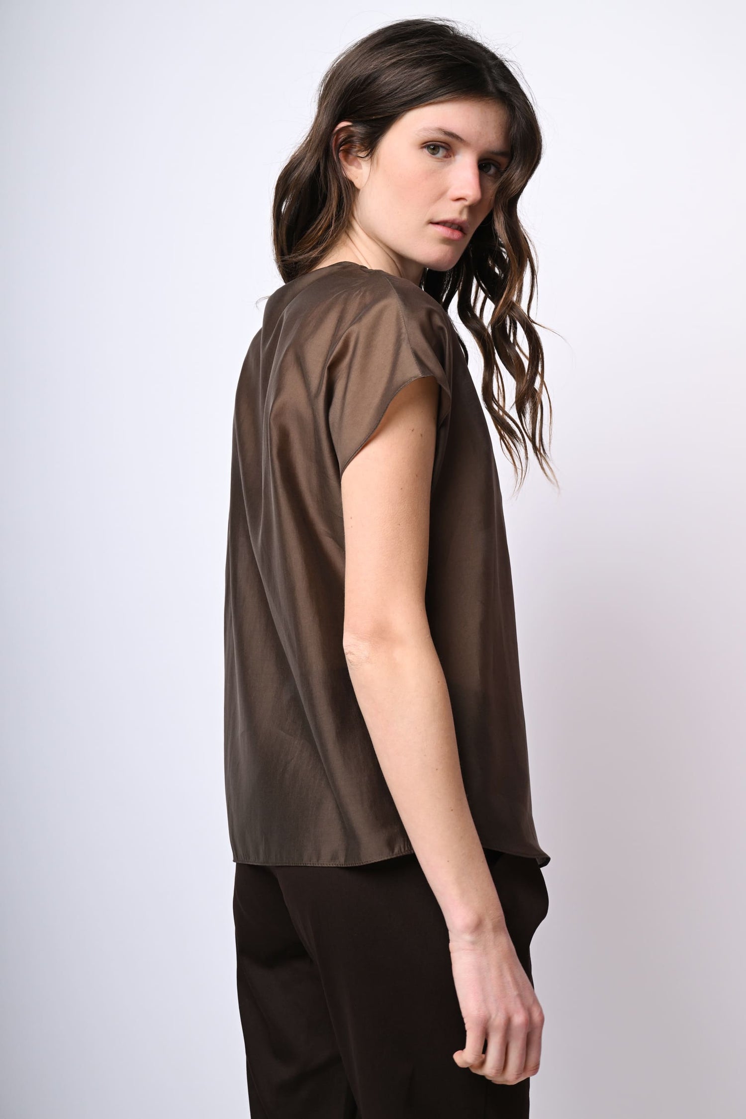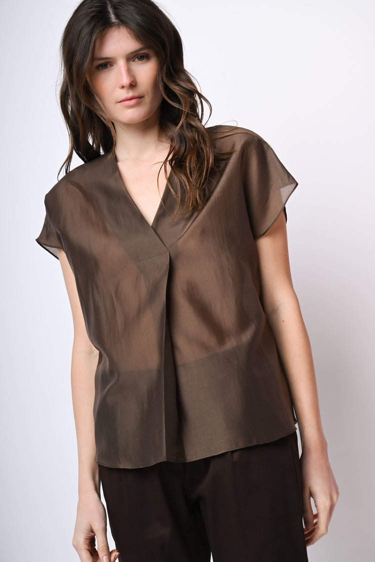 Blusa in mussola misto lyocell marrone con scollo a V, piega centrale, maniche ad aletta e orlo stondato.