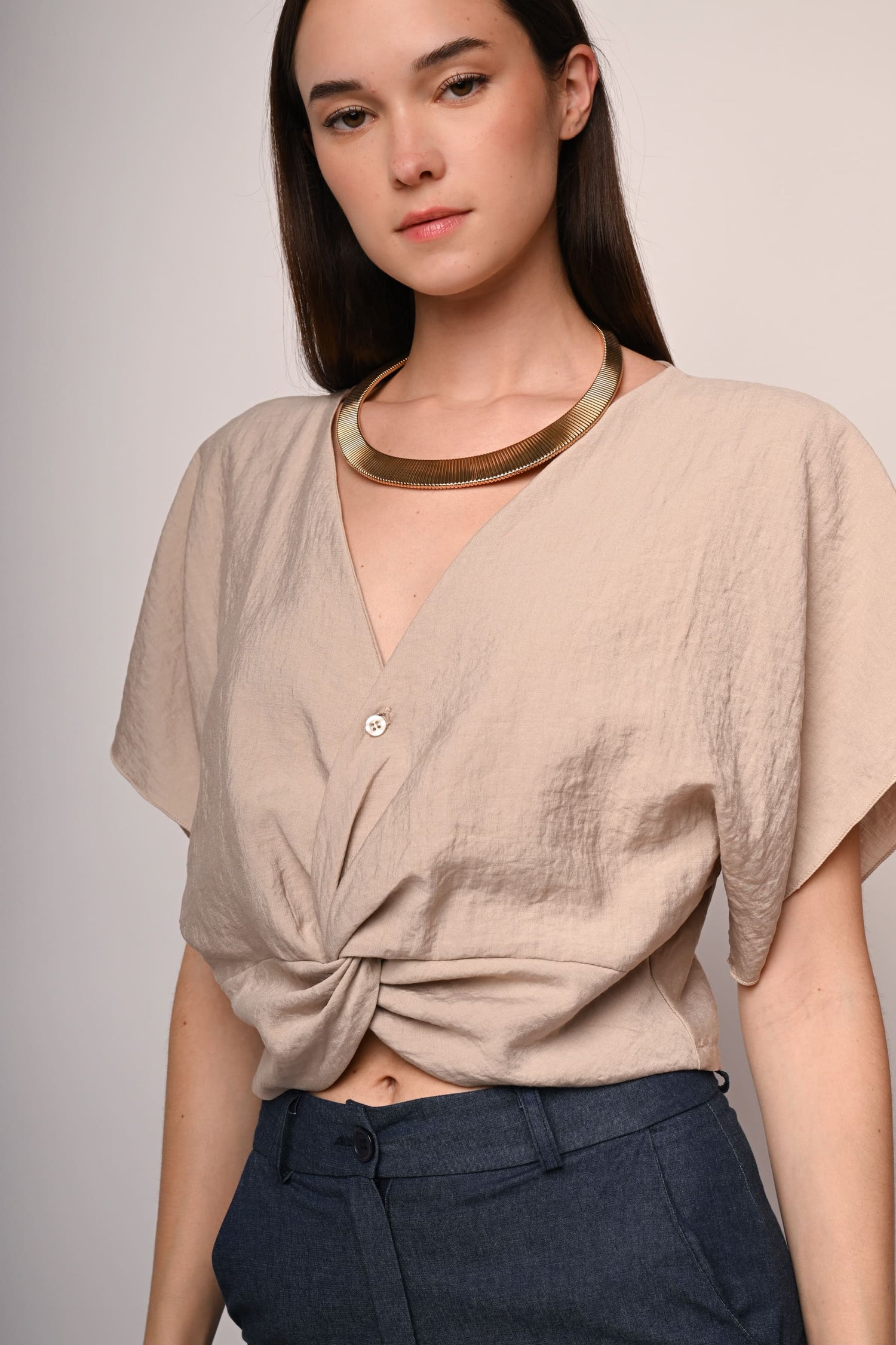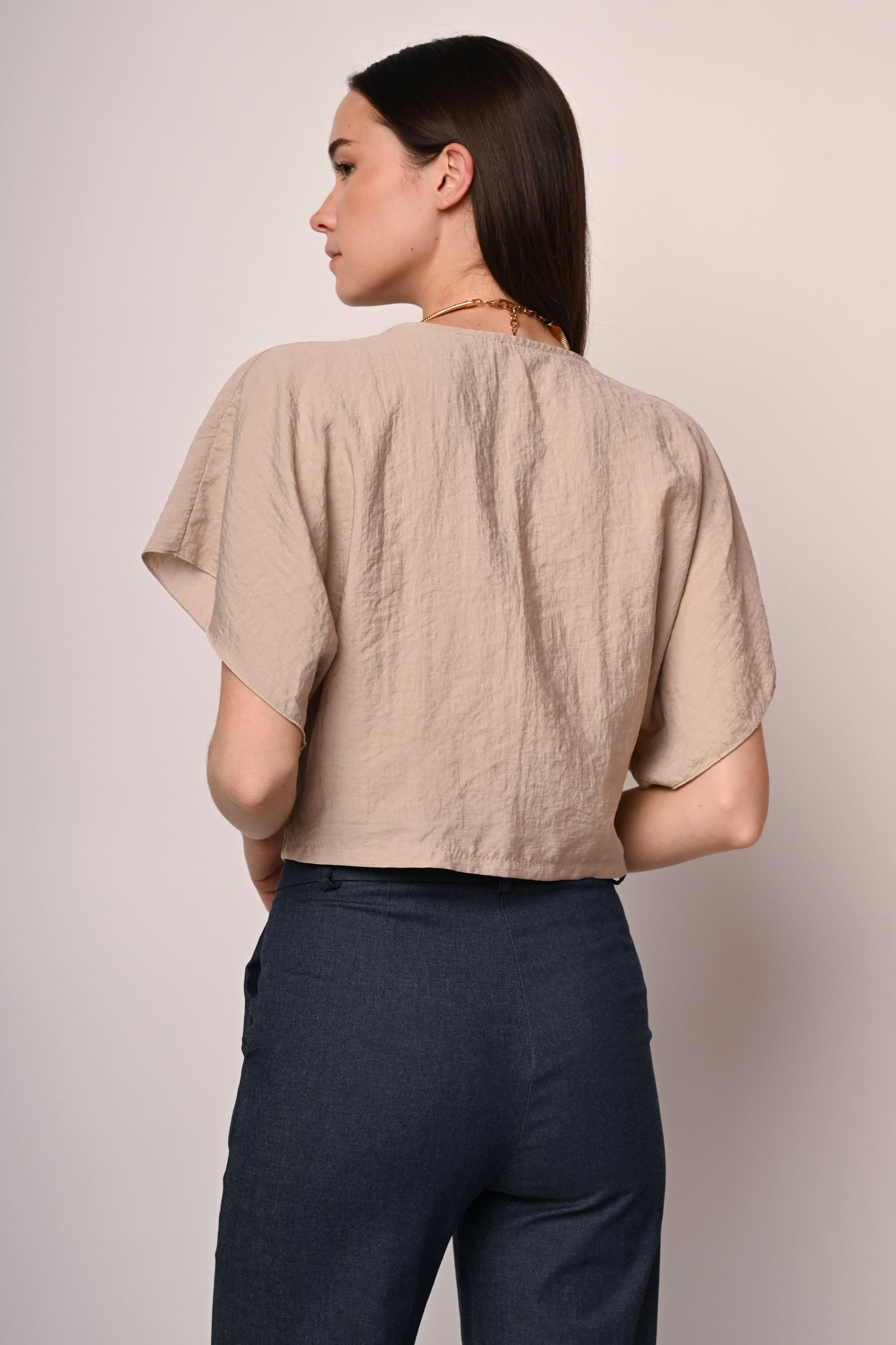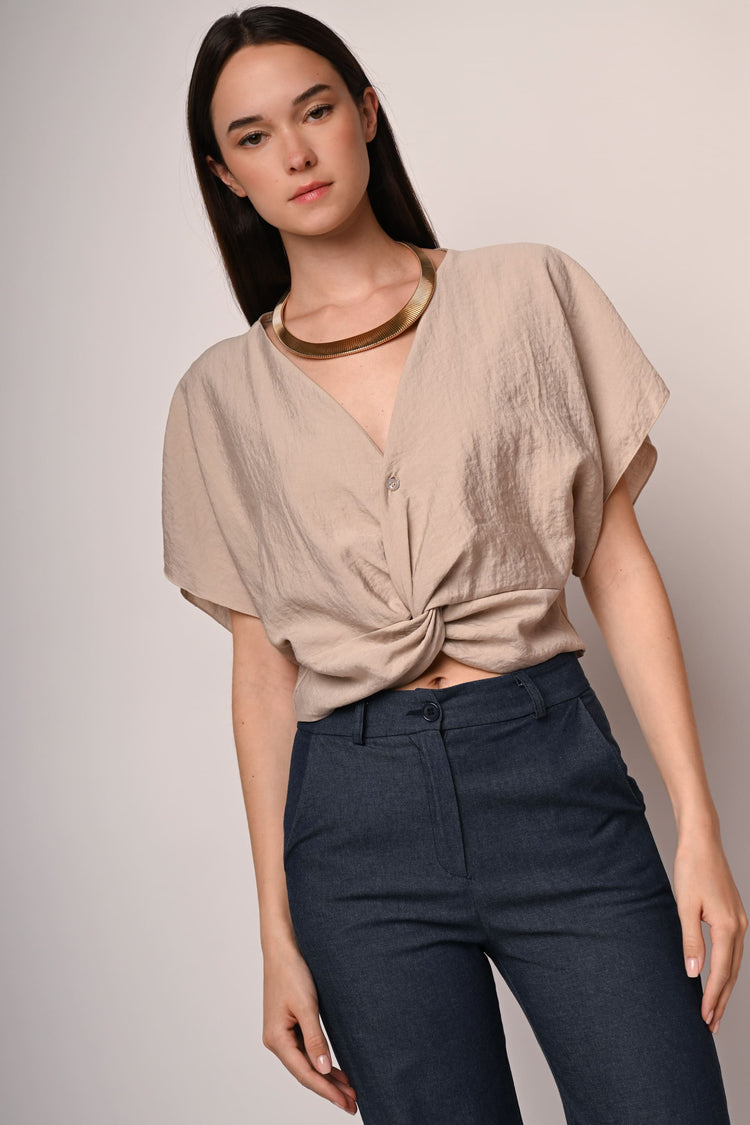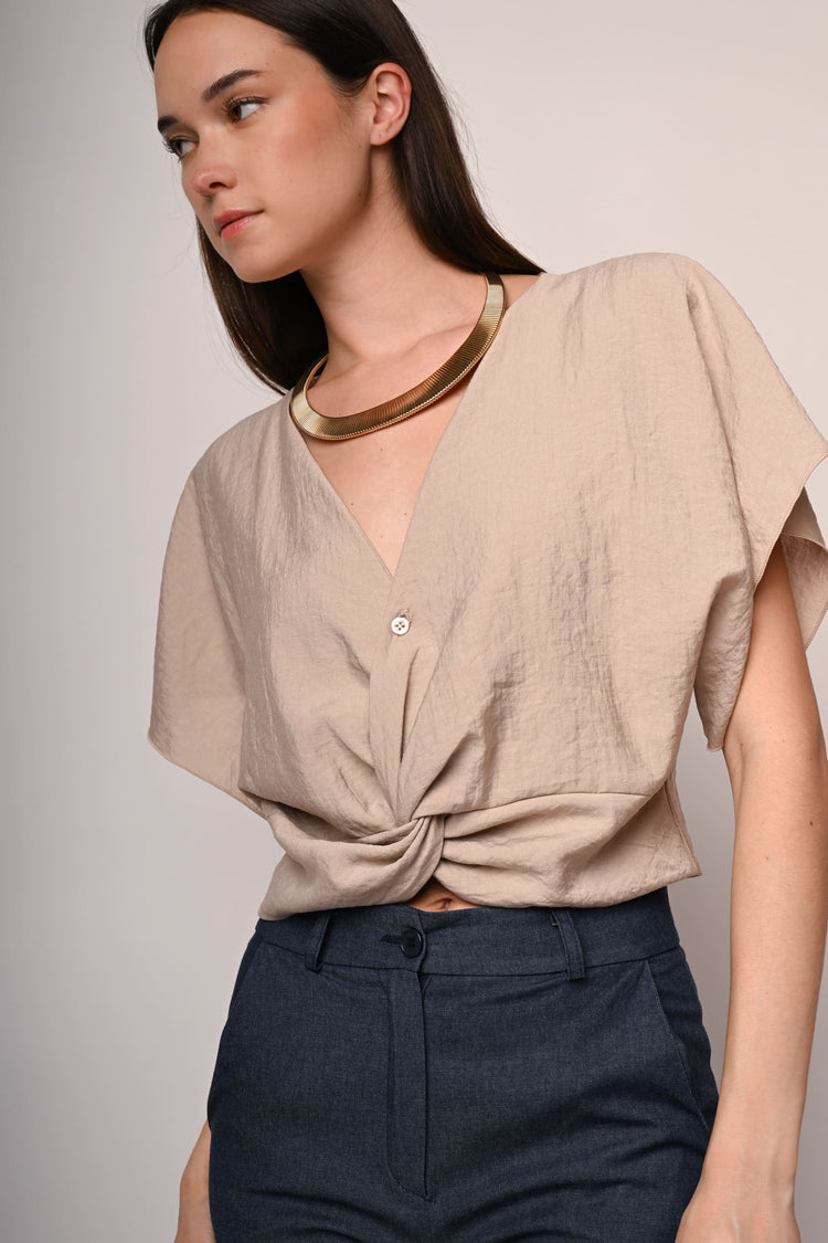 Blusa misto viscosa beige con scollo a V, abbottonatura frontale, incrocio drappeggiato all'orlo sul davanti e maniche corte a kimono.