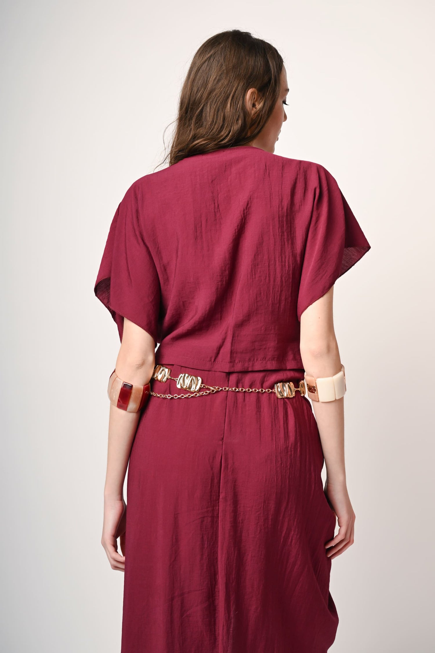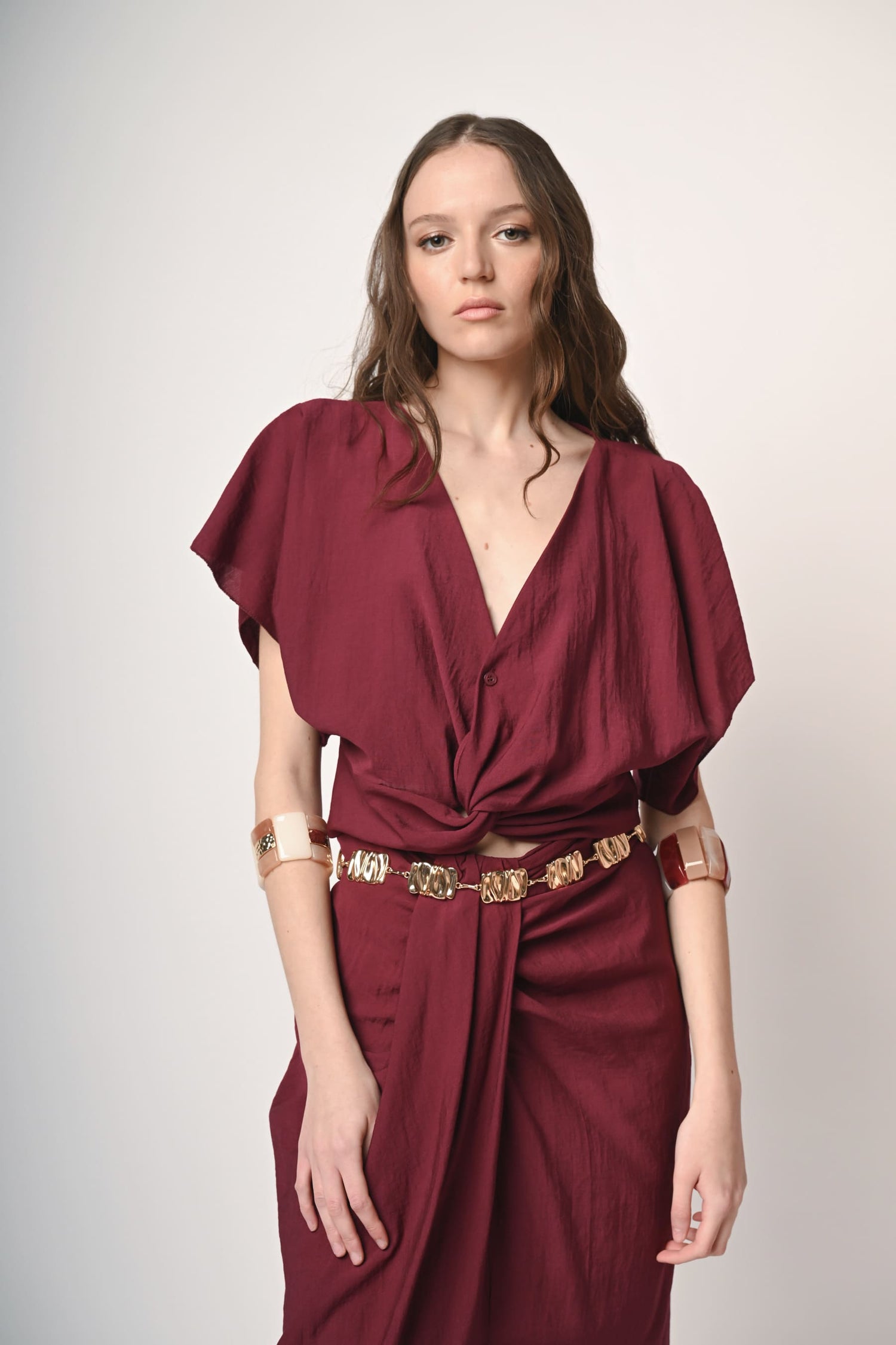 Blusa misto viscosa rosso vino con scollo a V, abbottonatura frontale, incrocio drappeggiato allorlo sul davanti e maniche corte a kimono.