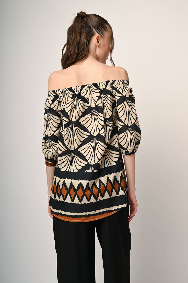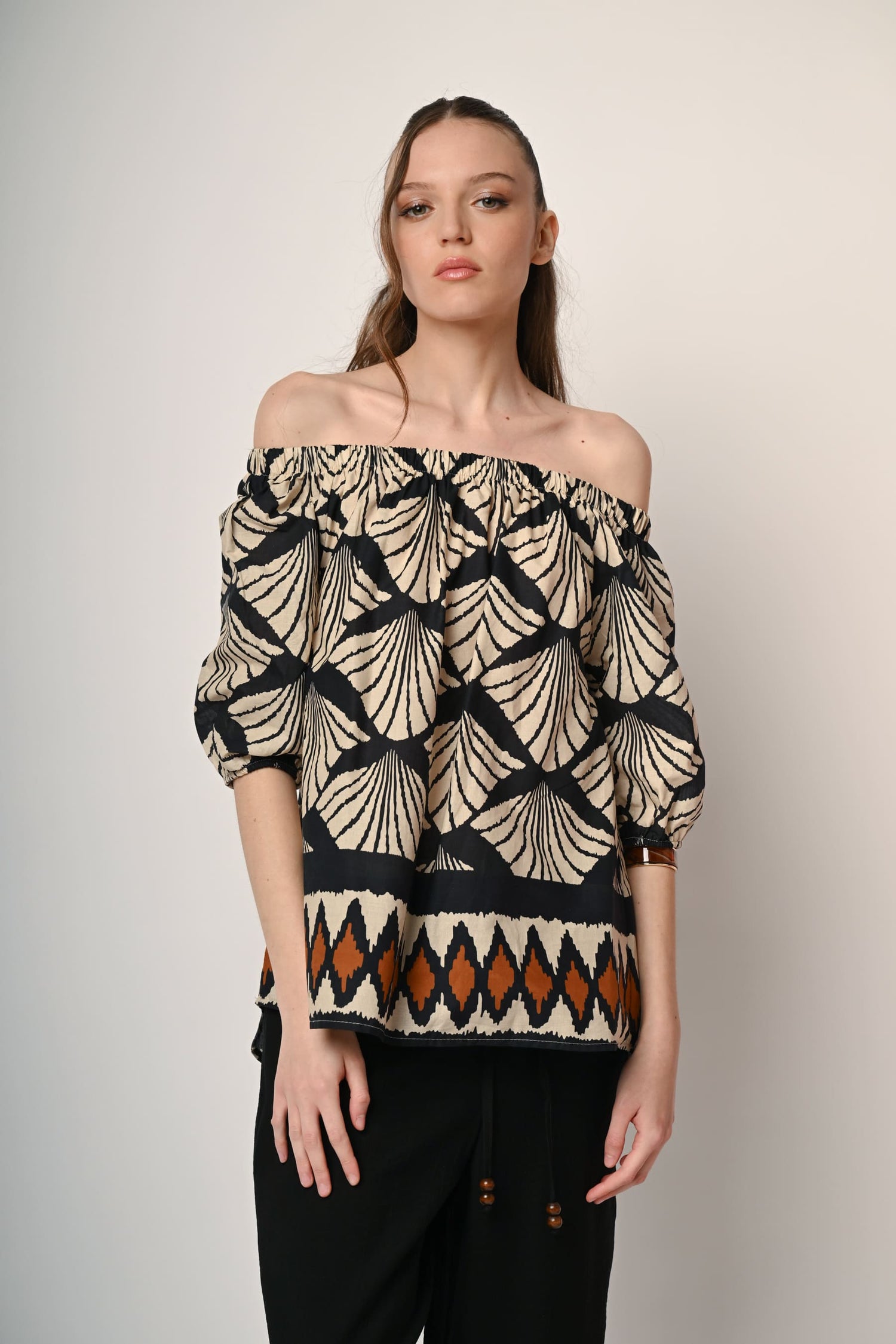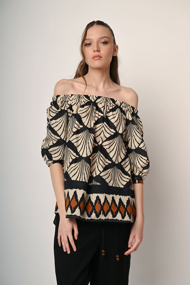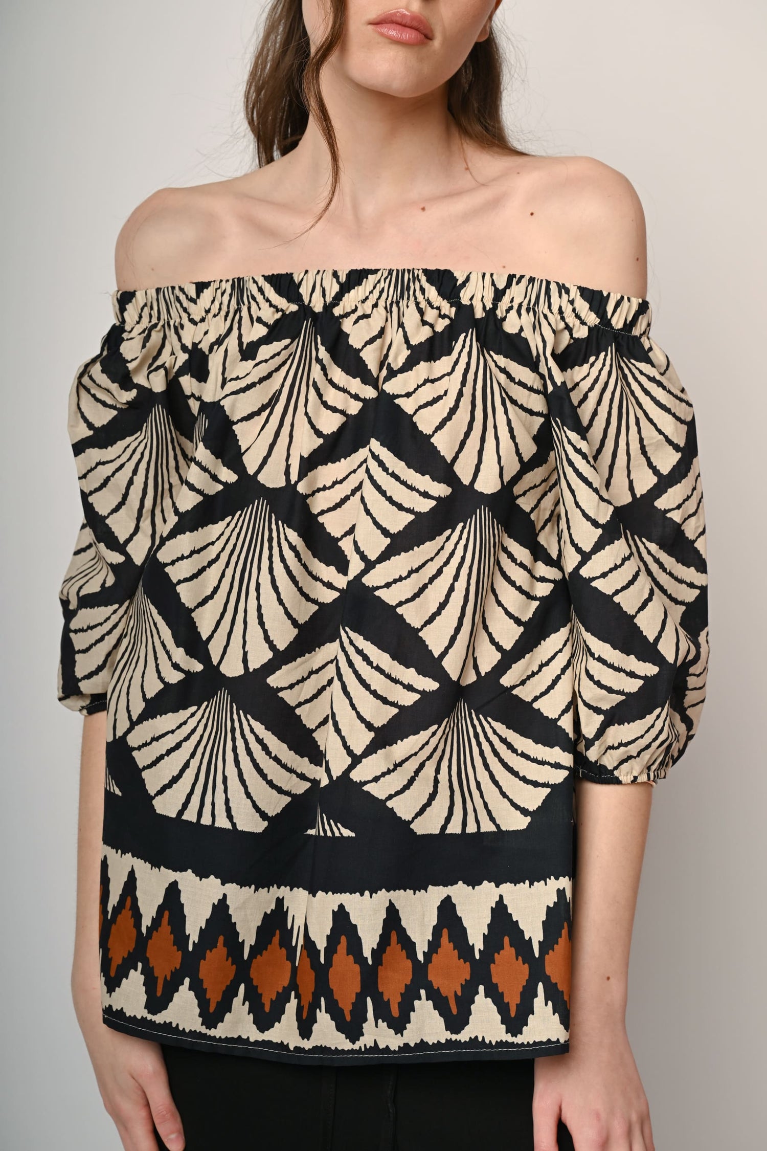 Blusa in cotone con stampa etnica nei toni del nero e beige, spalle scoperte, scollo elasticizzato, maniche crop e orlo leggermente stondato sul retro.