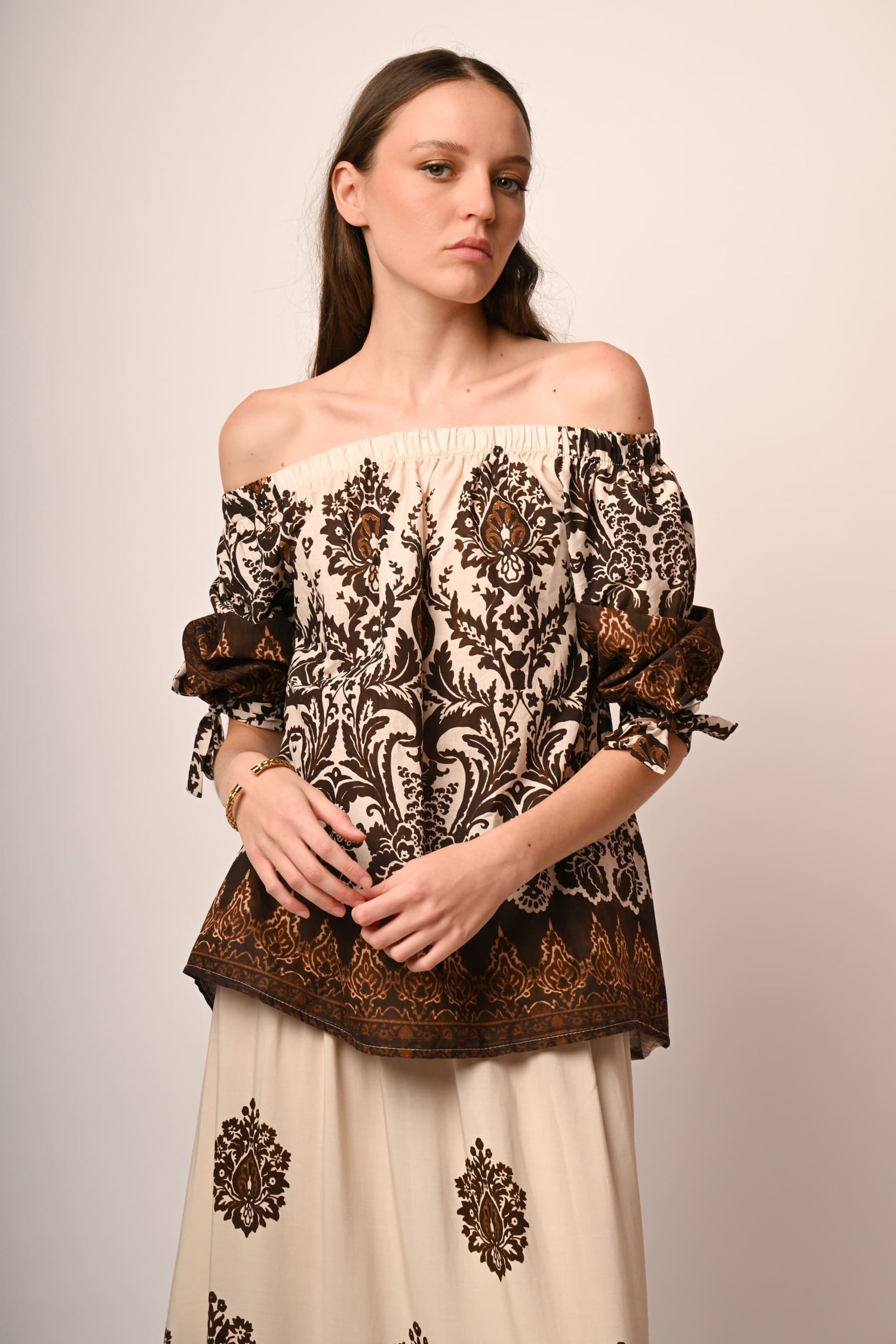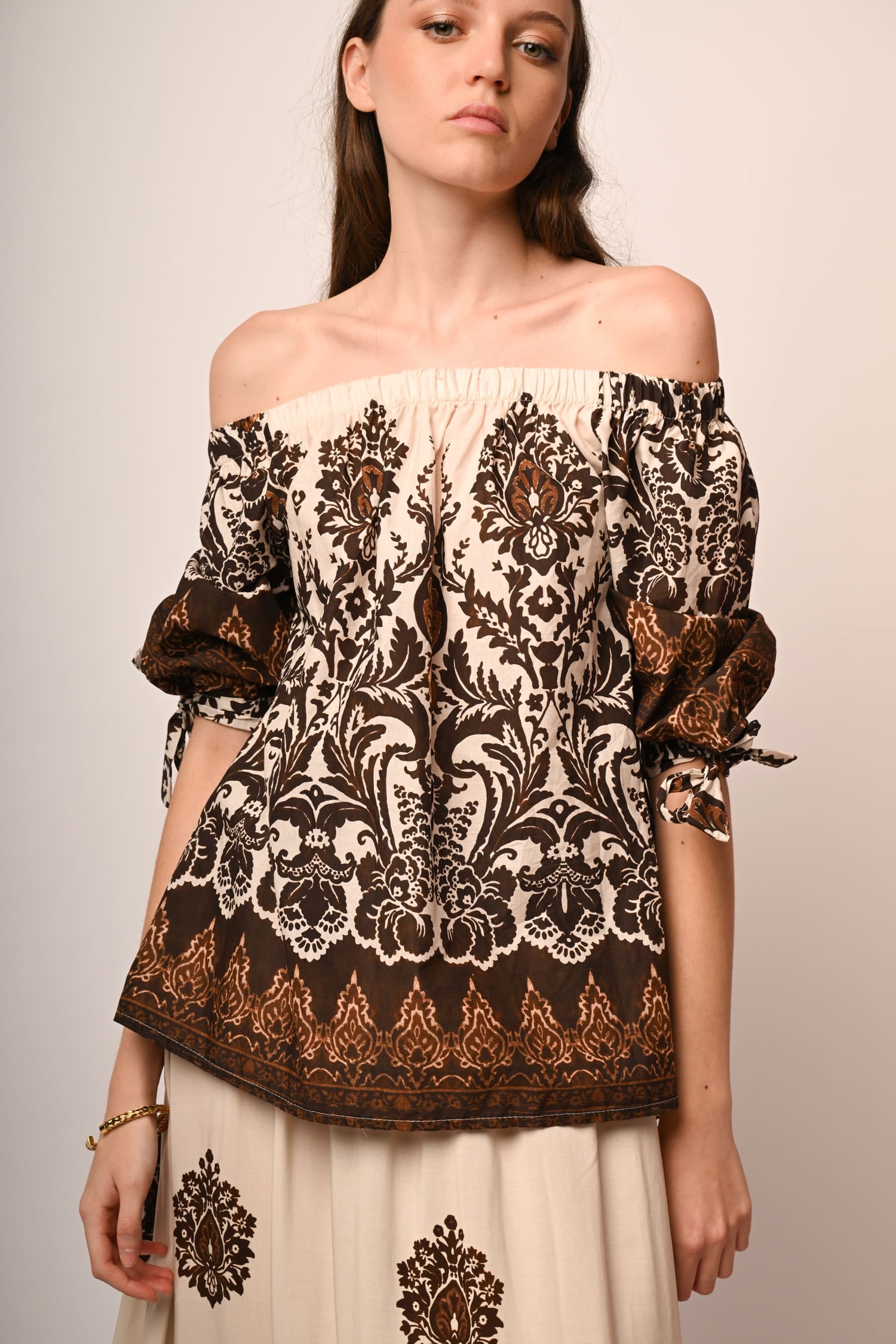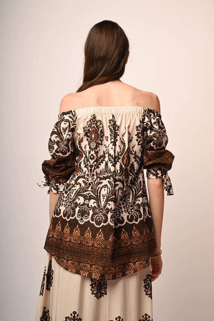 Blusa in cotone con stampa etnica nei toni del marrone su fondo beige, spalle scoperte, scollo dritto elasticizzato, maniche crop con fiocchi da annodare e orlo stondato sul retro.