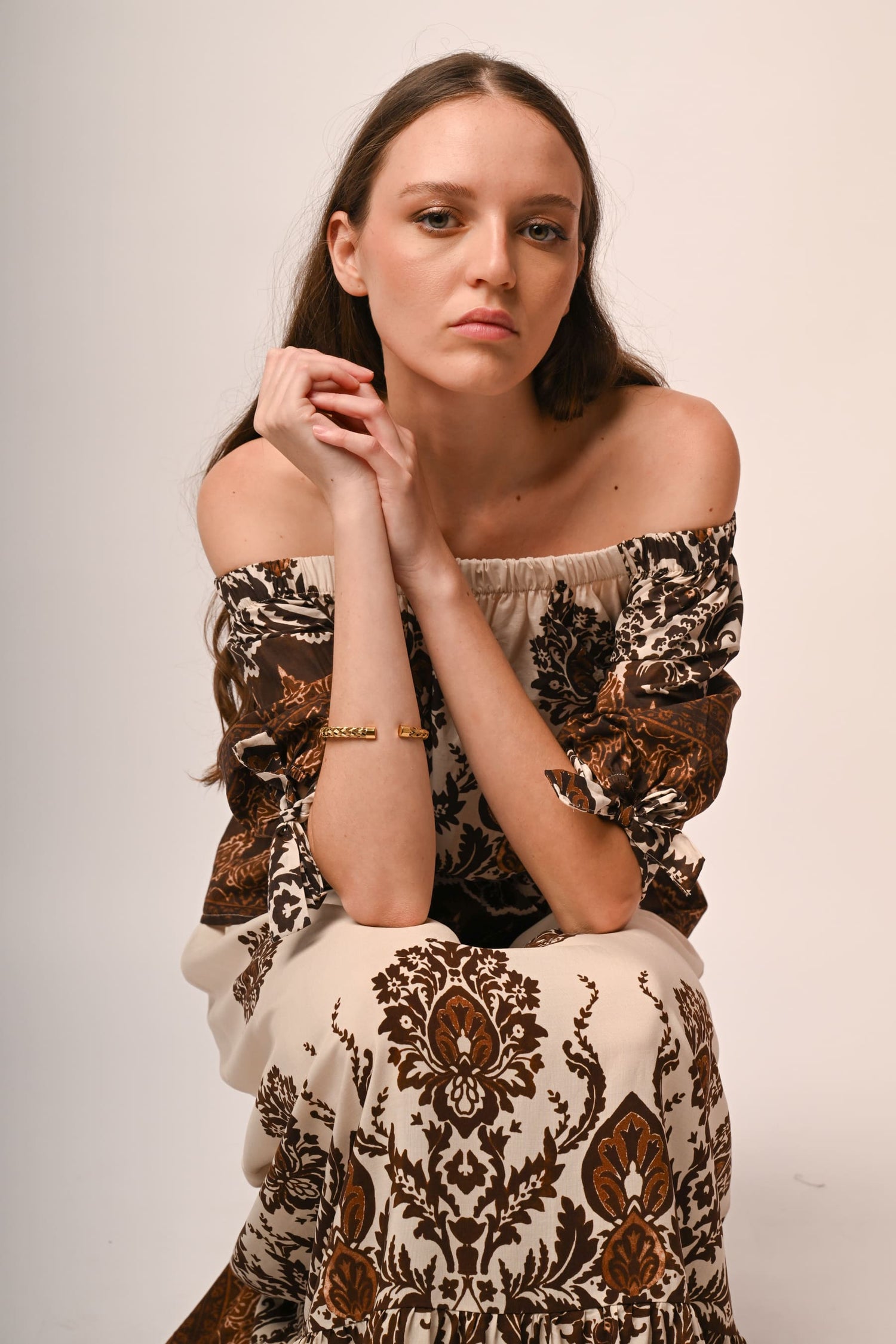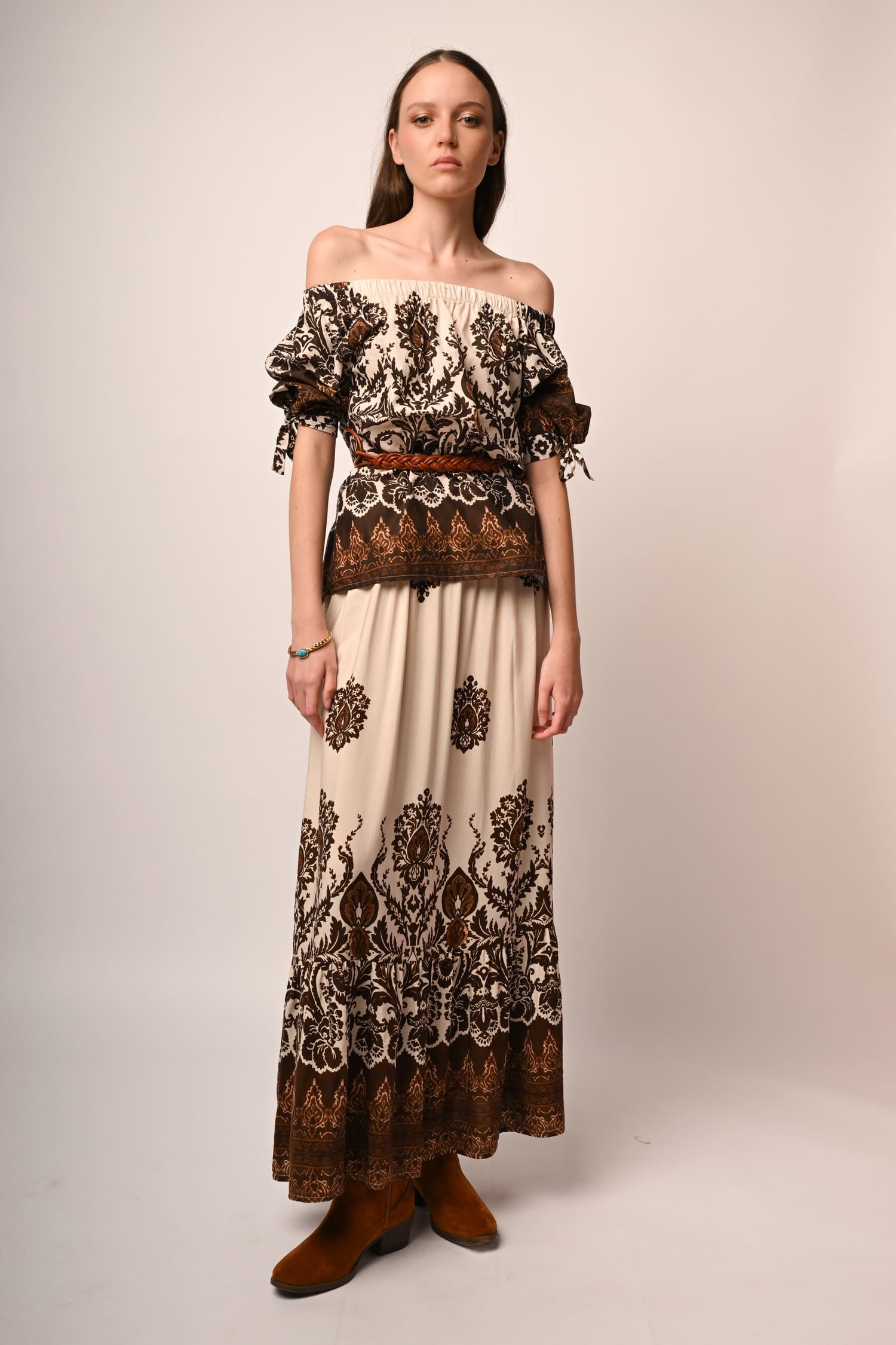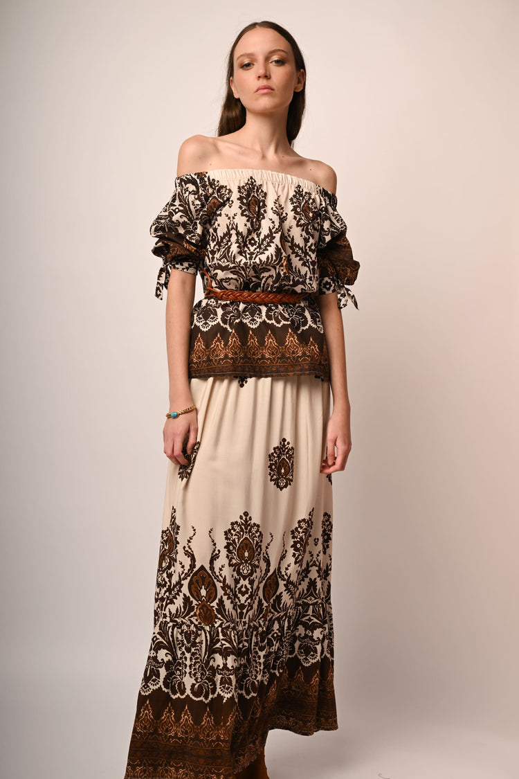 Blusa in cotone con stampa etnica nei toni del marrone su fondo beige, spalle scoperte, scollo dritto elasticizzato, maniche crop con fiocchi da annodare e orlo stondato sul retro.