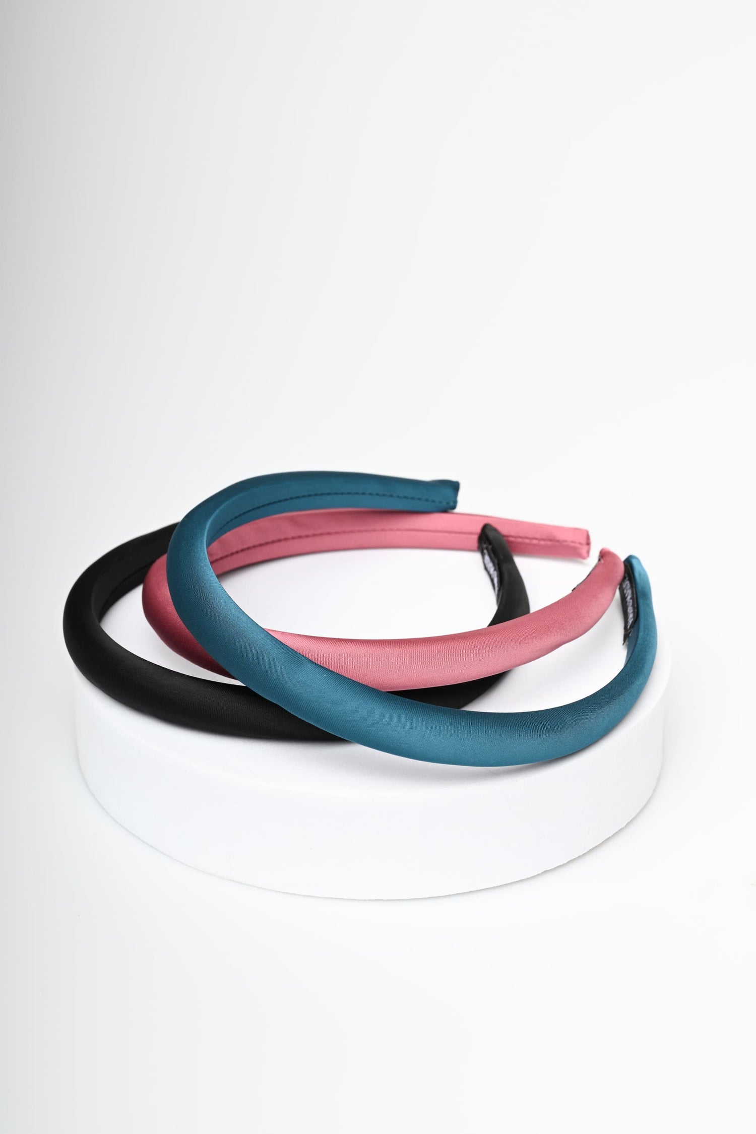 Set di tre cerchietti sottili in raso, uno blu, uno rosa e uno nero.