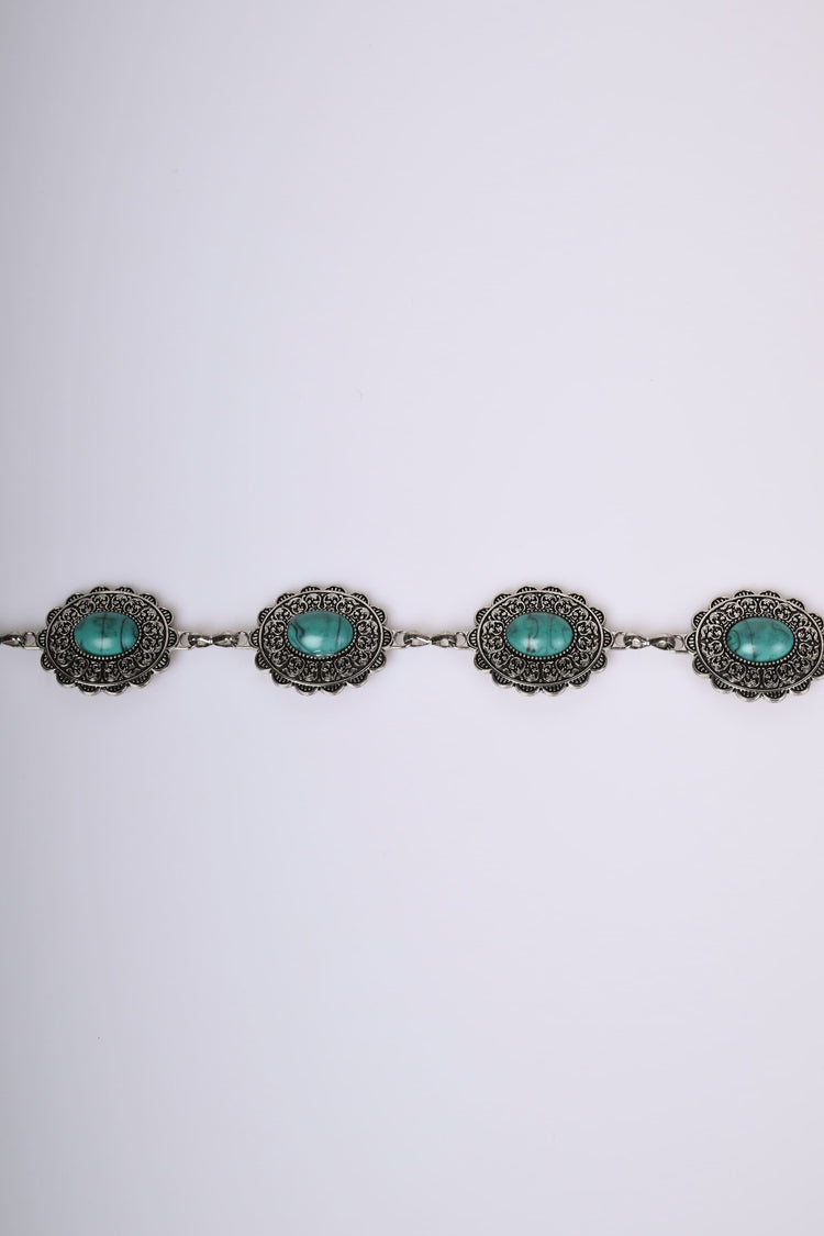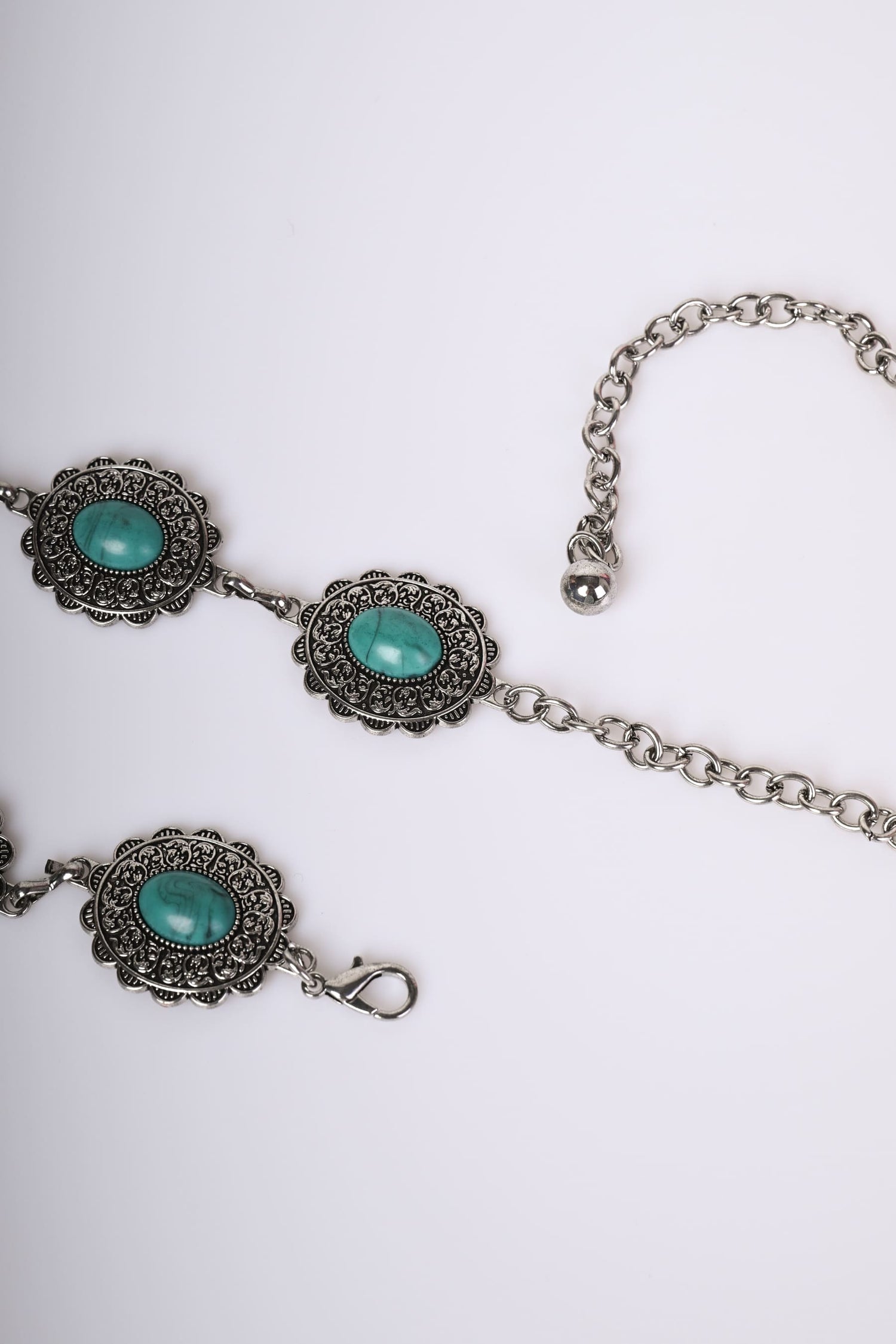 Cintura gioiello a catenella in metallo argentato con decorazioni ovali impreziosite da pietre effetto turchesi e gancetto regolabile di chiusura.
