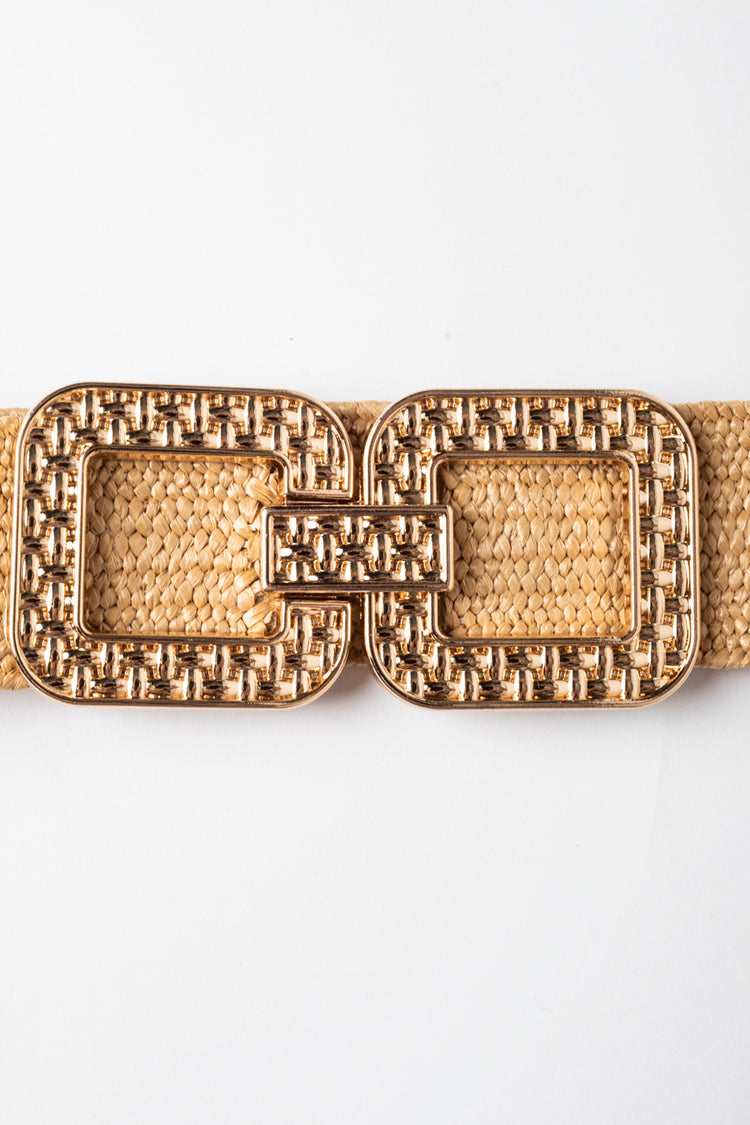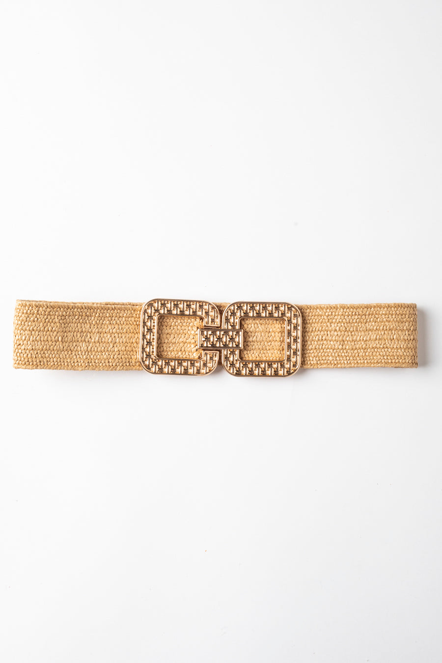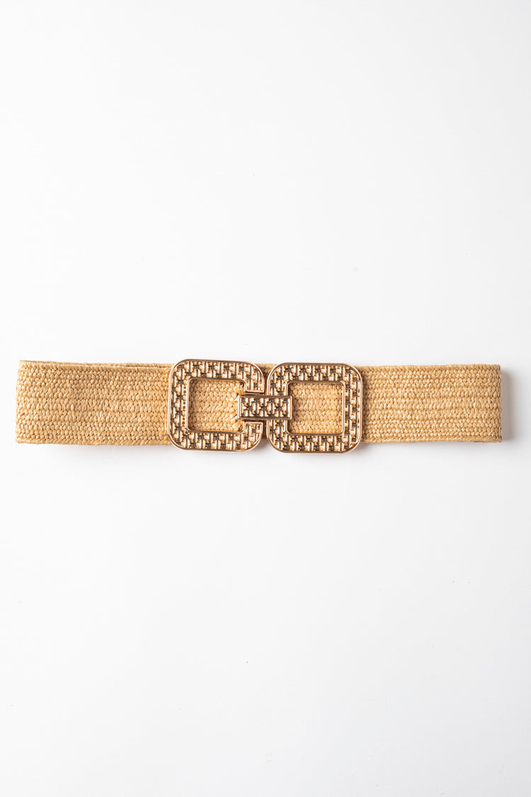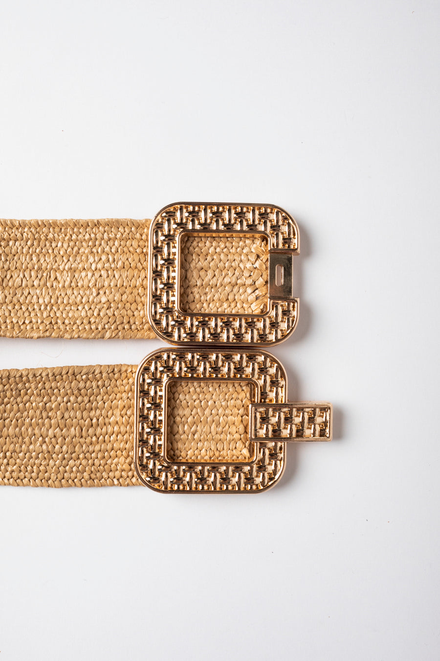 Cintura effetto rafia beige con doppia fibbia squadrata in metallo dorato.