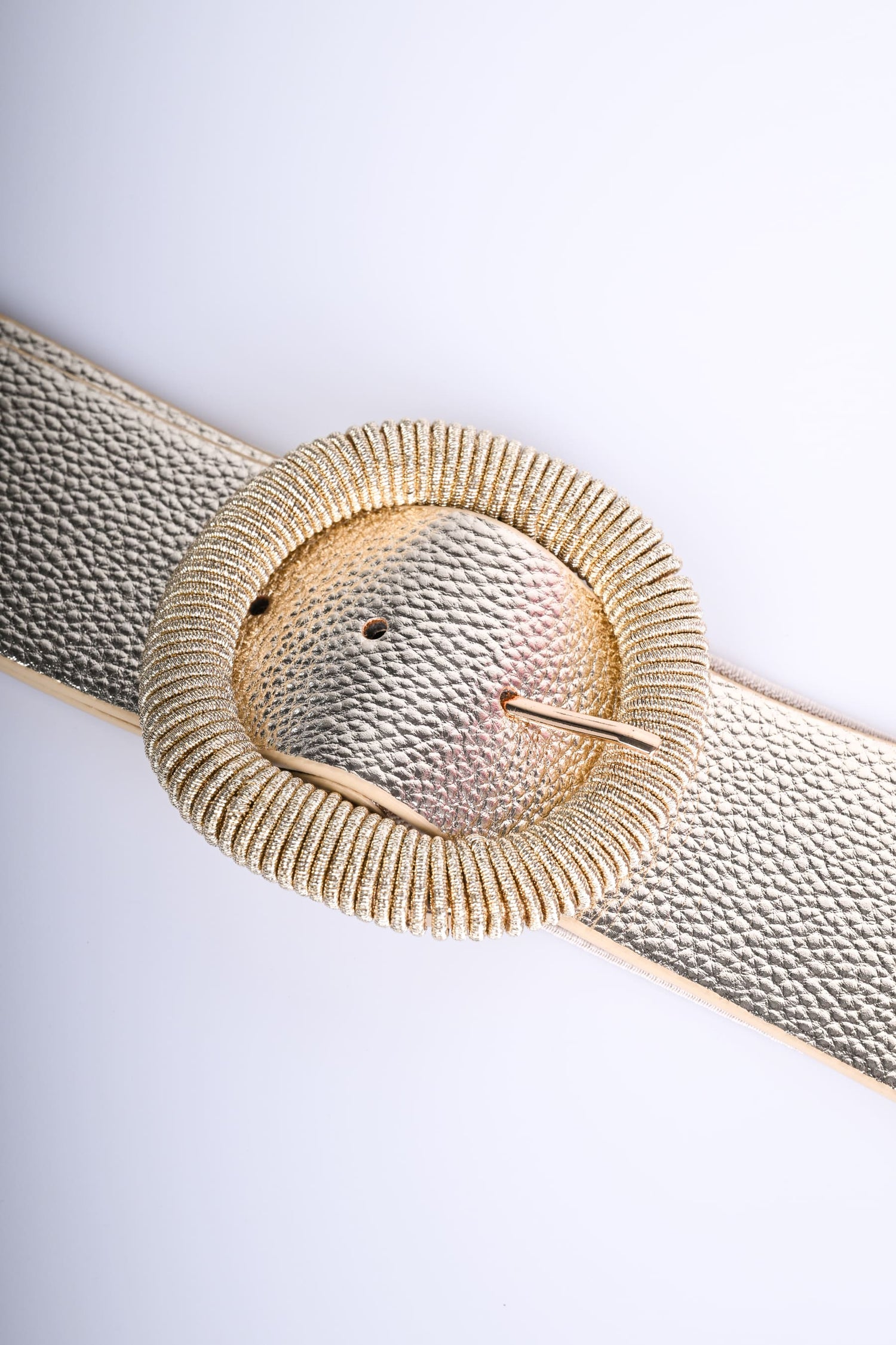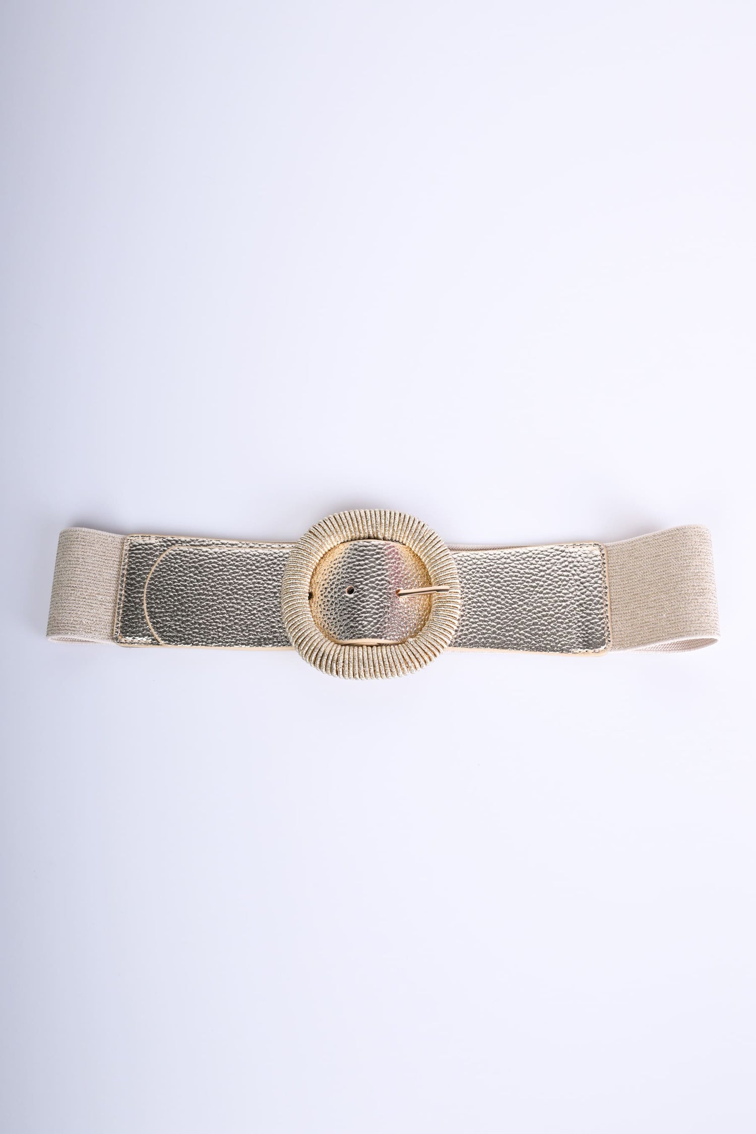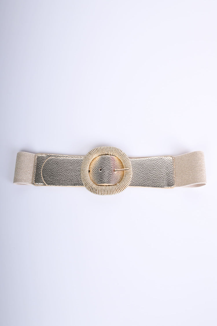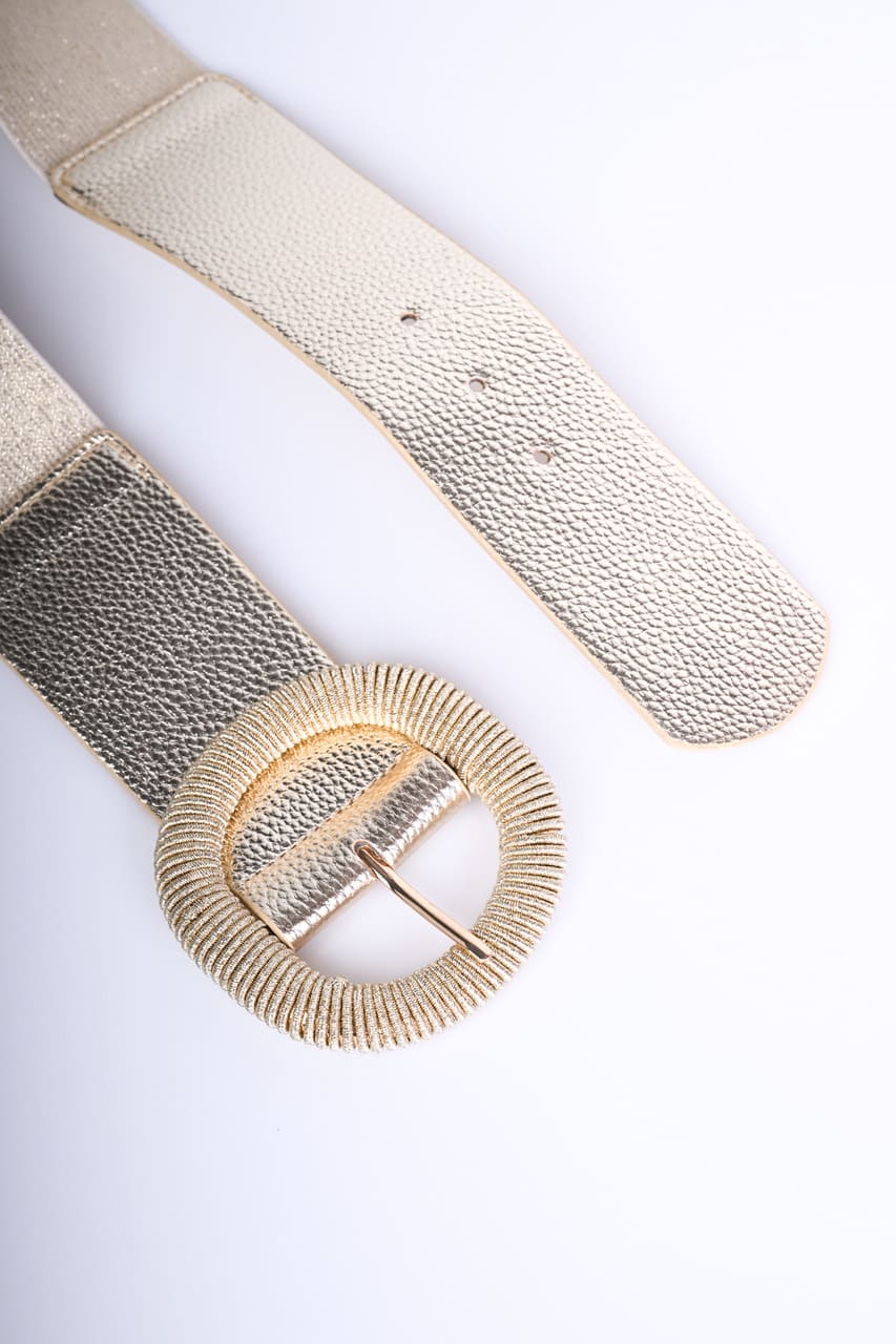 Cintura alta in tessuto elasticizzato lurex e similpelle dorata con fibbia arrotondata testurizzata in metallo dorato.