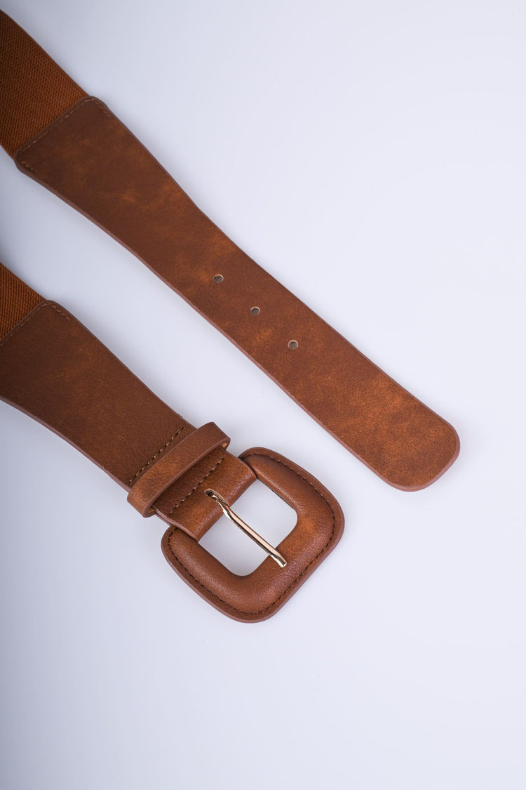Cintura basic in similpelle e tessuto elasticizzato color cuoio con fibbia squadrata ricoperta e hardware in metallo dorato.