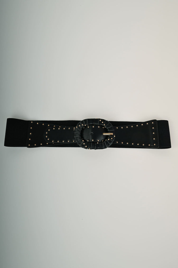 Cintura in tessuto elasticizzato e similpelle nera con mini borchie decorative in metallo dorato lungo i bordi e fibbia ovale.