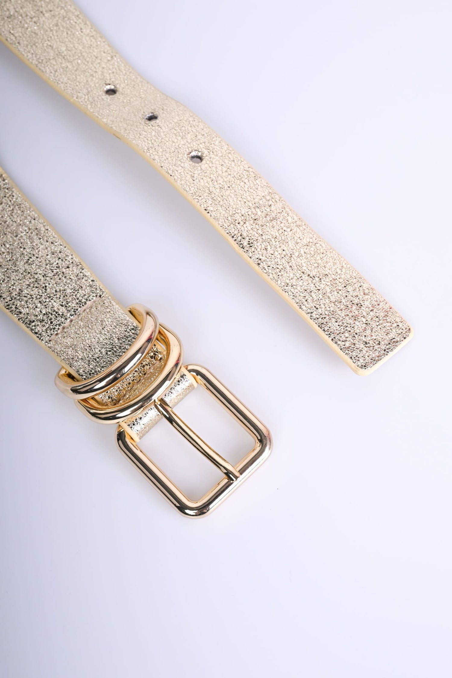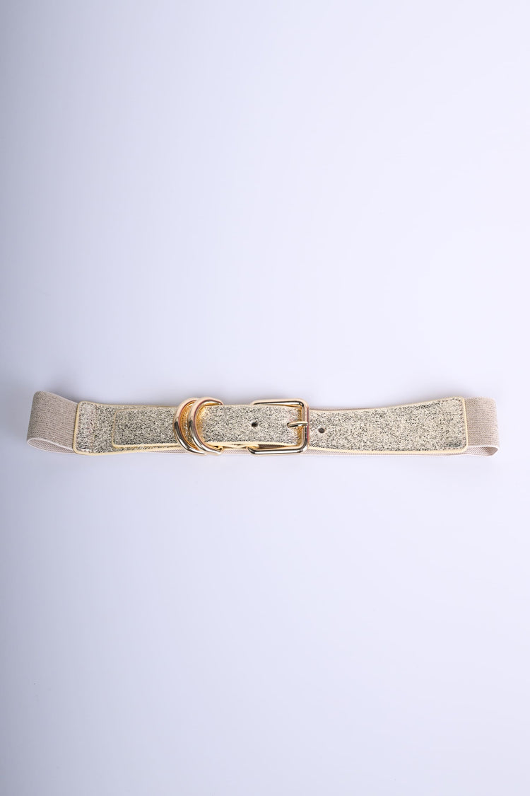 Cintura in tessuto elasticizzato e similpelle dorata con fibbia rettangolare e doppi anelli in metallo dorato.