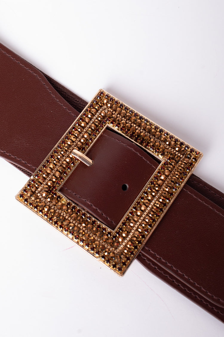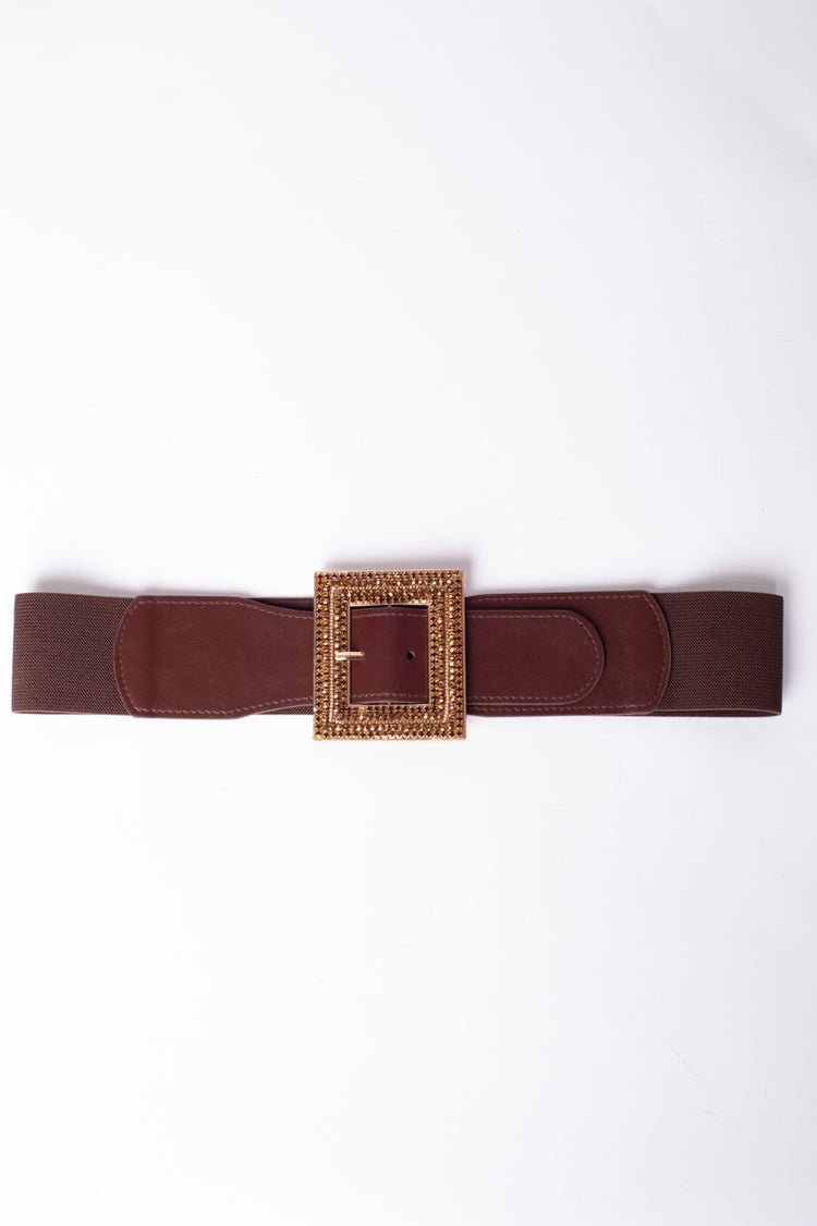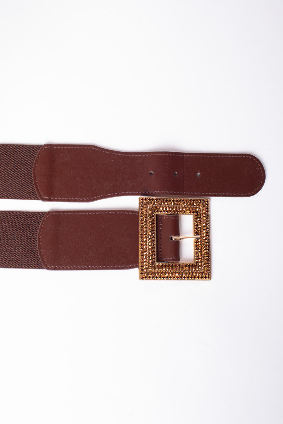 Cintura in tessuto stretch e similpelle color cuoio con fibbia squadrata in metallo dorato con strass.