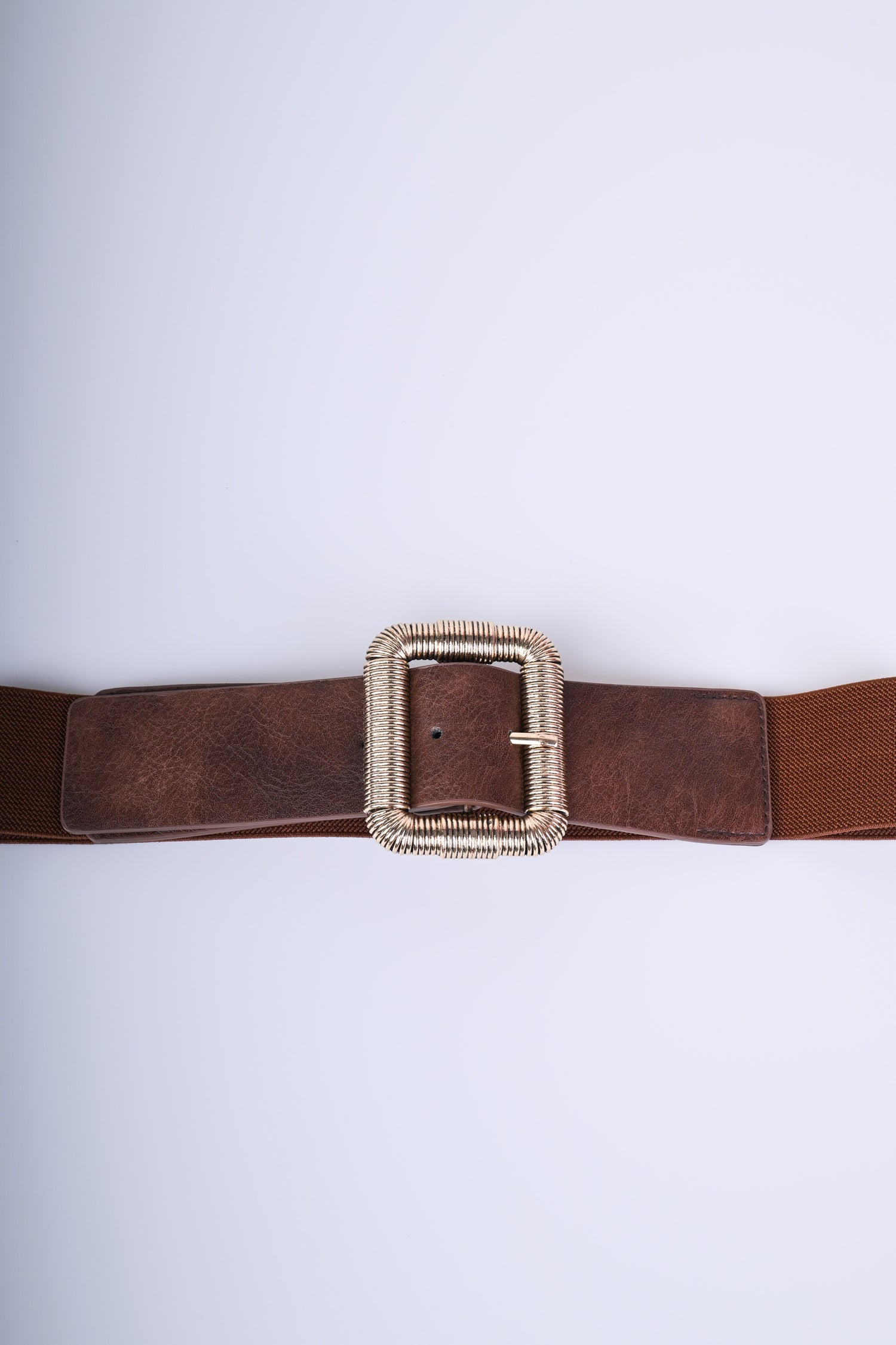 Cintura in similpelle e tessuto elasticizzato marrone con fibbia rettangolare in maglia metallica dorata.