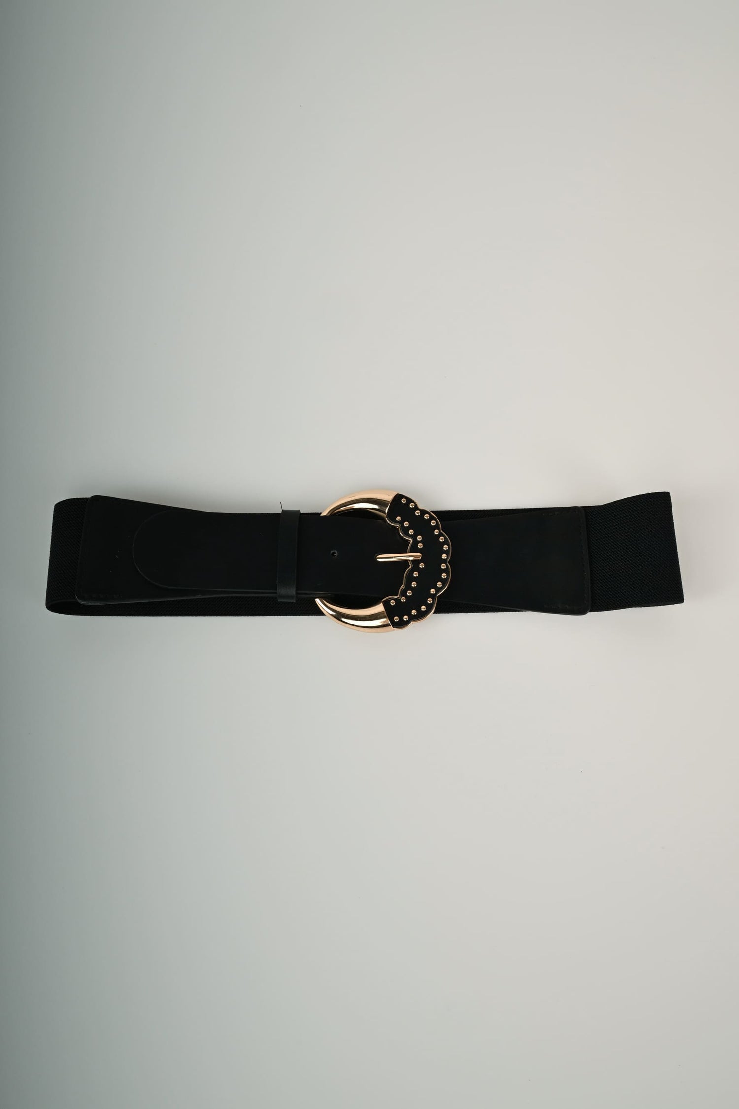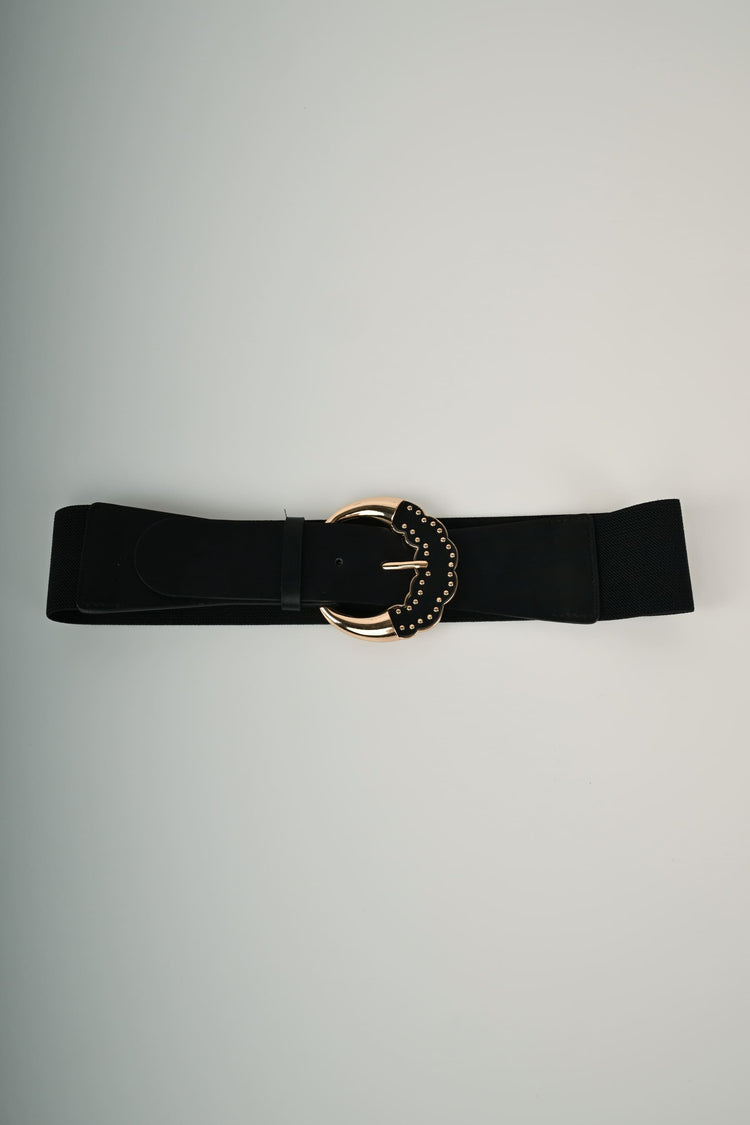 Cintura in tessuto elasticizzato e similpelle nera con fibbia tonda in metallo dorato impreziosita da dettaglio in similpelle con mini borchie.